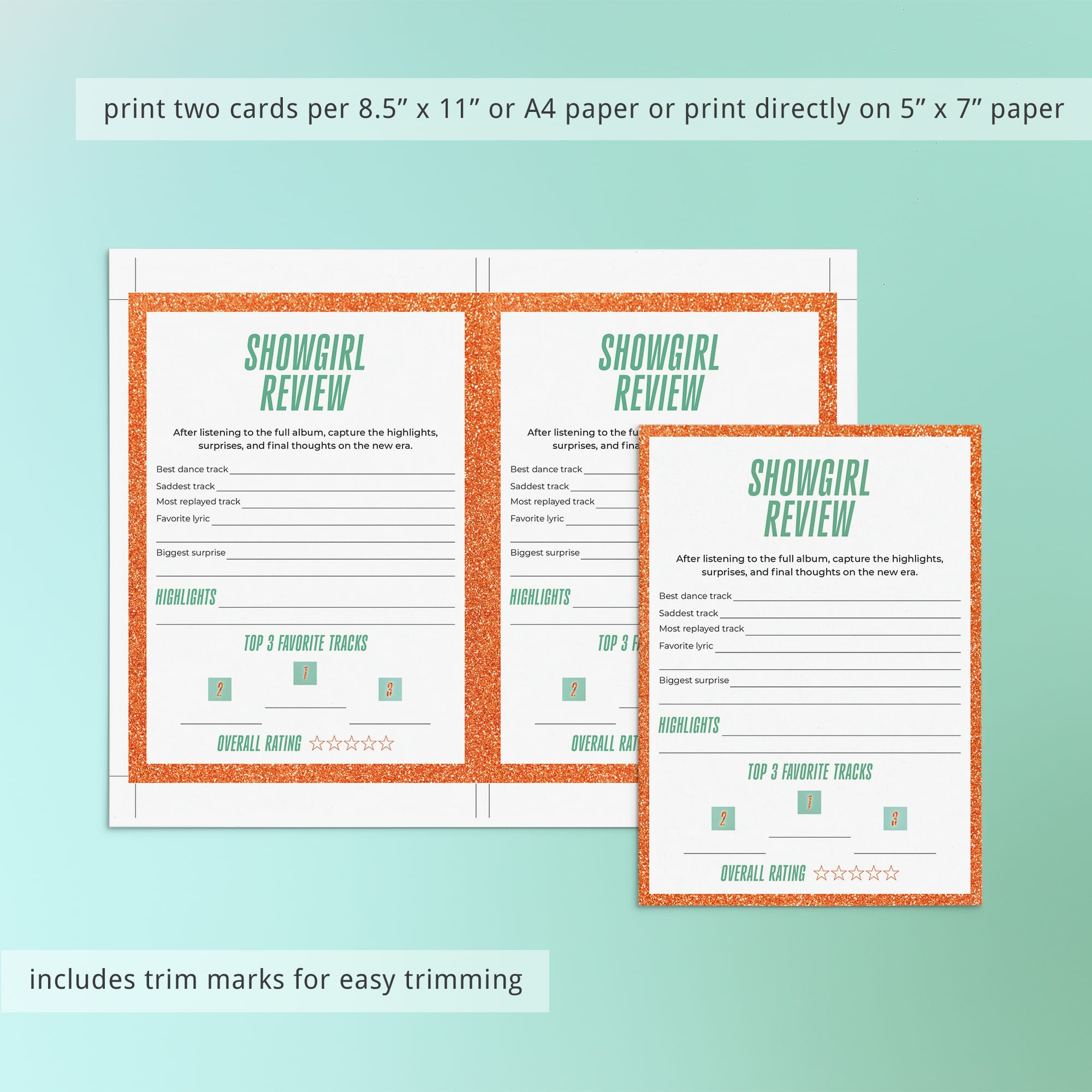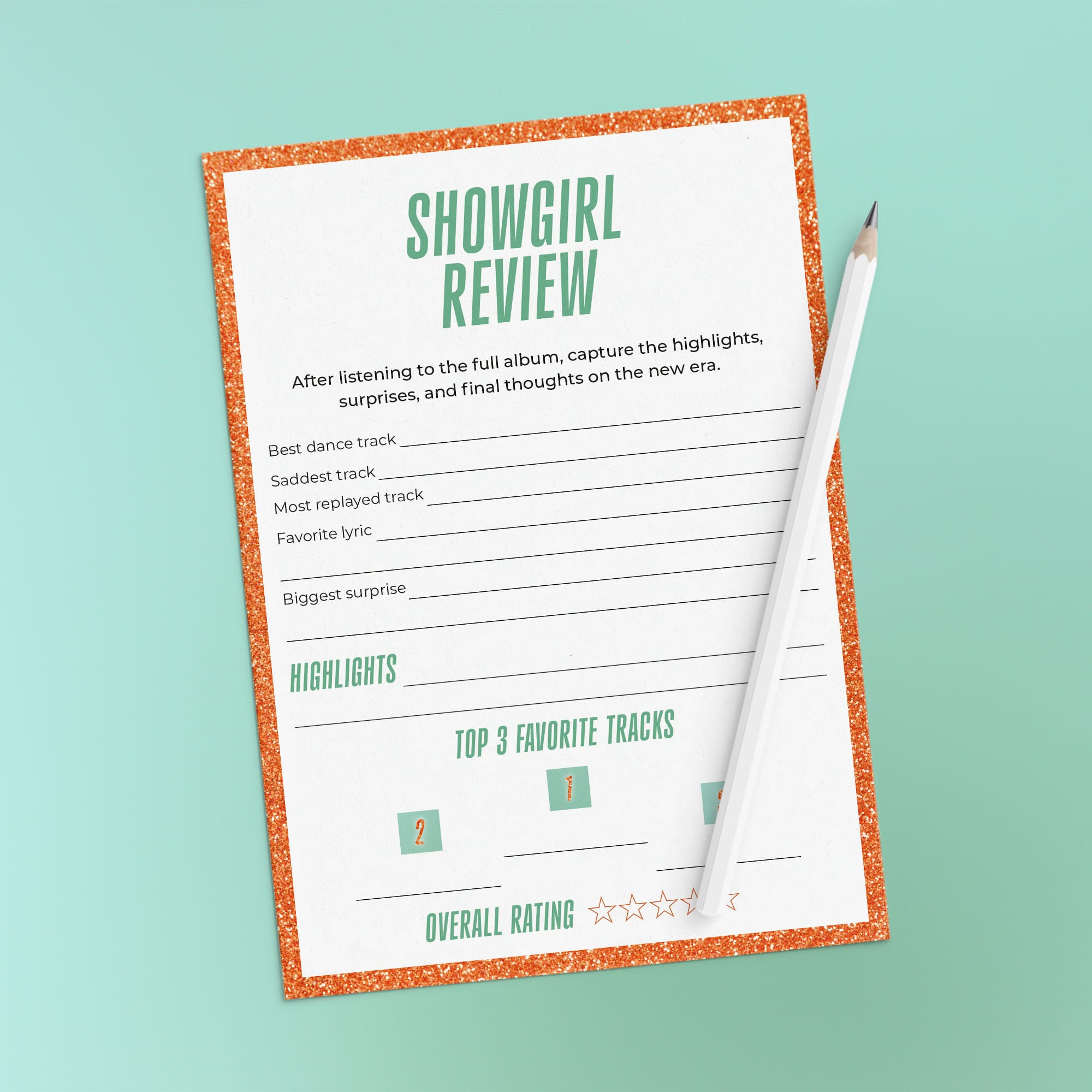 • Showgirl Review. Reflect on the whole album with a final review card and capture your overall thoughts, highlights, and standout moments.