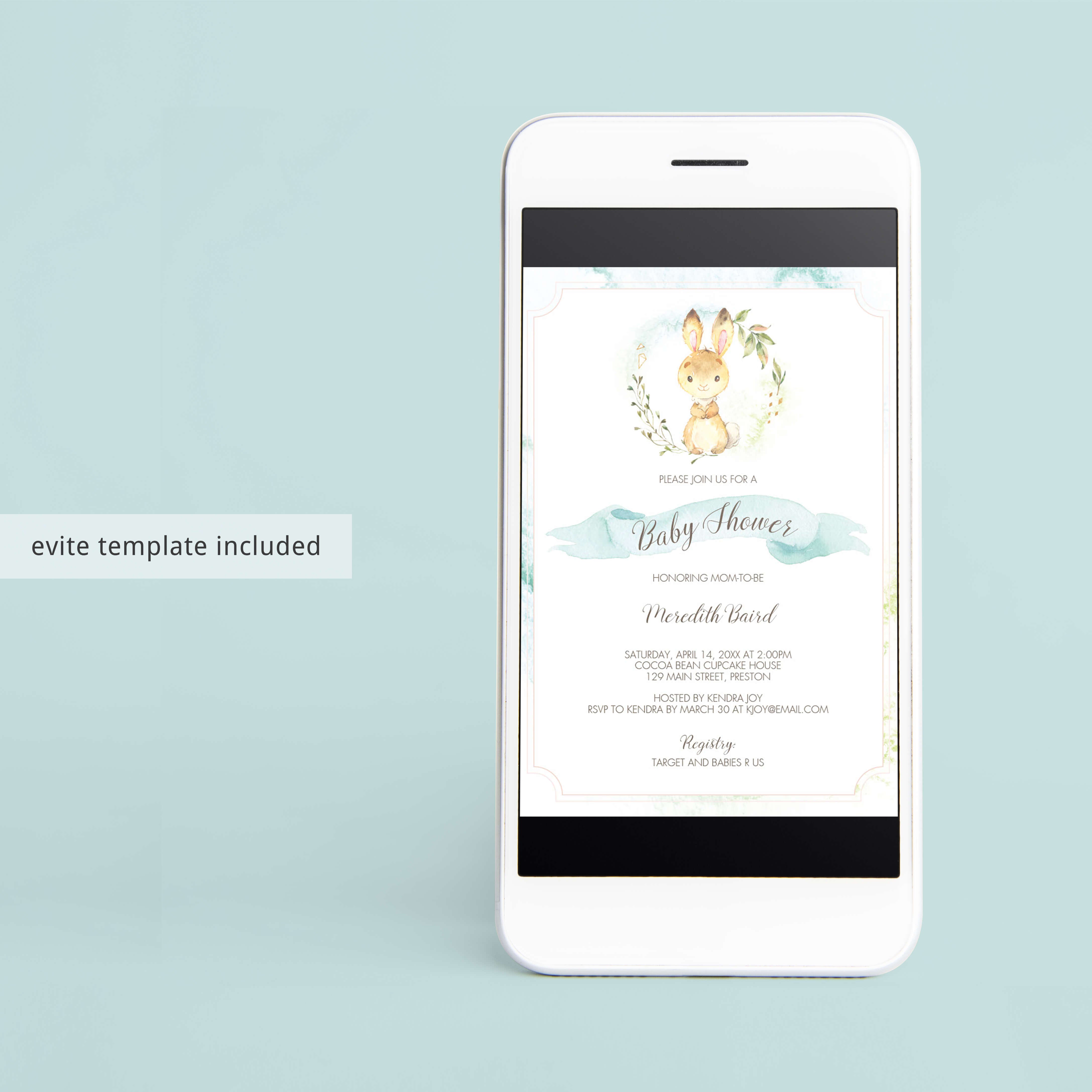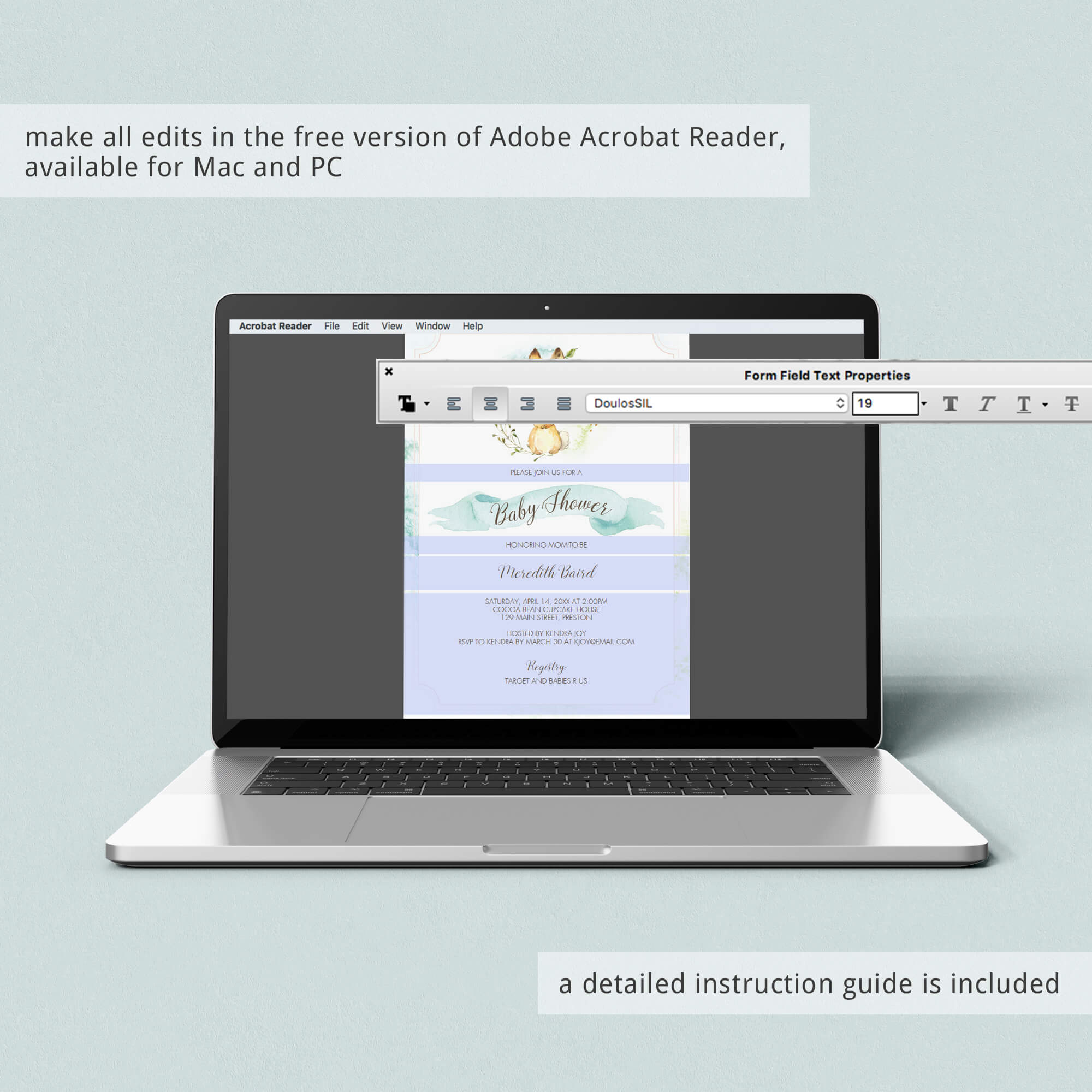 • 1 Editable PDF sized 5” x 7” to print or to use as evite