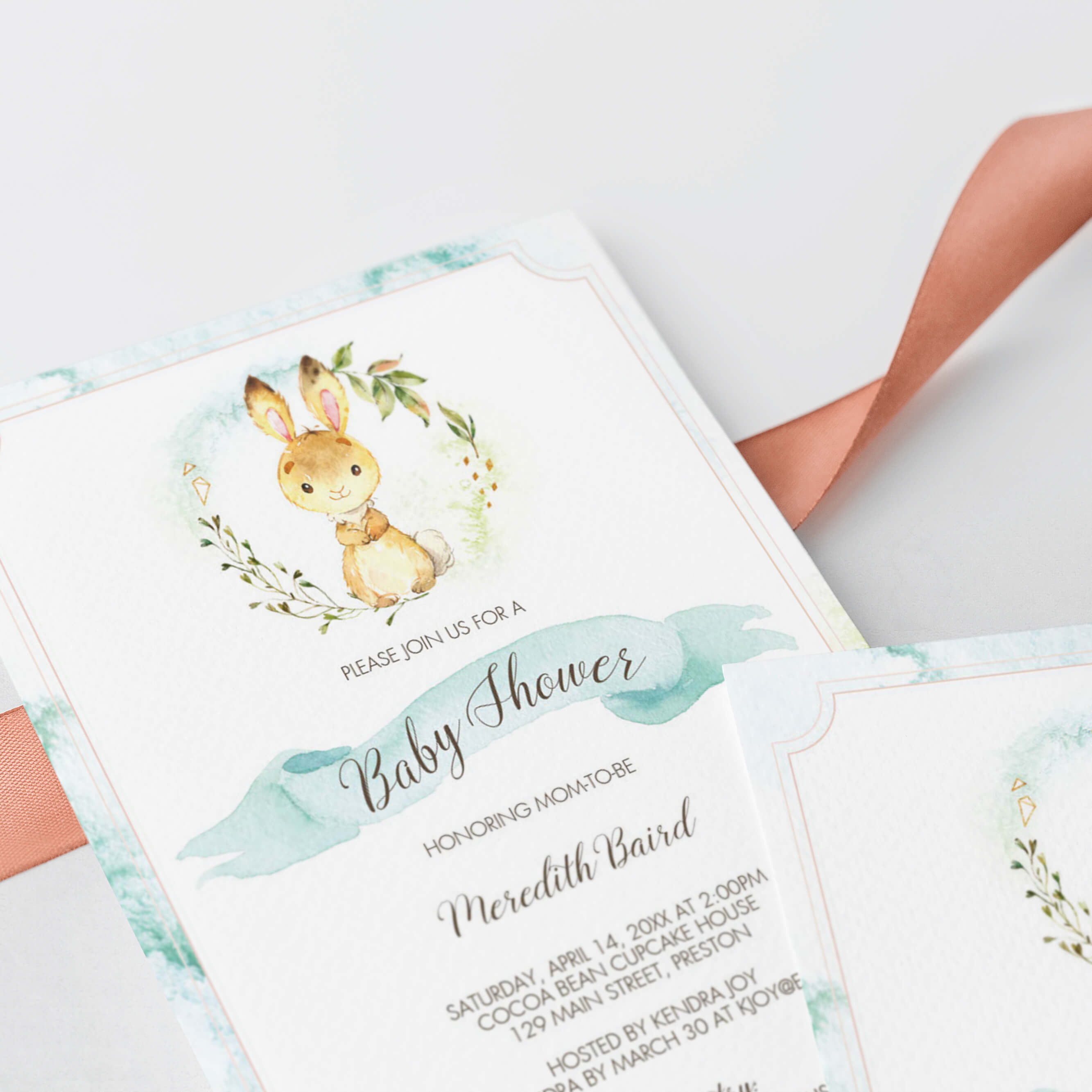 What better way to celebrate the arrival of a spring baby boy then to host a bunny themed baby shower? We are absolutely dying over the darling little rabbit on this light blue rabbit baby shower invitation.