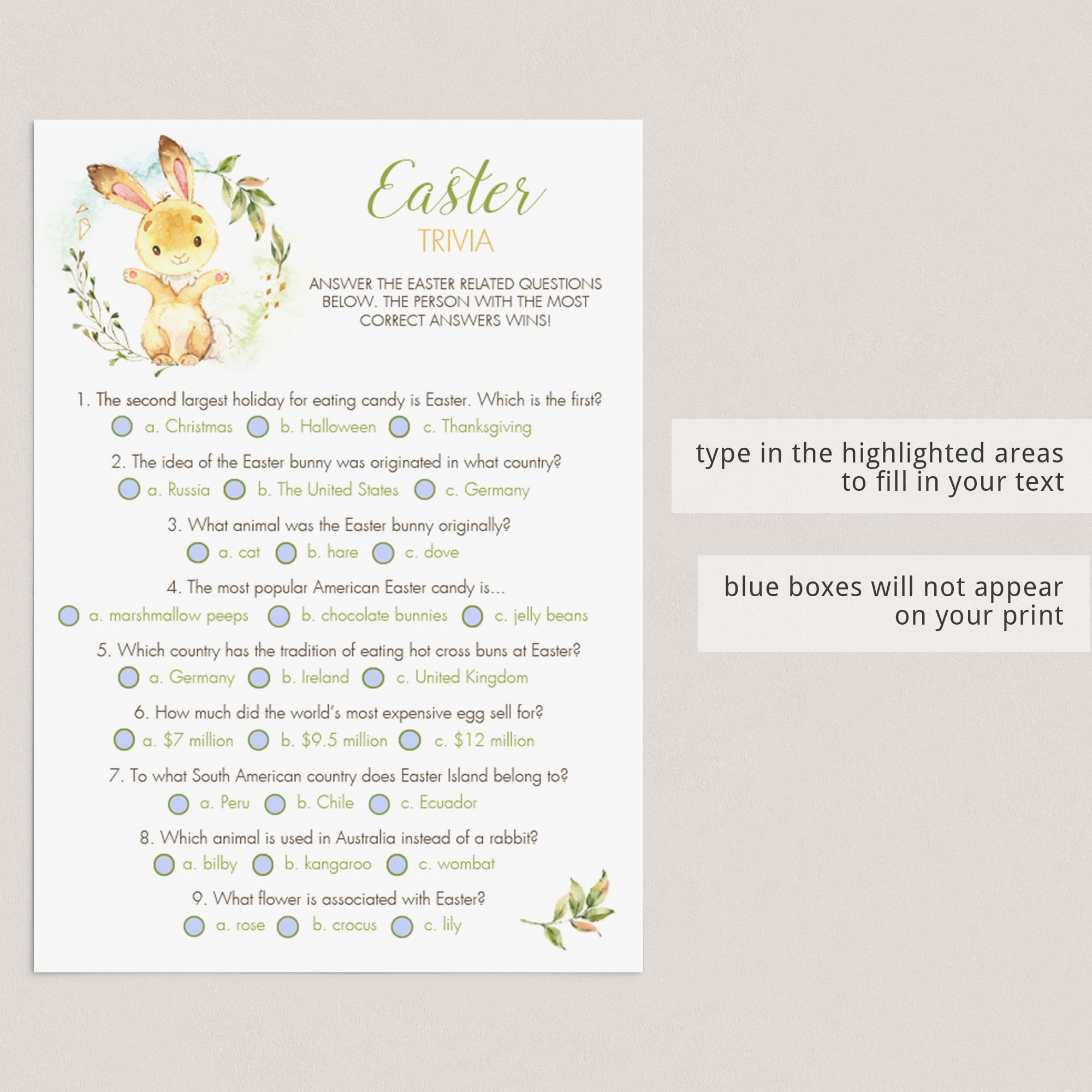 Are you hosting a (socially distanced) Easter celebration? Test your guests knowledge of this spring holiday with this cute Easter Quiz with watercolor bunny. It is a great game to play with friends and family, at Church or at your (online) Easter office party. You will learn some fun Easter facts. Just in case you are having trouble figuring out the answers, the answer key is included.