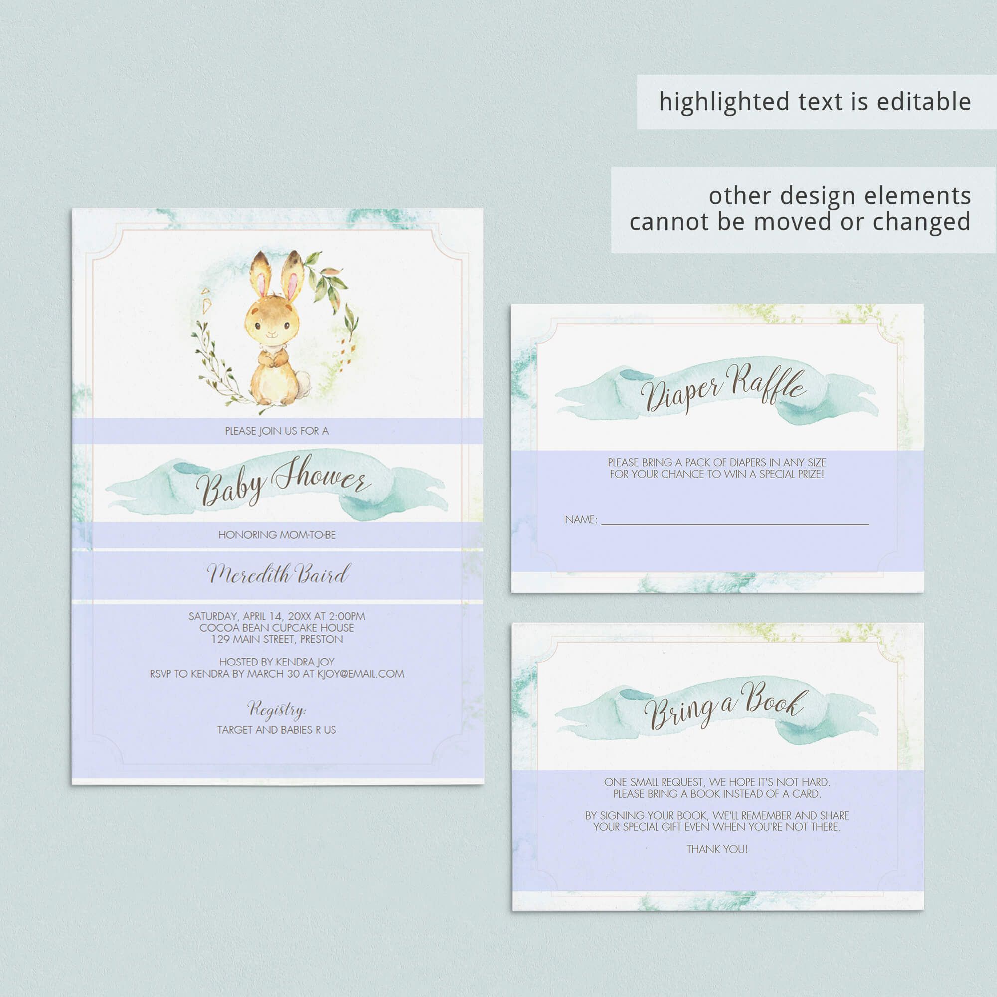 The invitation set includes the baby shower Invitation, a Diaper Raffle ticket and a Book Request card. You will create a sweet and delicate atmosphere that's absolutely appropriate for baby boys.