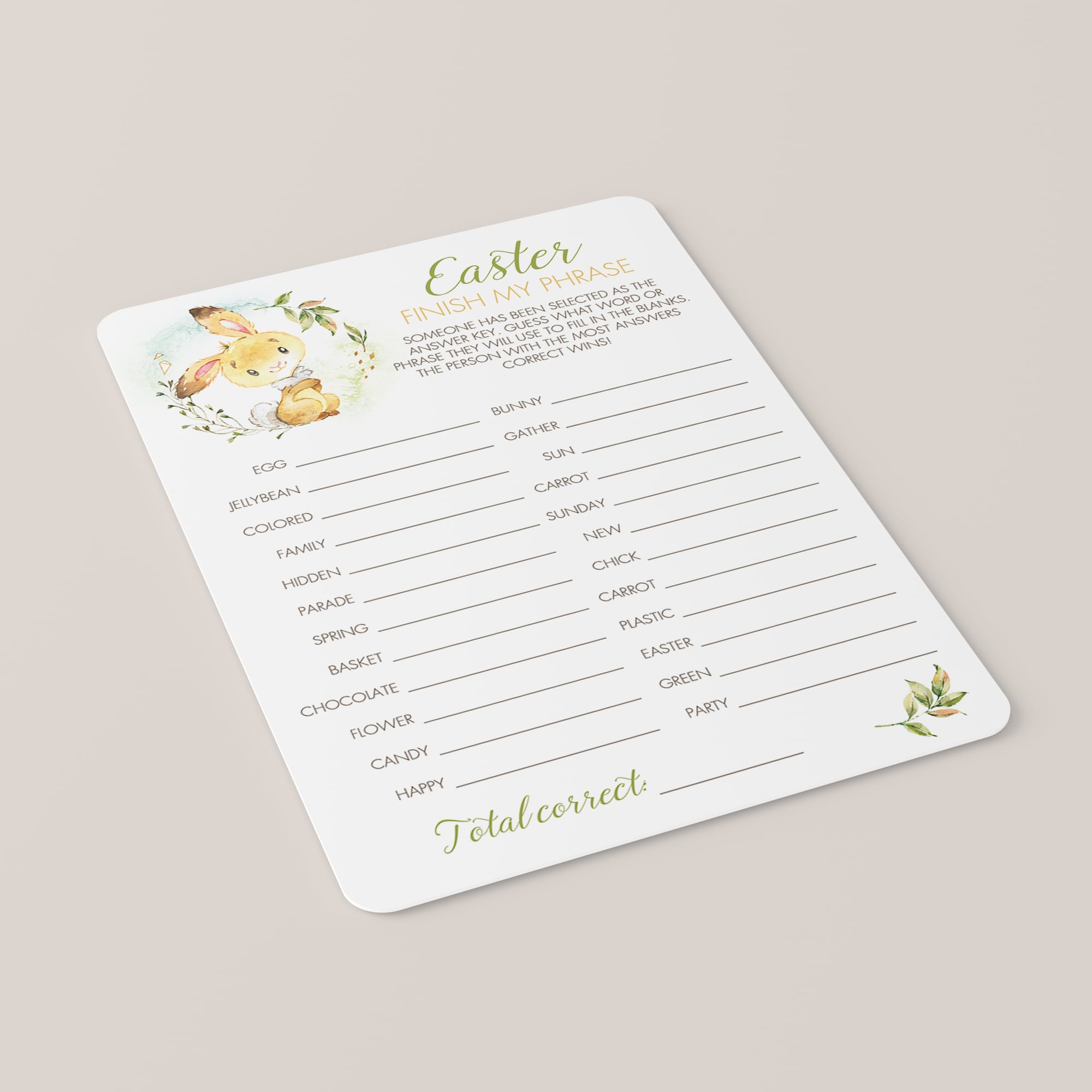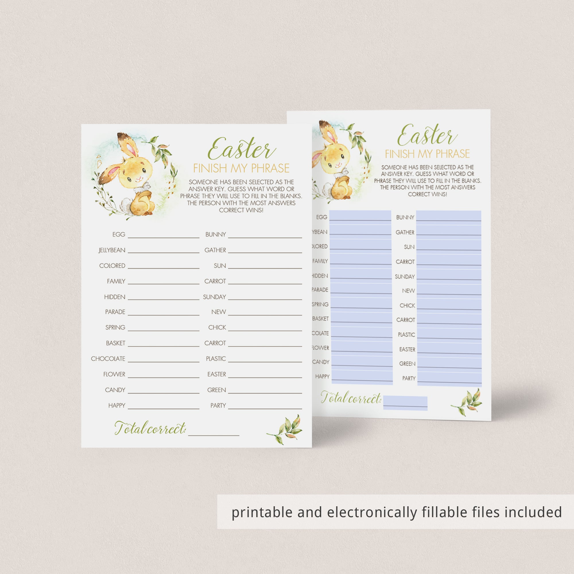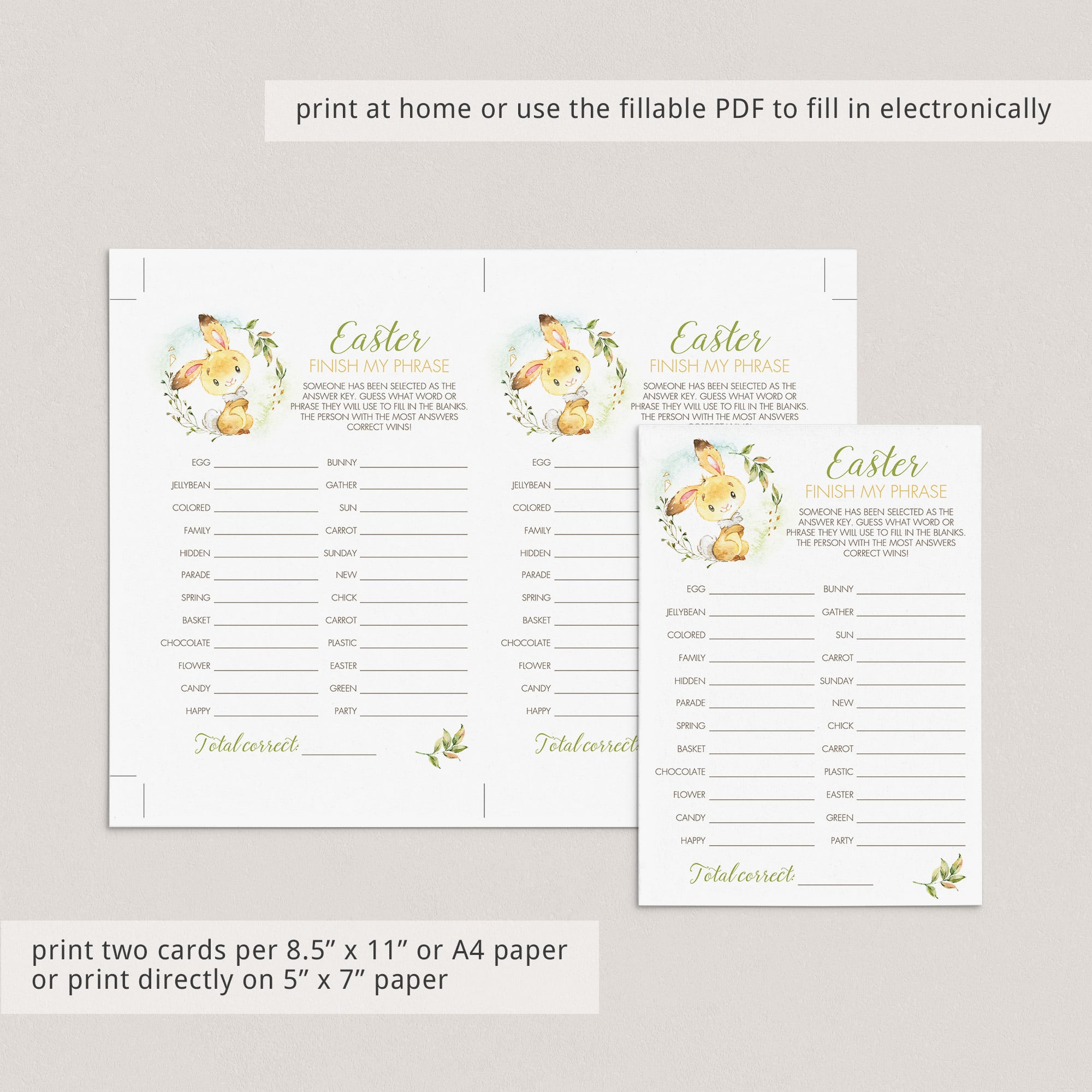 For an in-person Easter celebration, download and print these cute game cards with watercolor bunny as many times as you need. We recommend printing on a nice heavy card stock for highest quality feel. Print right from your computer in a matter of minutes or have the cards printed at your favorite print shop.