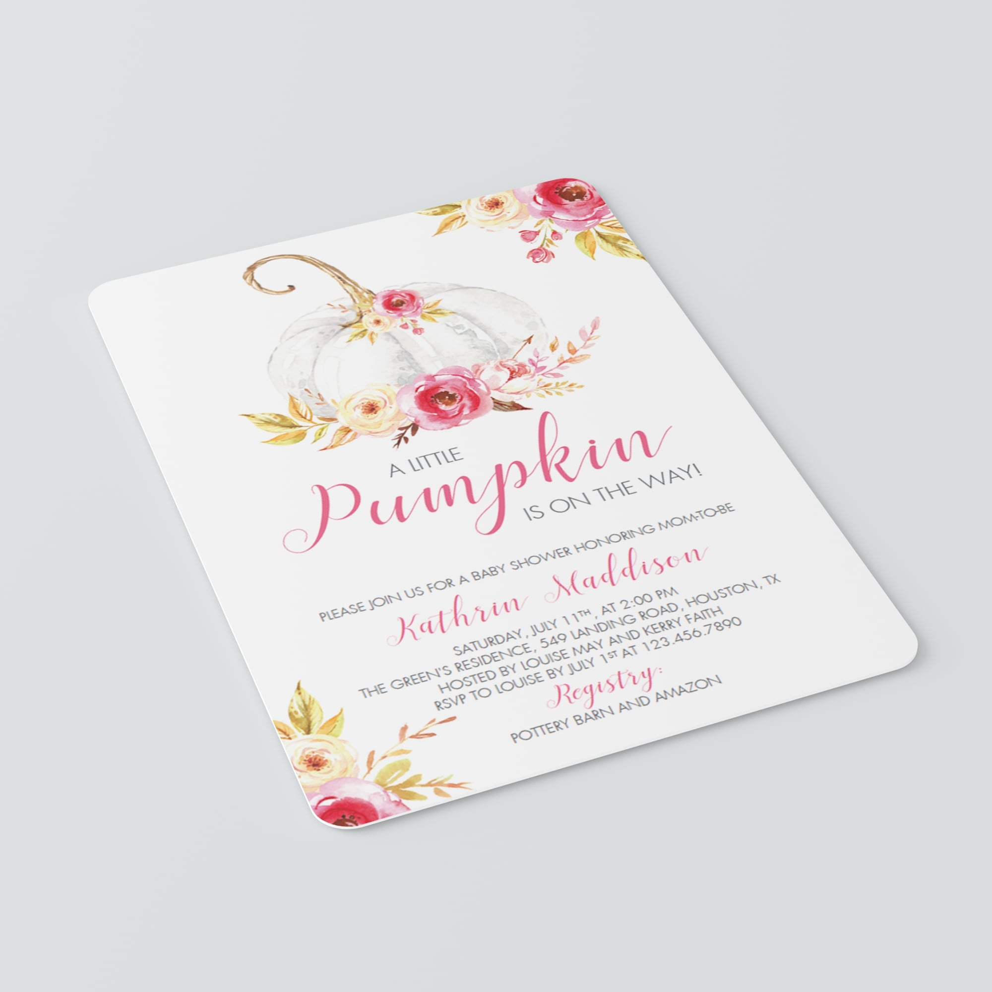 A little pumpkin on the way? Treat the mom-to-be on a baby shower to remember with a pumpkin themed baby shower. Invite your guests in style with this beautiful little pumpkin baby shower invitation with white pumpkin and pink floral arrangements.