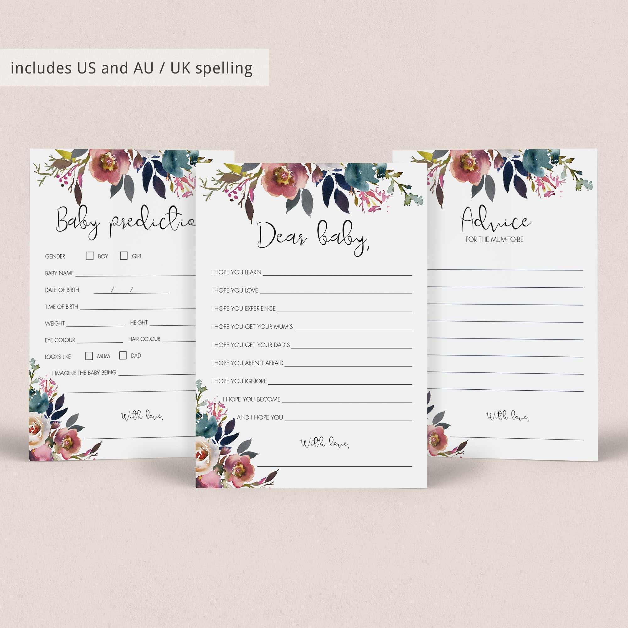 For the Advice card for the mom-to-be and for the parents-to-be, Baby Predictions card with and without baby gender prediction, Baby Wishes card, all in US English and AU / UK English, each: