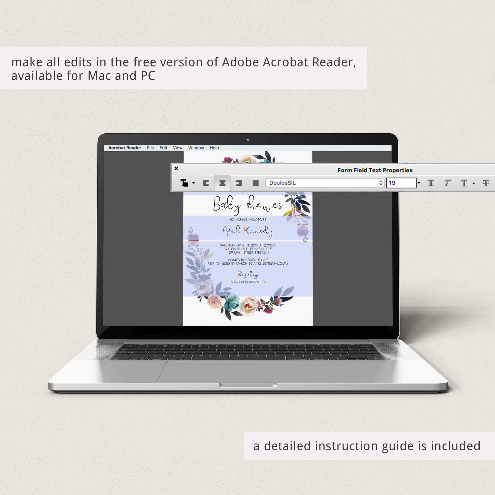 • 1 Editable PDF sized 5” x 7” to print or to use as evite