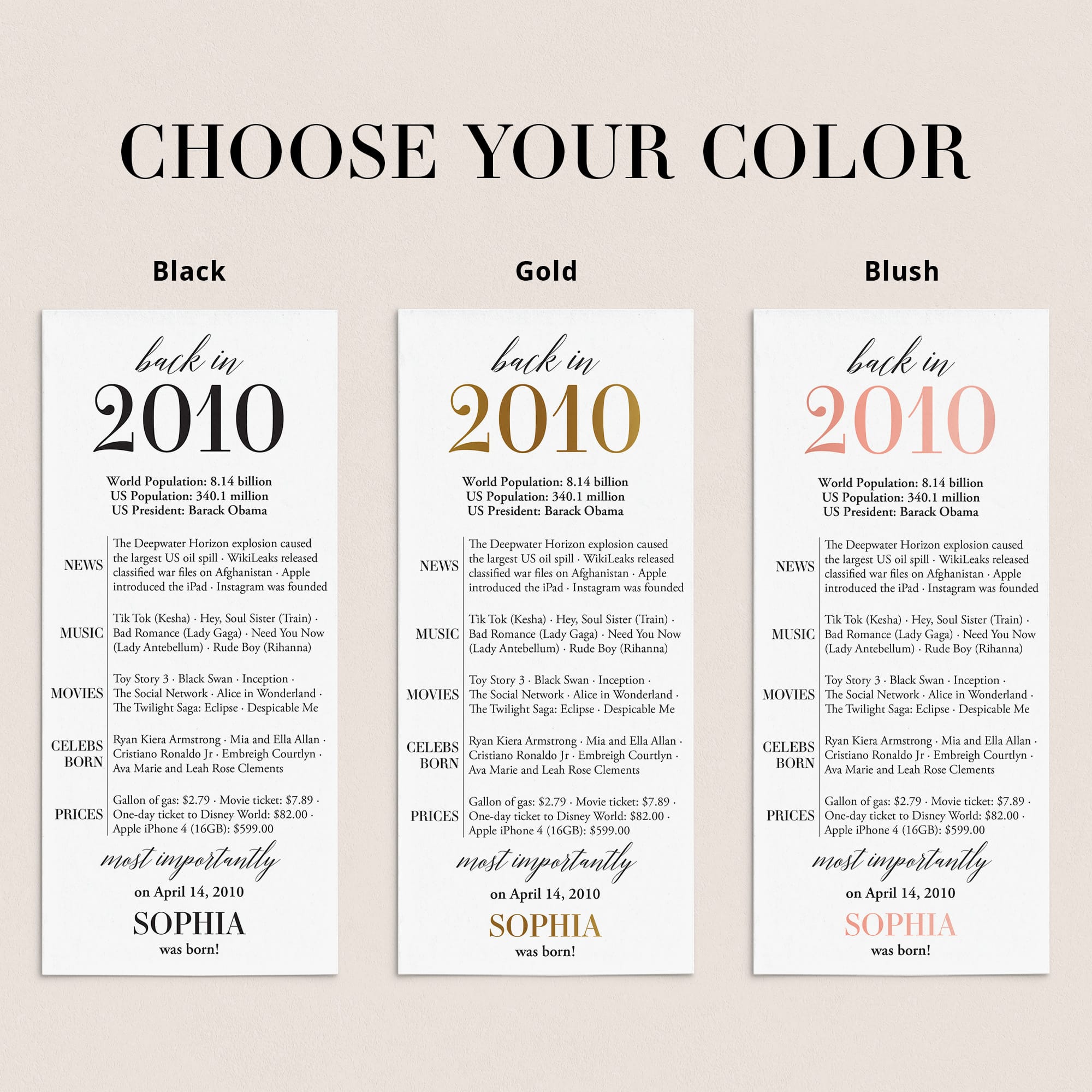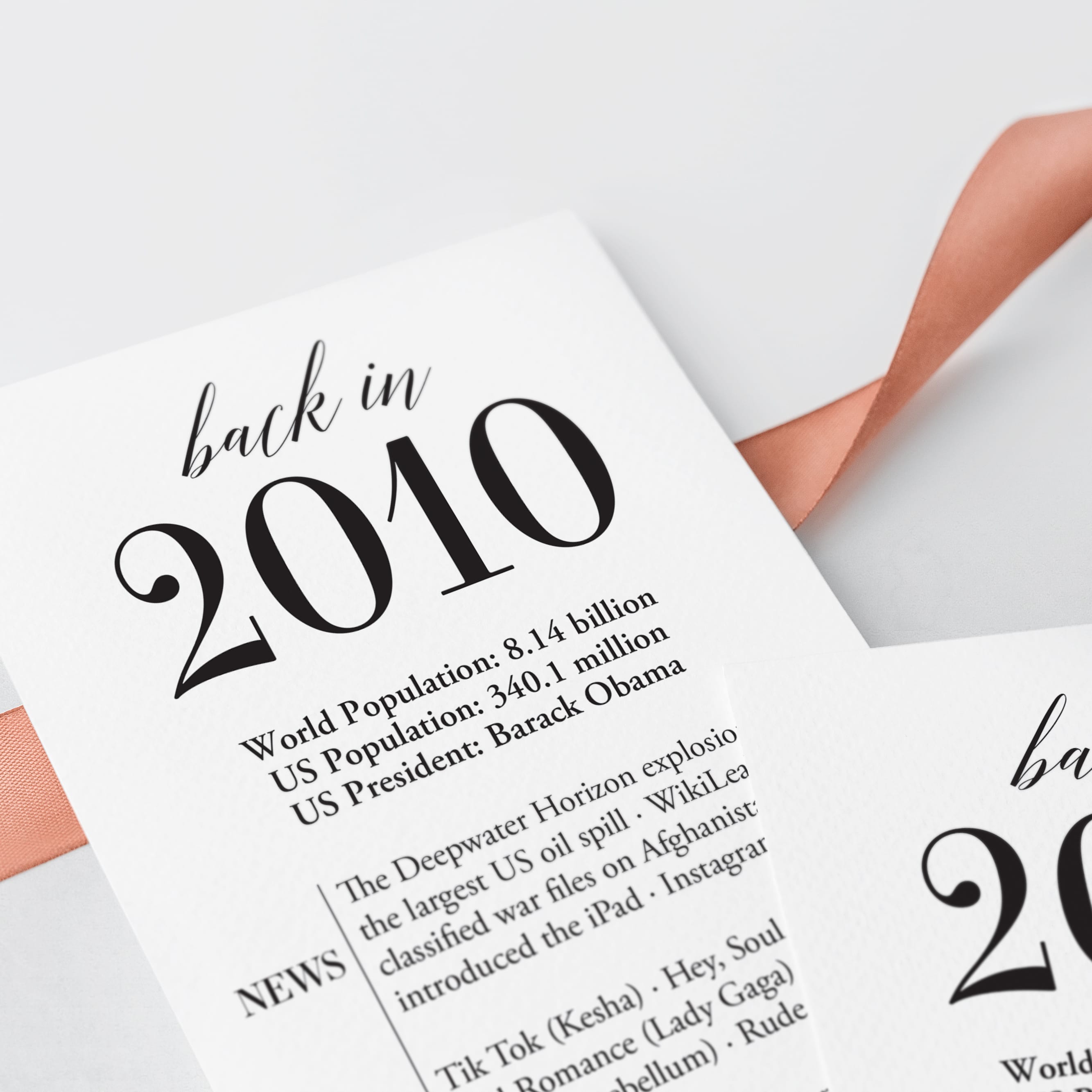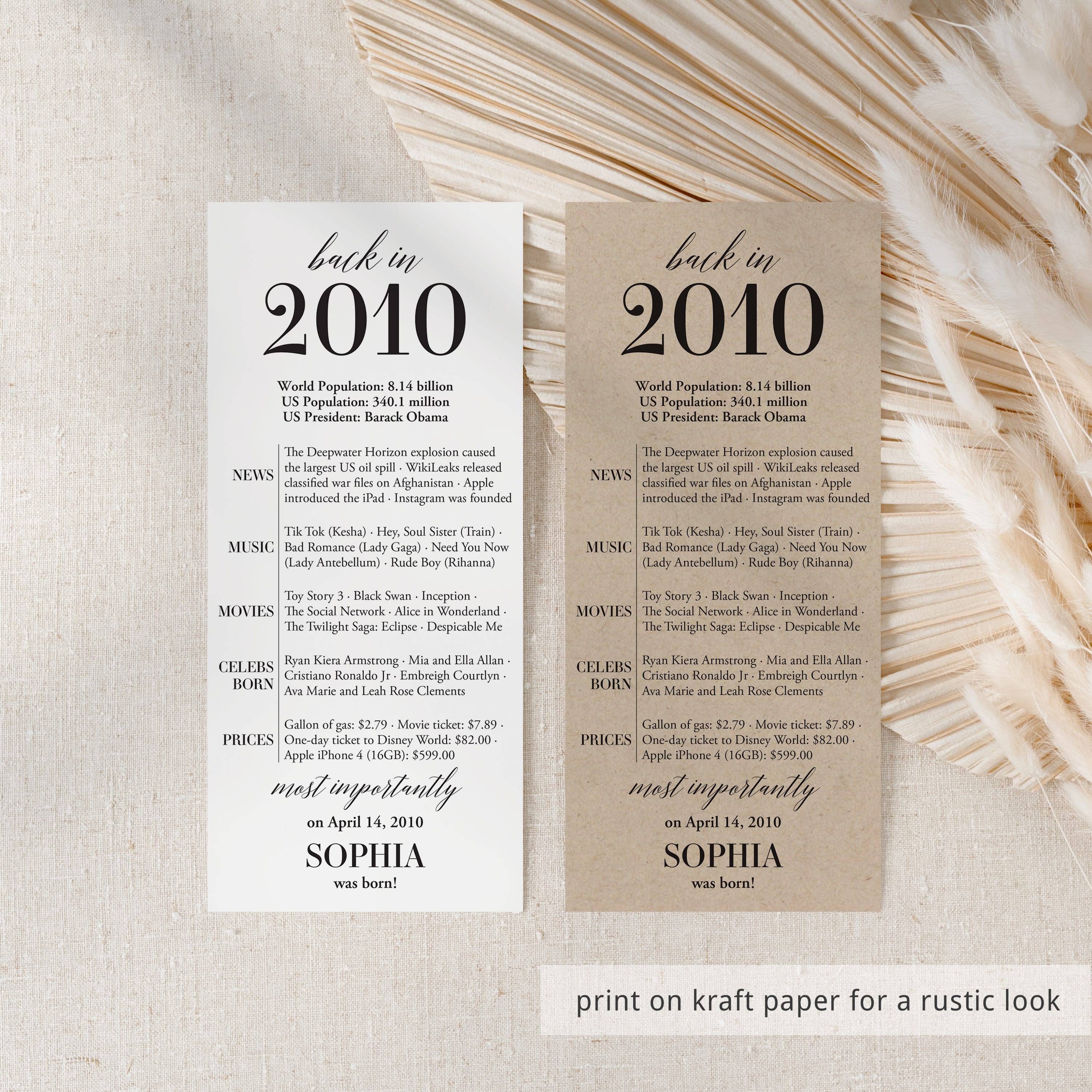 Are you looking for a simple yet elegant way to add a personal touch to a birthday celebration? Our “Back in 2010” table card is the perfect addition to any birthday party for someone turning 16 in 2026! This modern and minimalist card, personalized with the honoree’s name and birth date, showcases entertaining facts from 2010.
