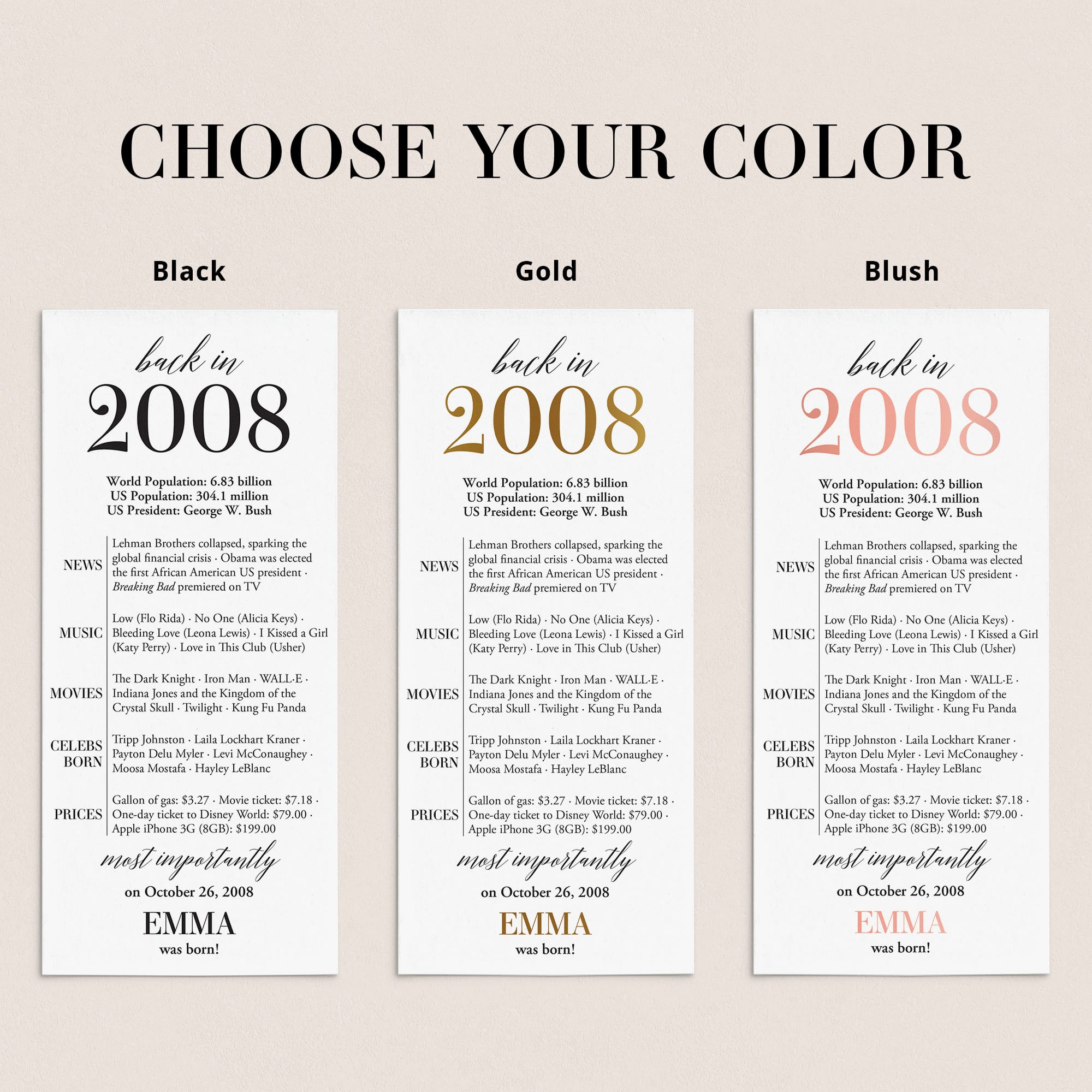 Are you looking for a simple yet elegant way to add a personal touch to a birthday celebration? Our “Back in 2008” table card is the perfect addition to any birthday party for someone turning 18 in 2026! This modern and minimalist card, personalized with the honoree’s name and birth date, showcases entertaining facts from 2008.