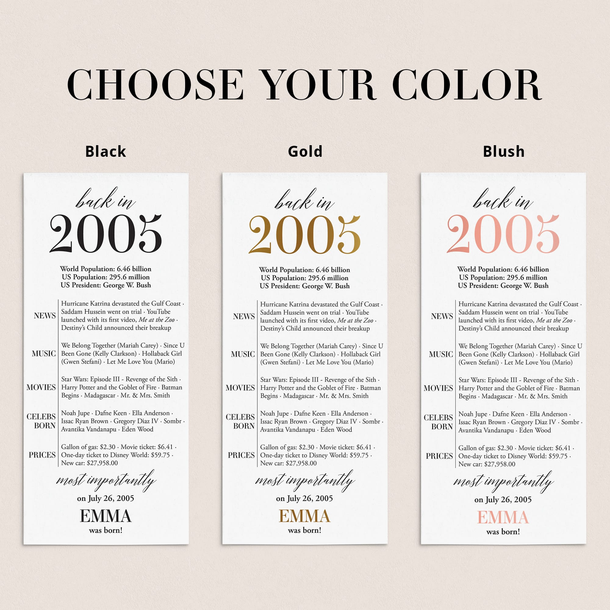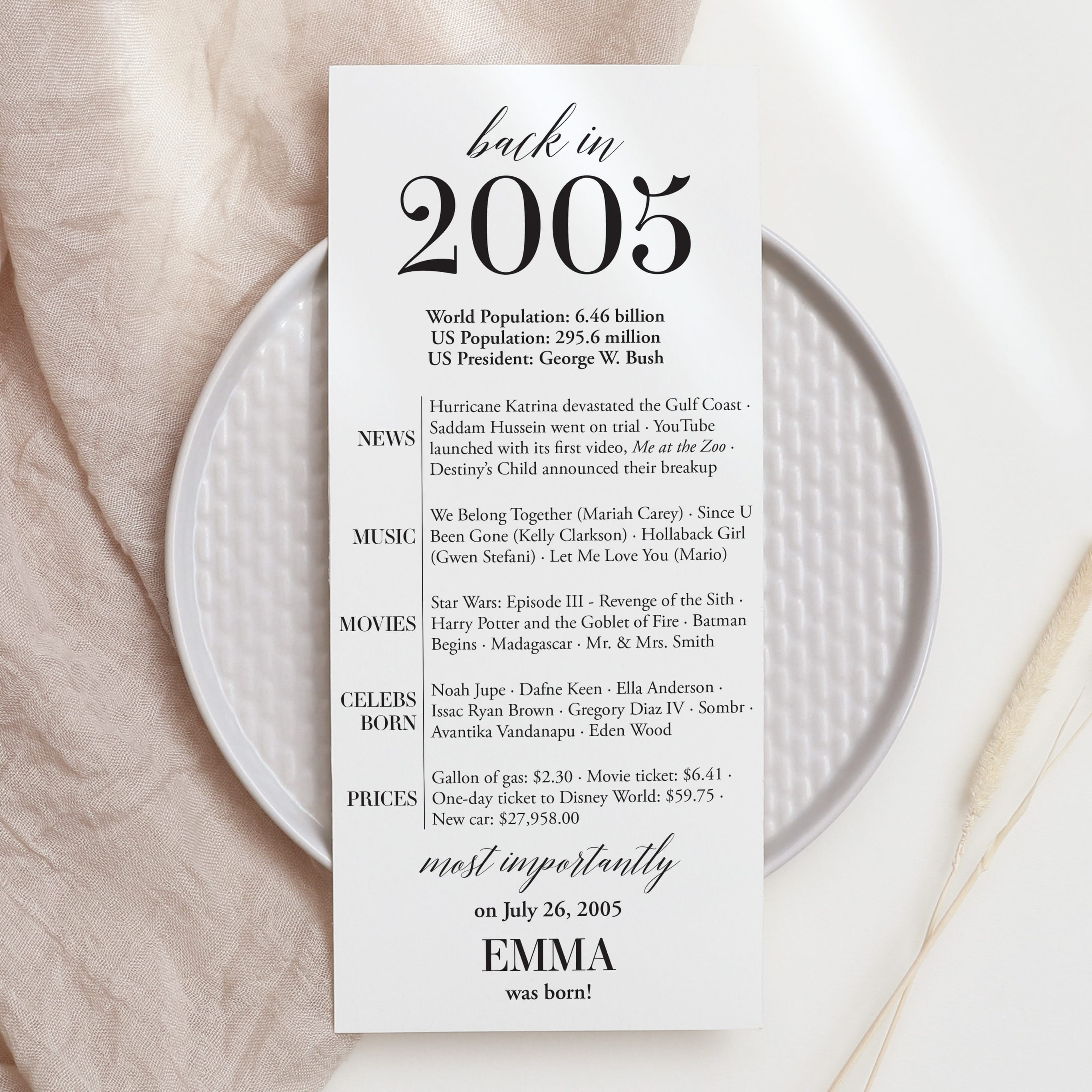 Are you looking for a simple yet elegant way to add a personal touch to a birthday celebration? Our “Back in 2005” table card is the perfect addition to any birthday party for someone turning 21 in 2026! This modern and minimalist card, personalized with the honoree’s name and birth date, showcases entertaining facts from 2005.