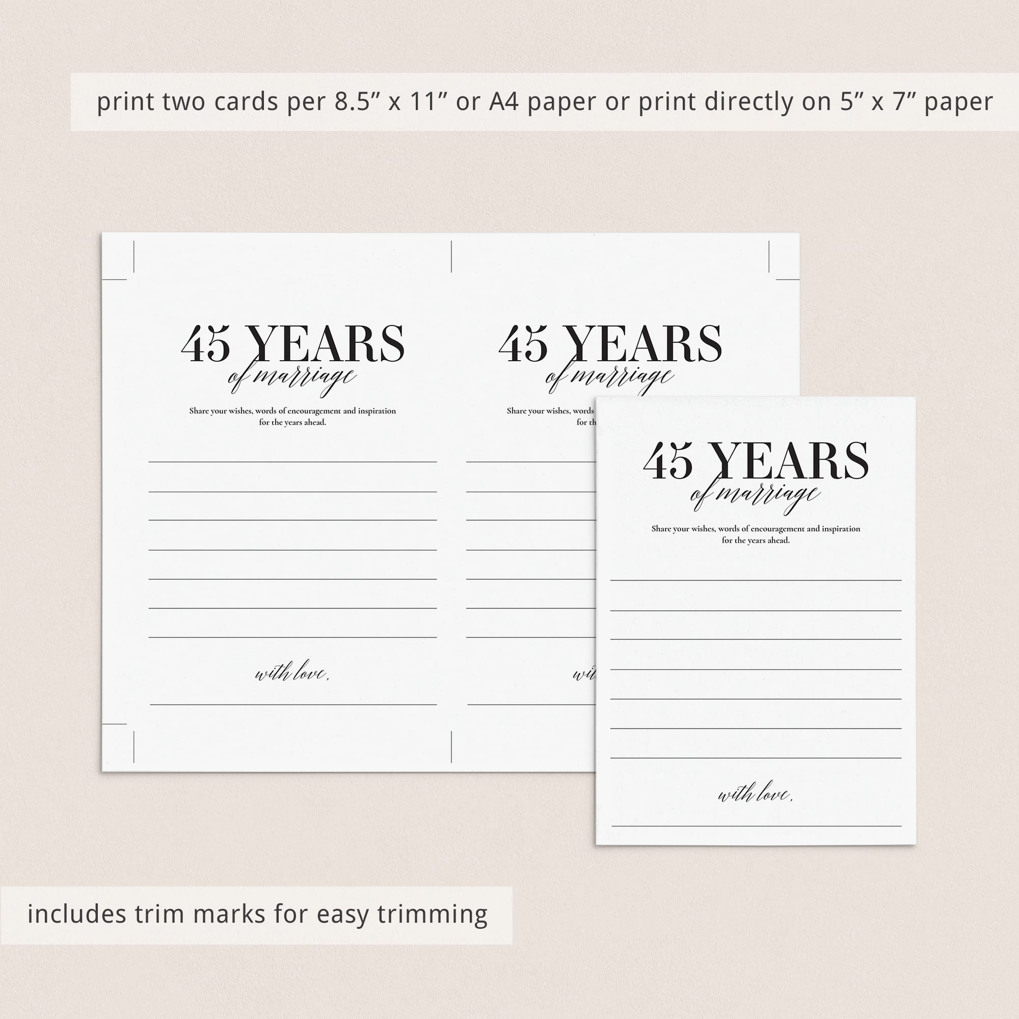This 45 years of marriage wishes card is an instant download. After purchase you will receive a download link immediately on screen. Also within minutes of your order and payment, an e-mail will be sent to you with a link for your download.