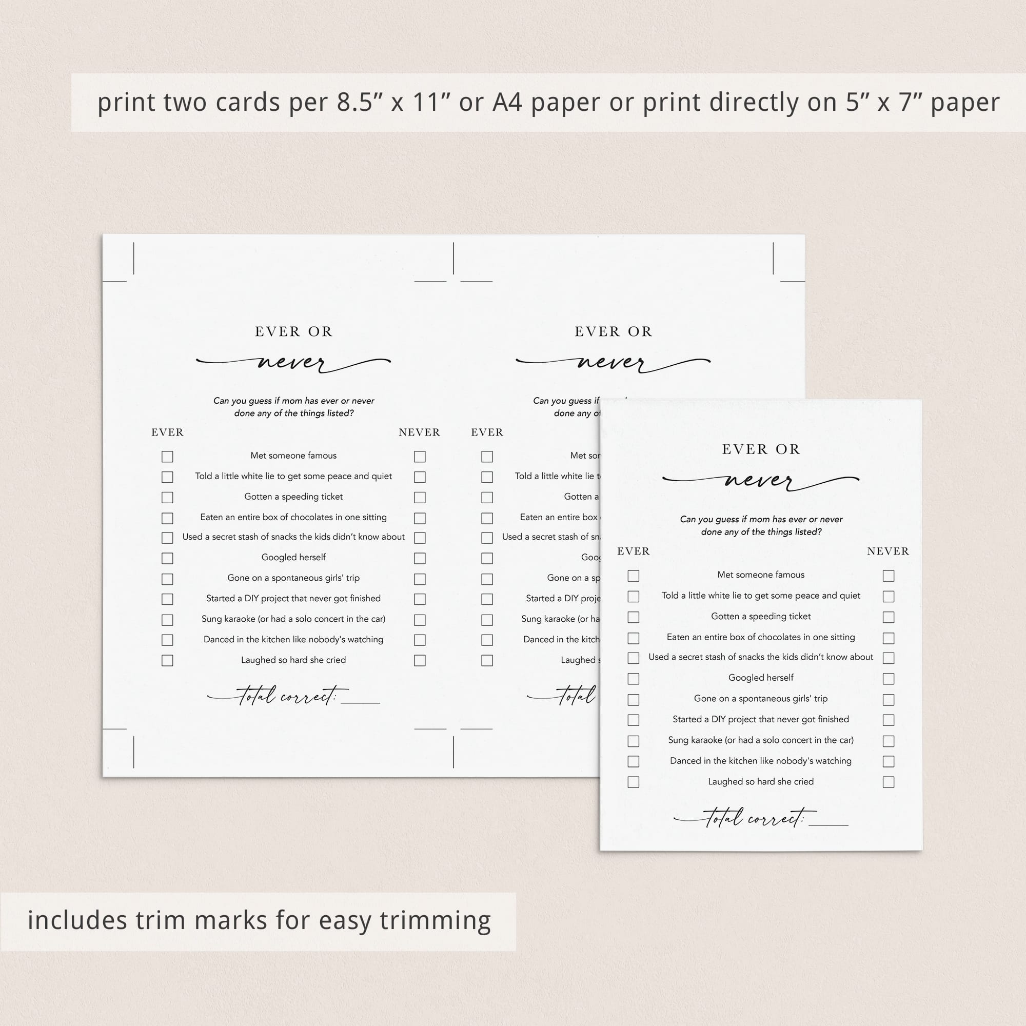 This Mothers Day Ever or Never game is an instant download. After purchase you will receive a download link immediately on screen. Also within minutes of your order and payment, an e-mail will be sent to you with a link for your download.