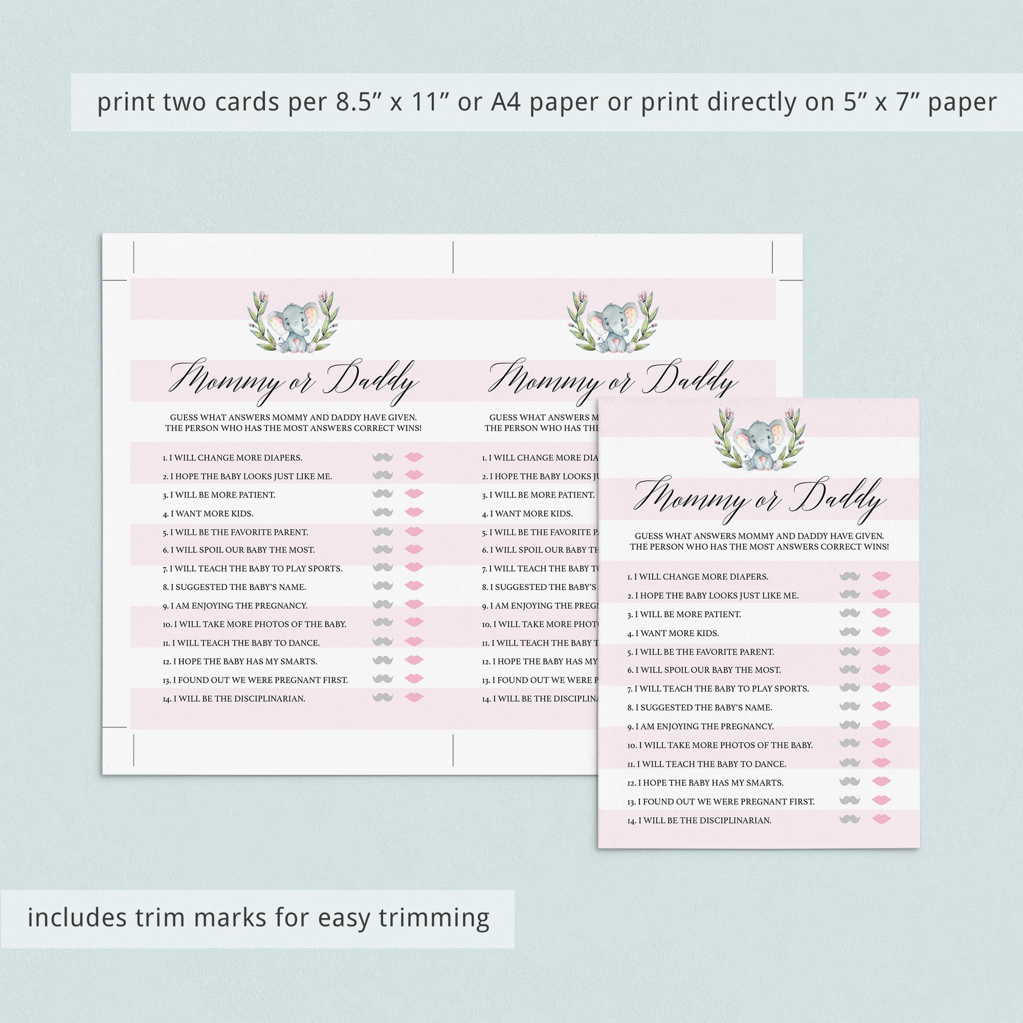 Before the baby shower, ask the mom and dad-to-be the questions listed on the elephant themed game sheet and write down their answers. The questions can be personalized. Who suggested the baby’s name? Who will teach baby to dance? Who will be more patient?