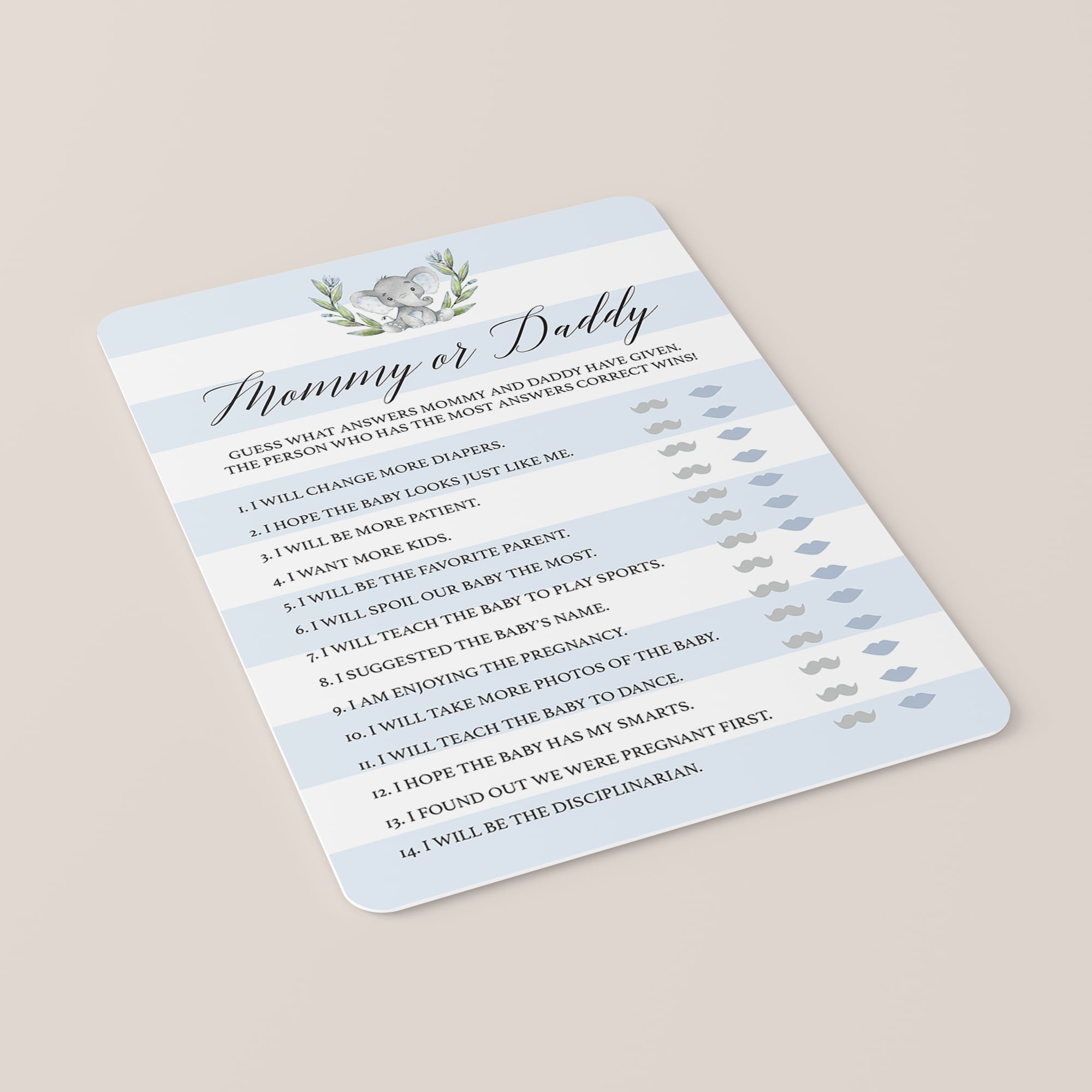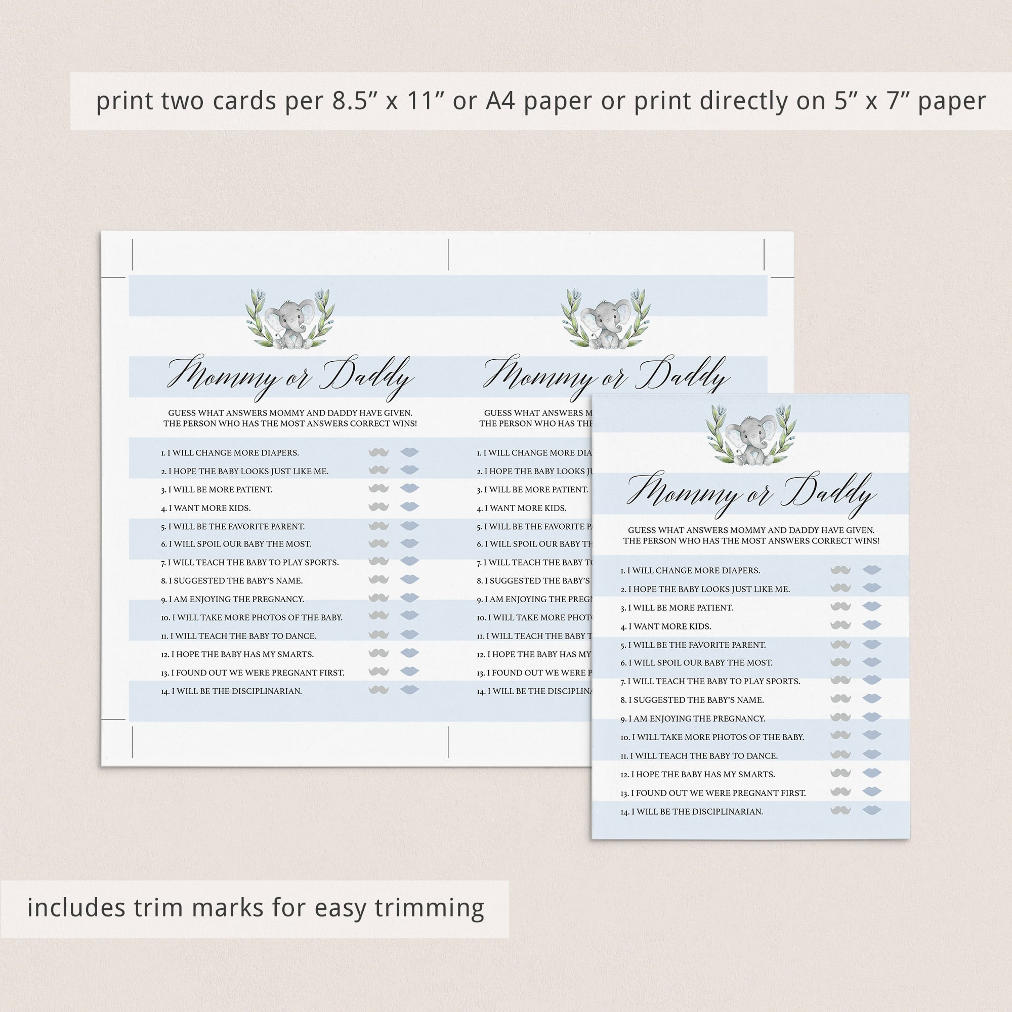 A Mommy or Daddy quiz is such a fun way to find out some more about the new parents. This elephant themed game is especially fun if you are hosting a co-ed baby shower.