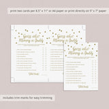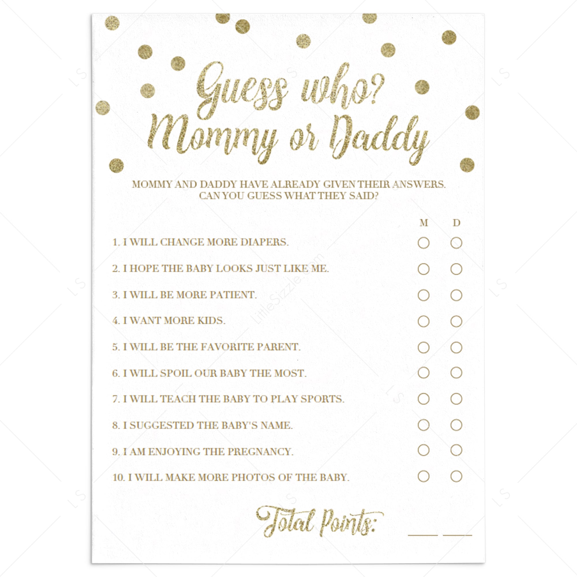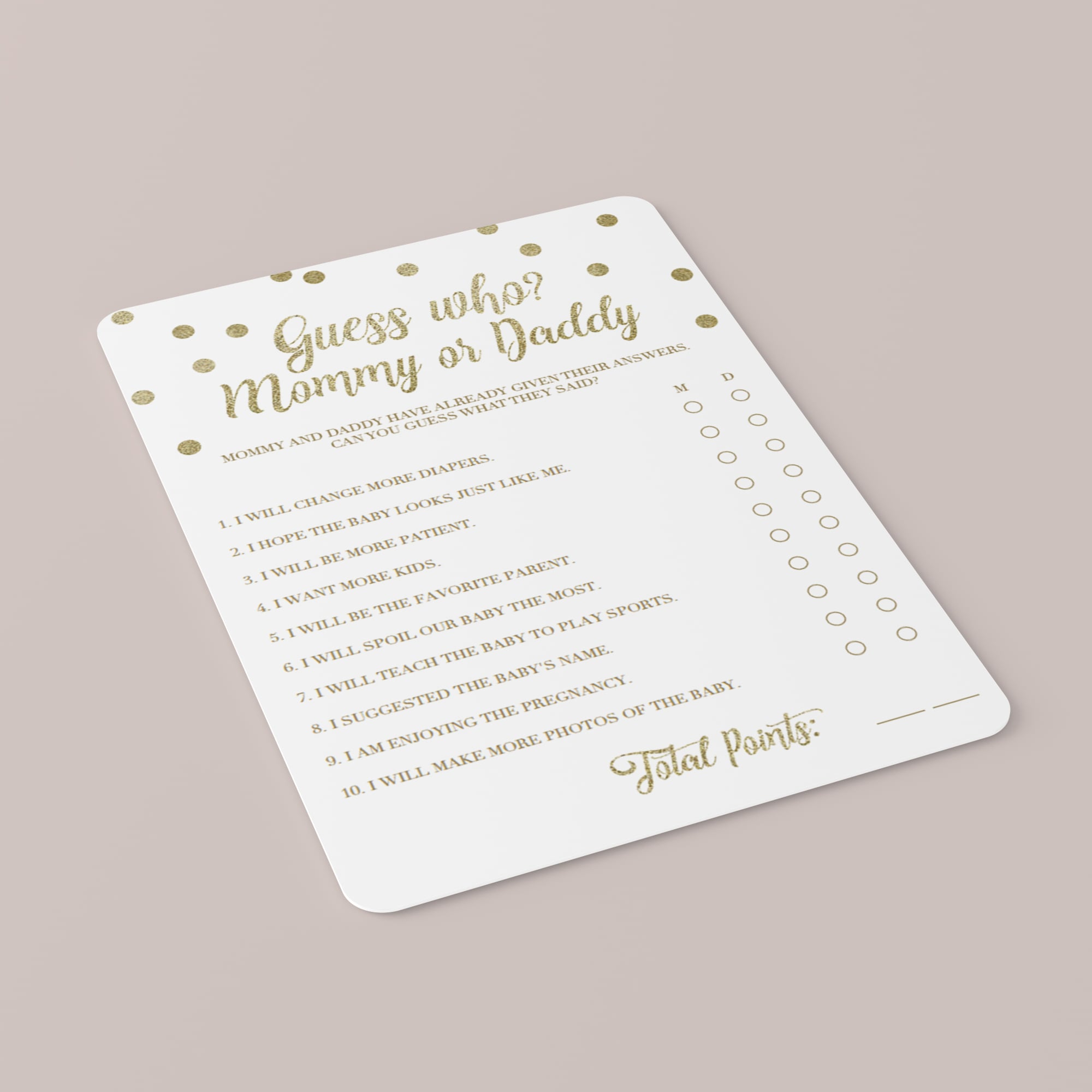 Before the baby shower, ask the mommy and daddy-to-be the questions listed on the gold baby shower game sheet and write down their answers. The questions can be personalized. Who suggested the baby’s name? Who will teach baby to dance? Who will be more patient?