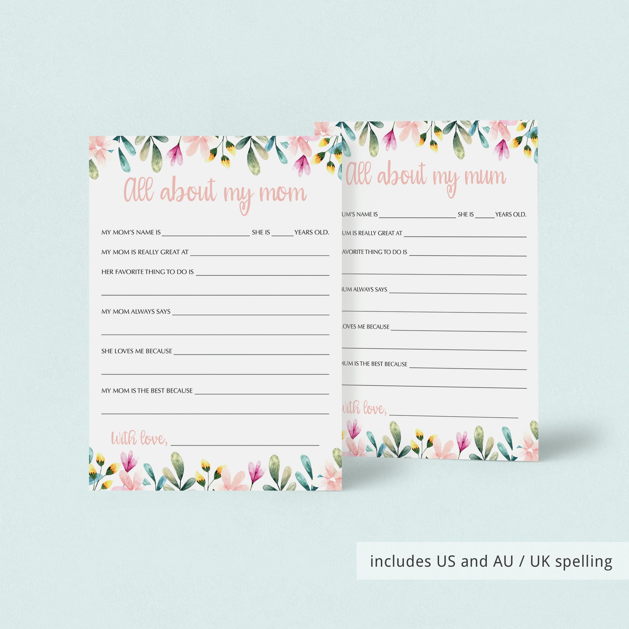 This Mother's Day card comes in in US spelling (All About My Mom) and AU / UK spelling (All About My Mum). Both versions are included with your purchase.