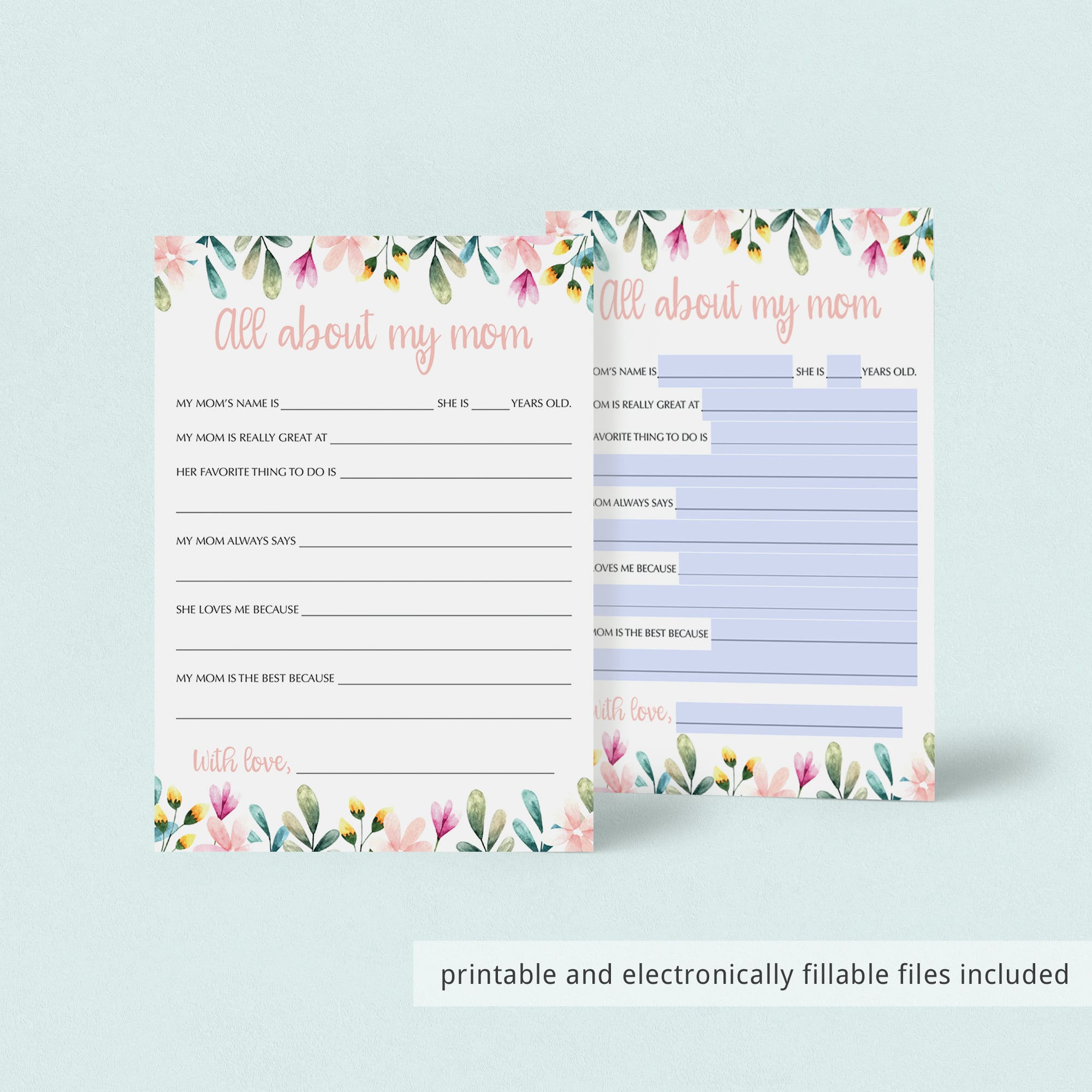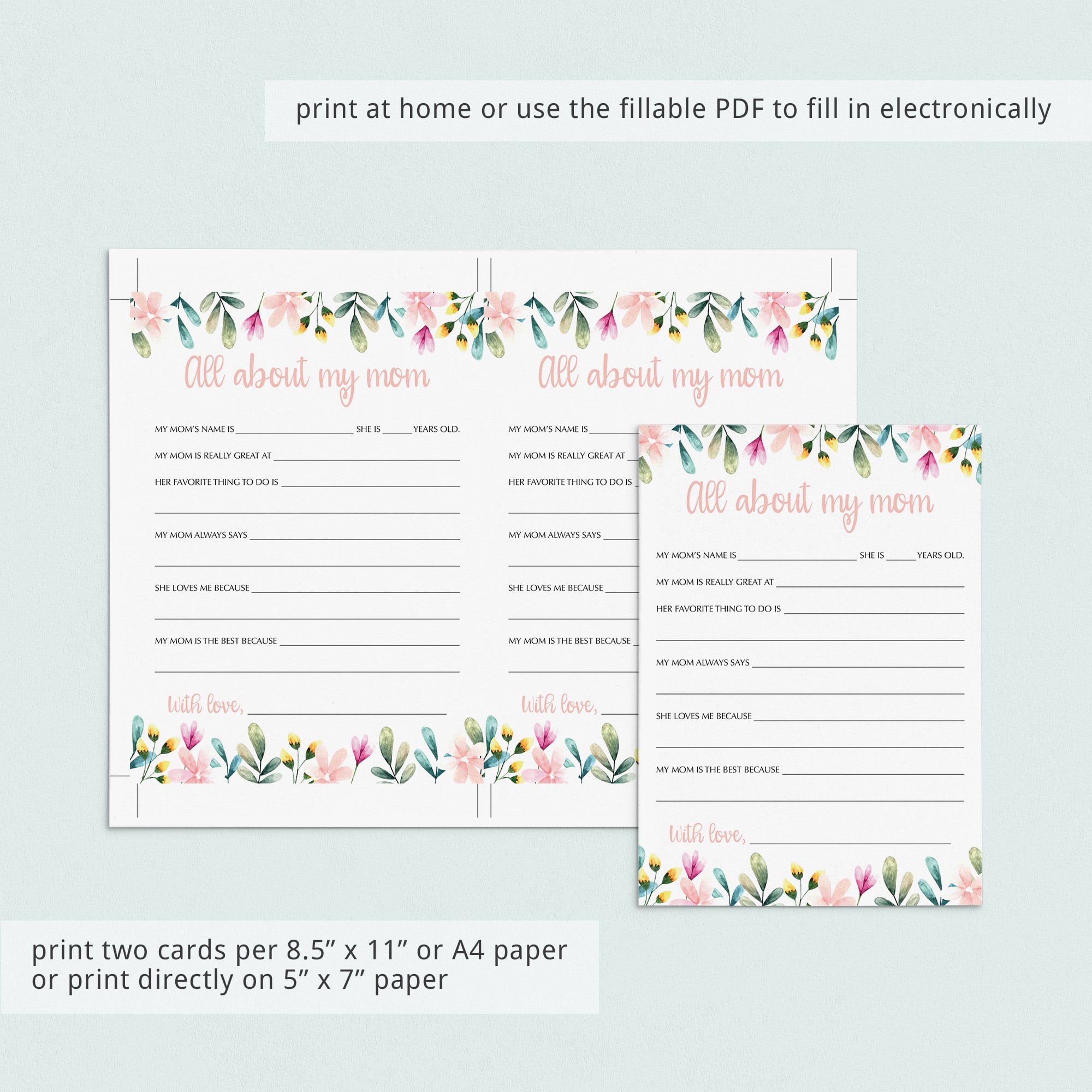 Because the usual Mother’s Day celebration might be out of the question this year, we have included not only the printable files, but also the fillable PDF template. You can download and email the All About My Mom cards to your siblings and have them print the cards at home or fill in their answers electronically in the free version of Adobe Acrobat Reader.