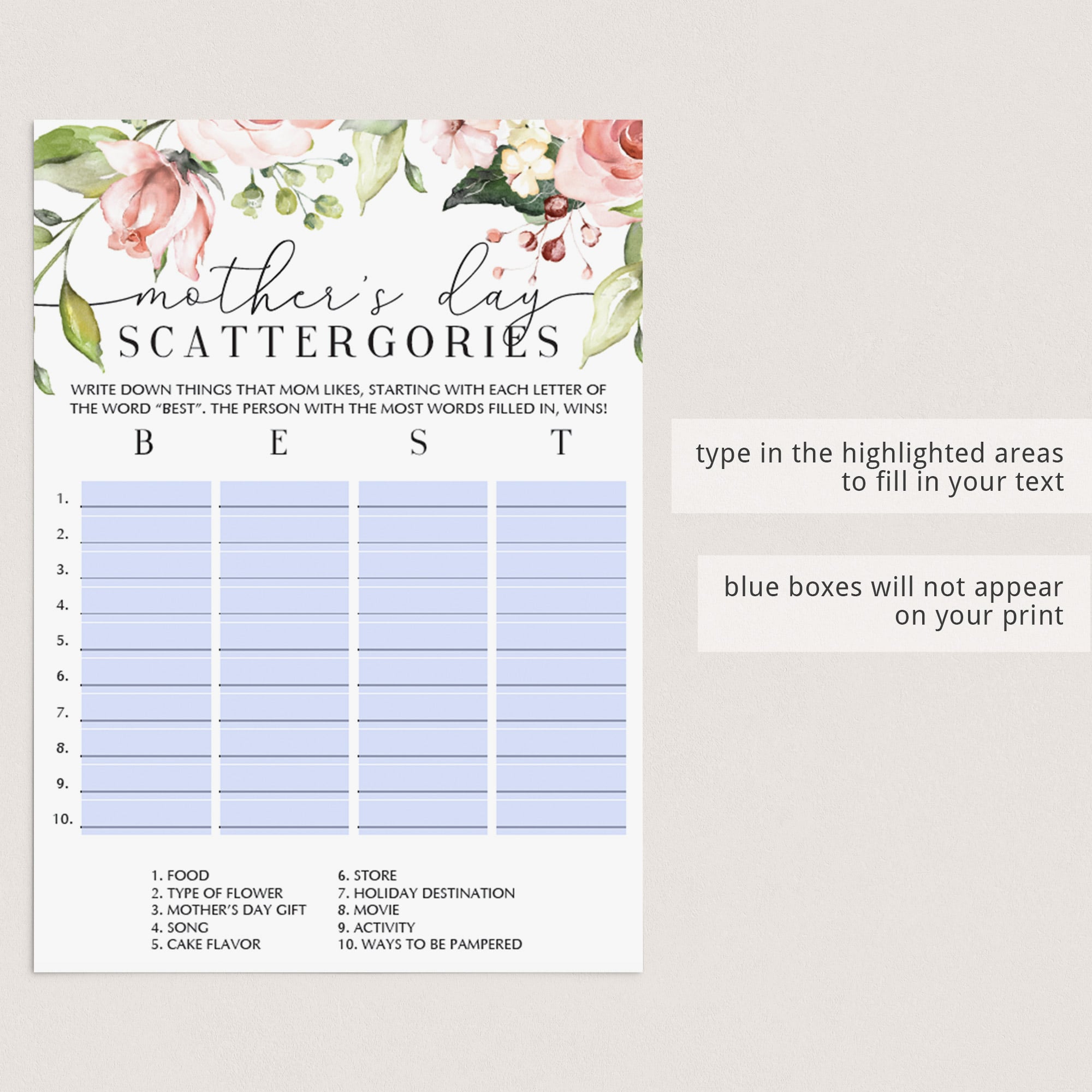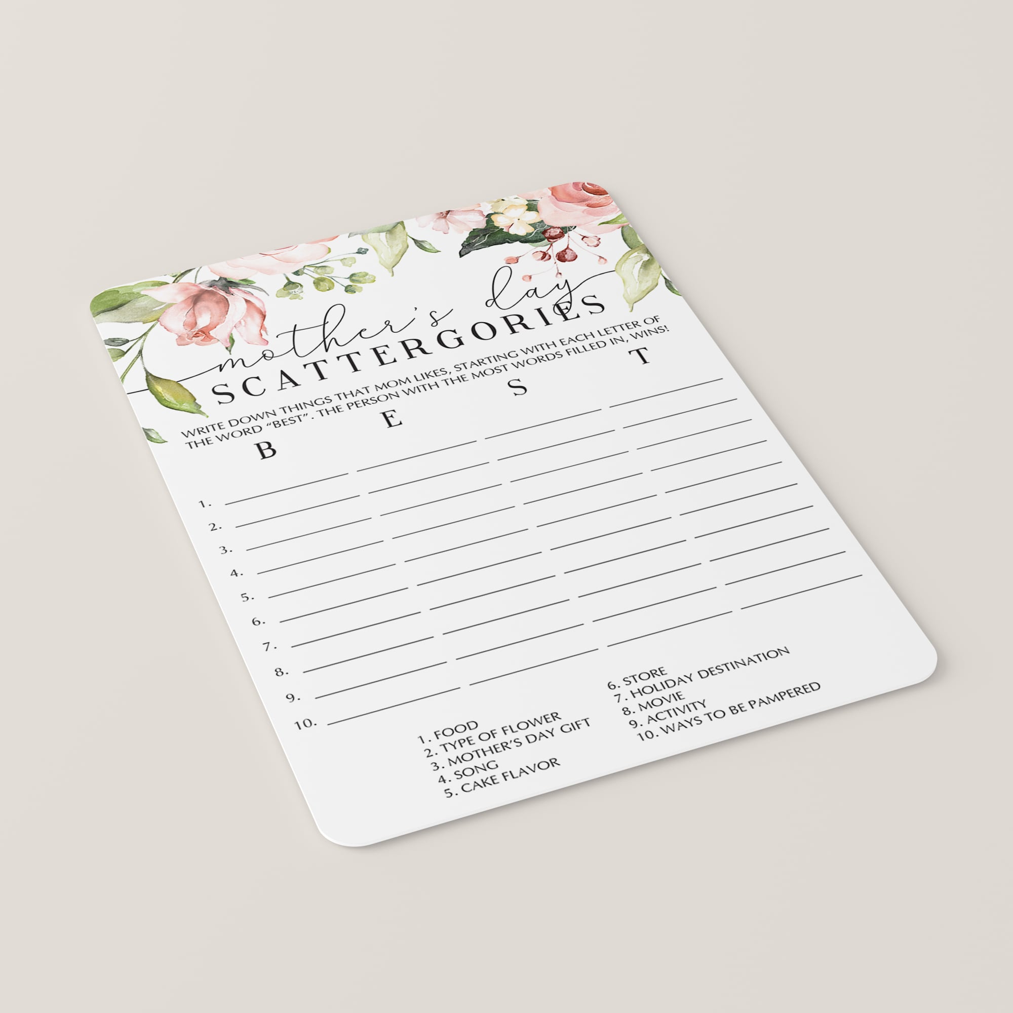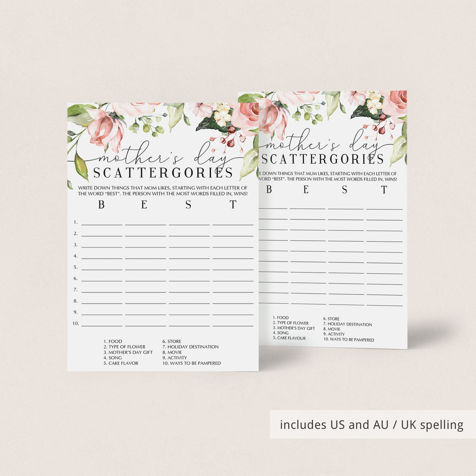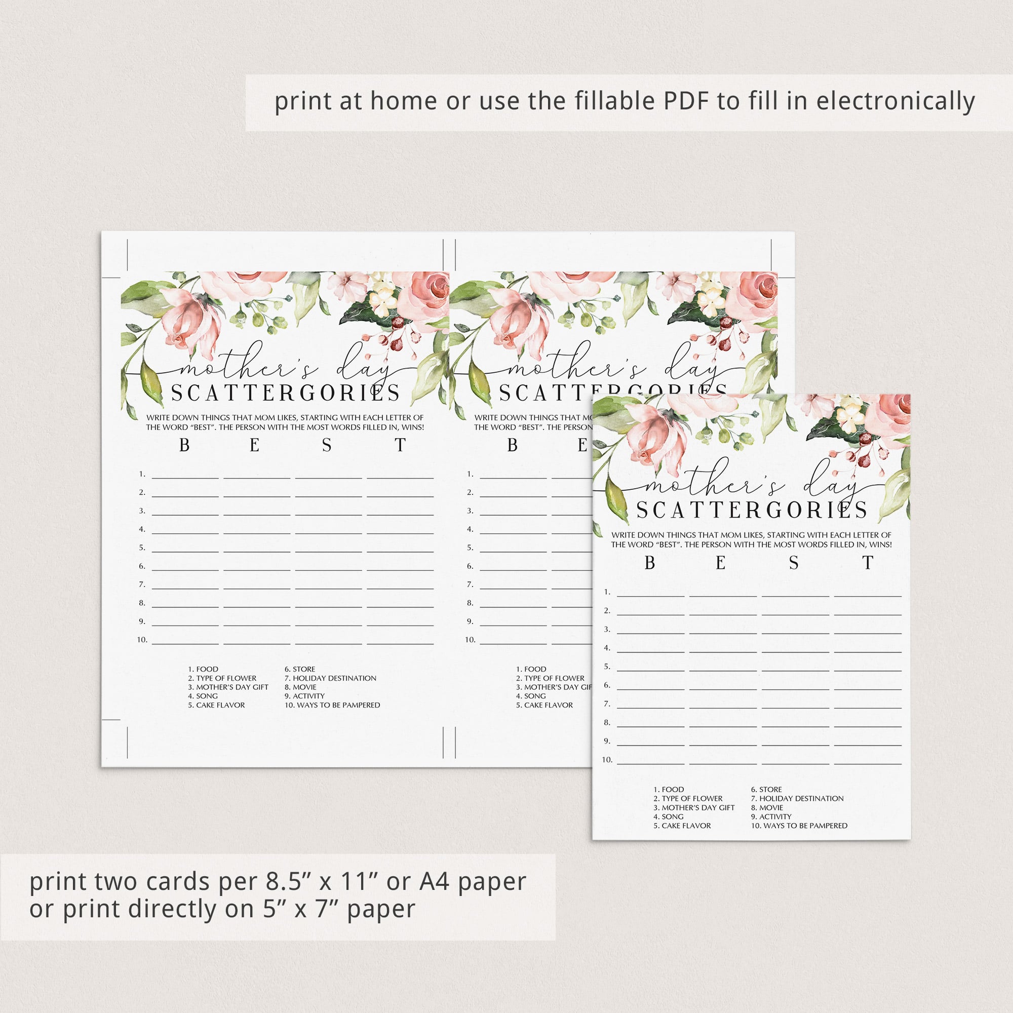 How many words can you fill in with the letters "B", "E", "S" and "T"? Play Mother's Day Scattergories with this gorgeous game card with blush flowers to ensure lots of fun and laughter. Printable and electronically fillable files are included, so that you can play this Mother's Day game at home or over a video call platform like Zoom.