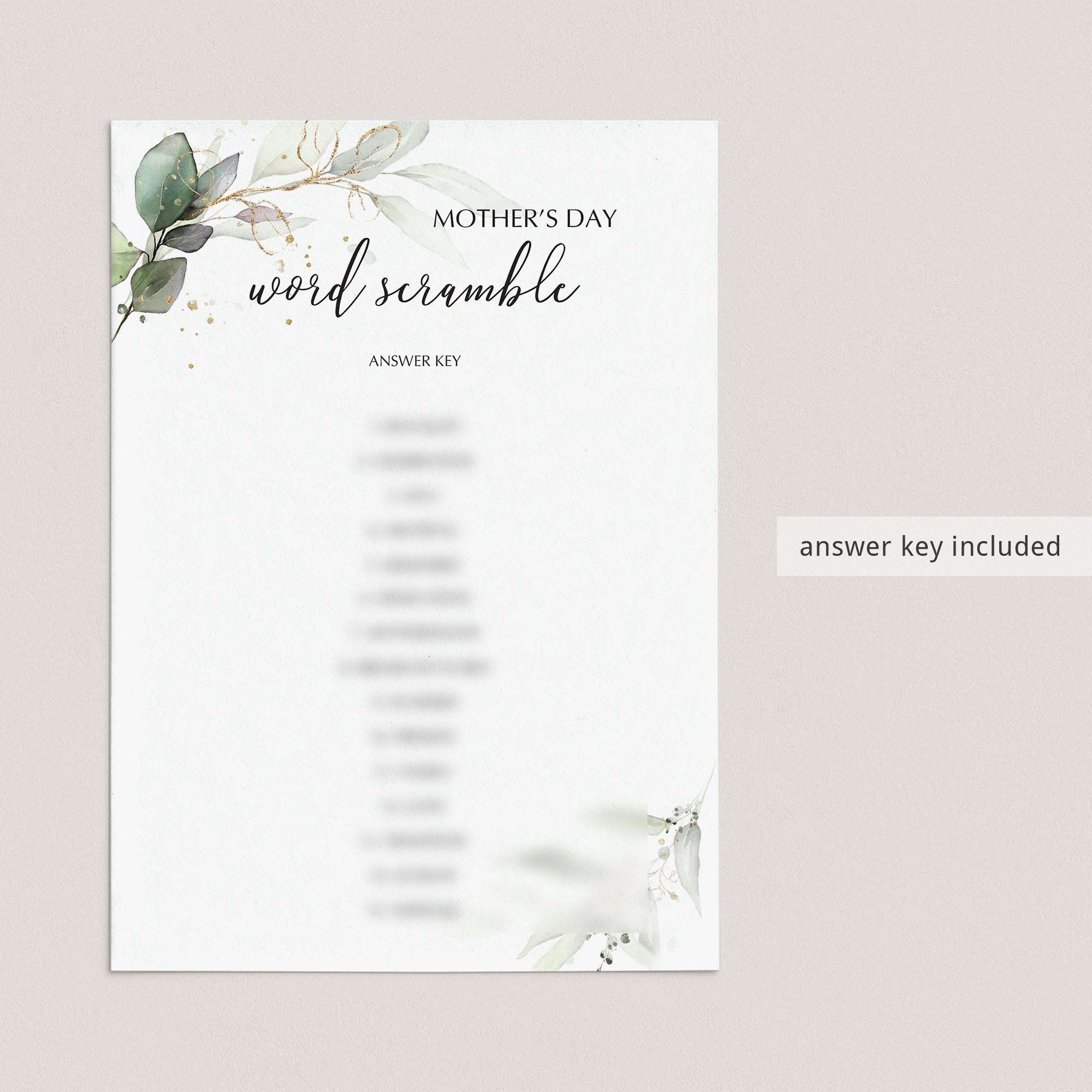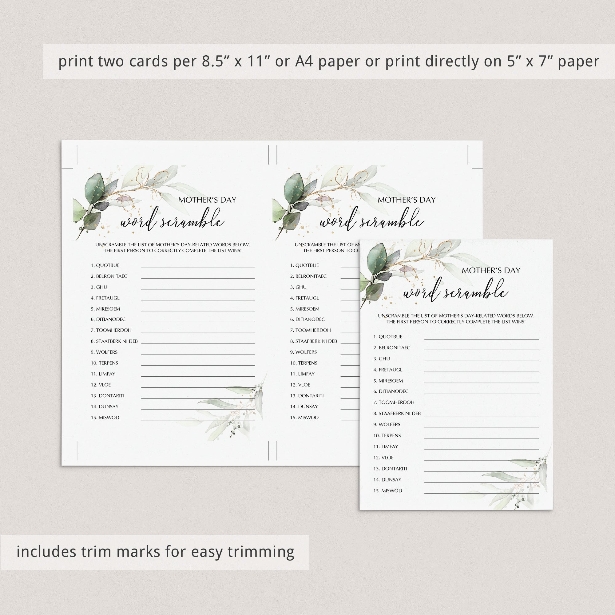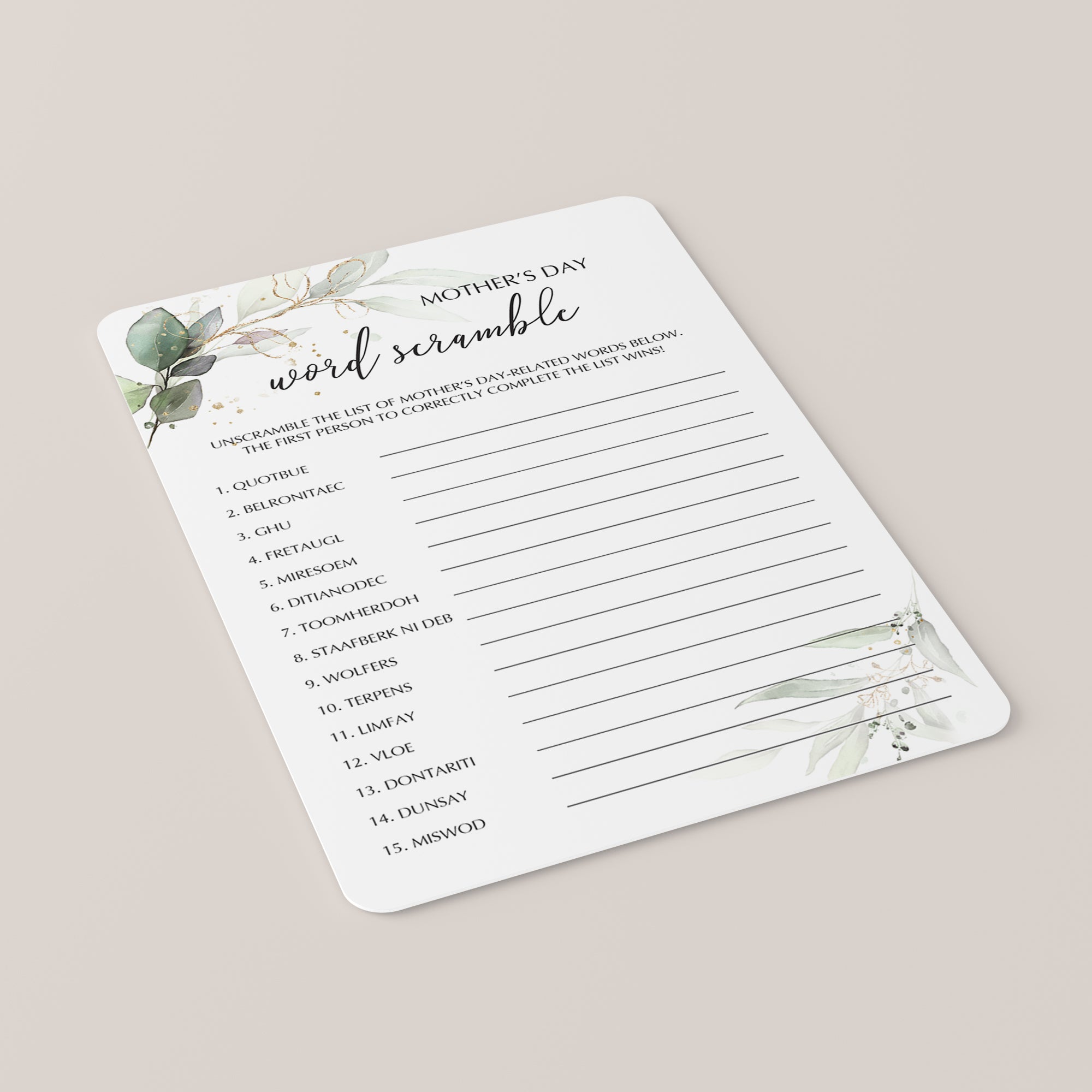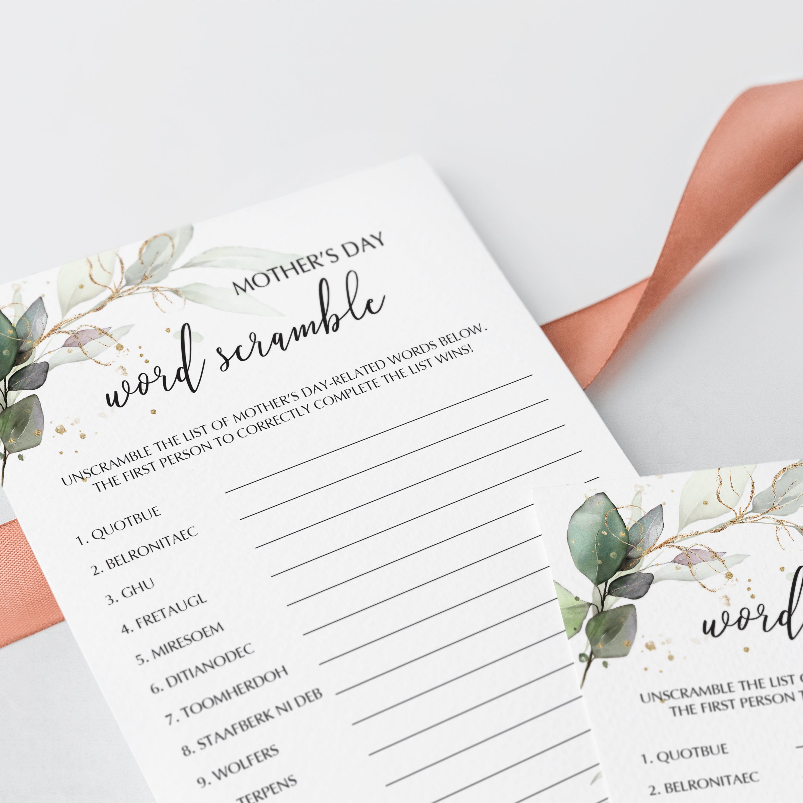 Are you looking for fun Mother's Day game? Play Mothers Day Word Scramble with this gorgeous gold and greenery game card. This Mother's Day game is fun for all ages.