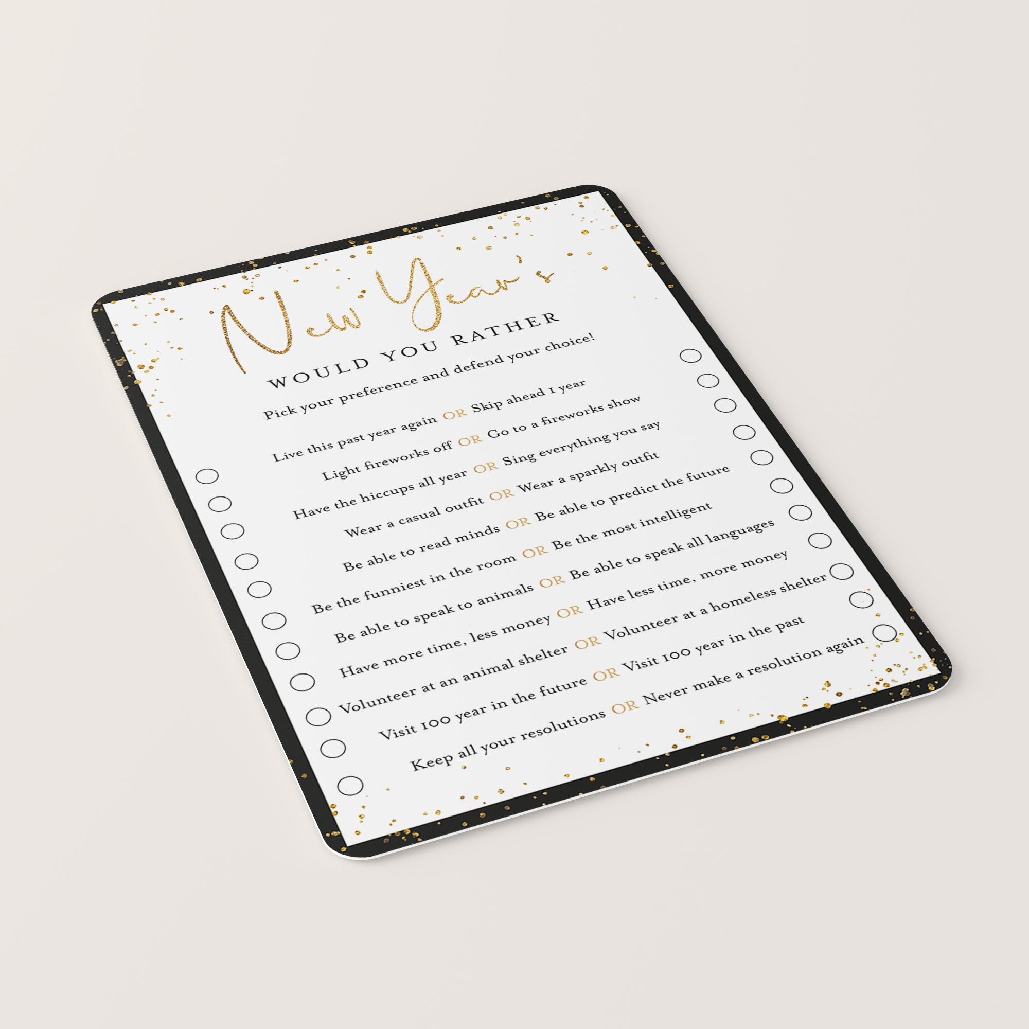 Are you looking for a fun icebreaker game for your New Year's Eve party? Play Would You Rather. It's is a great conversation starter and will definitely get your guests mingling and laughing. This black and gold New Year's Would You Rather game has 11 this or that questions. Have your guests pick their preferences and defend their choice. Would you rather live this past year again or skip ahead one year?