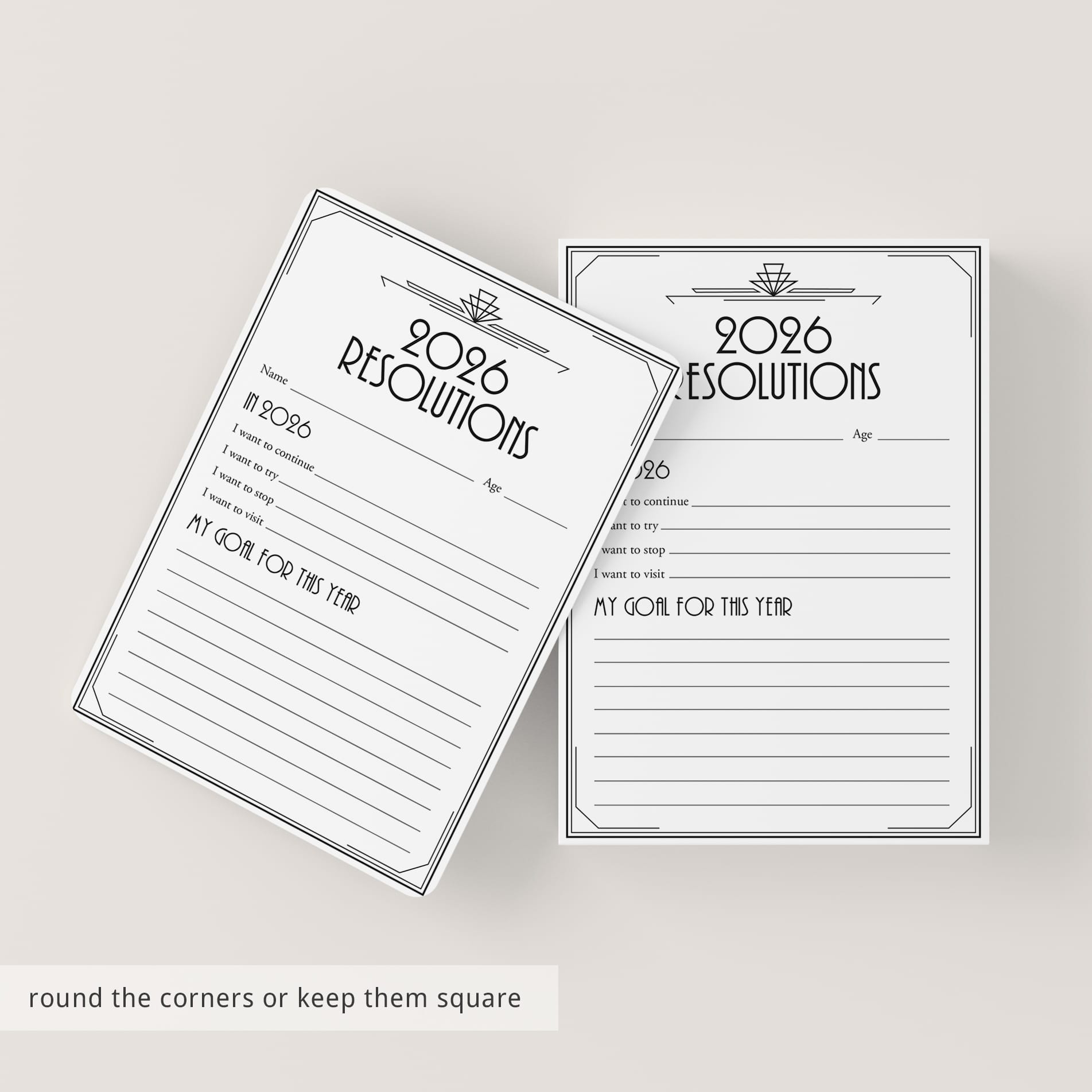 Write down your resolutions and goals for 2026 with this Gatsby New Years Party Resolutions card.