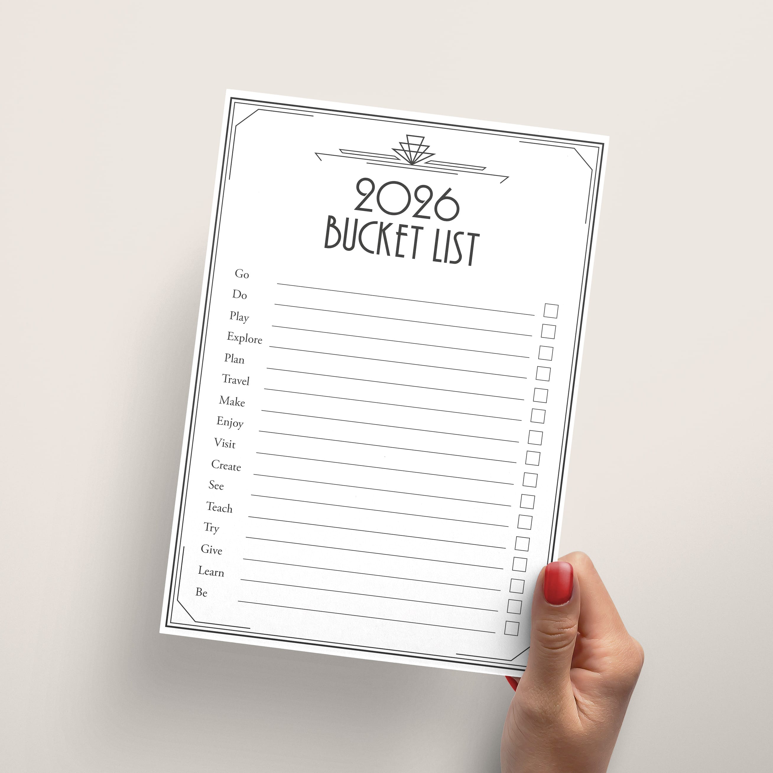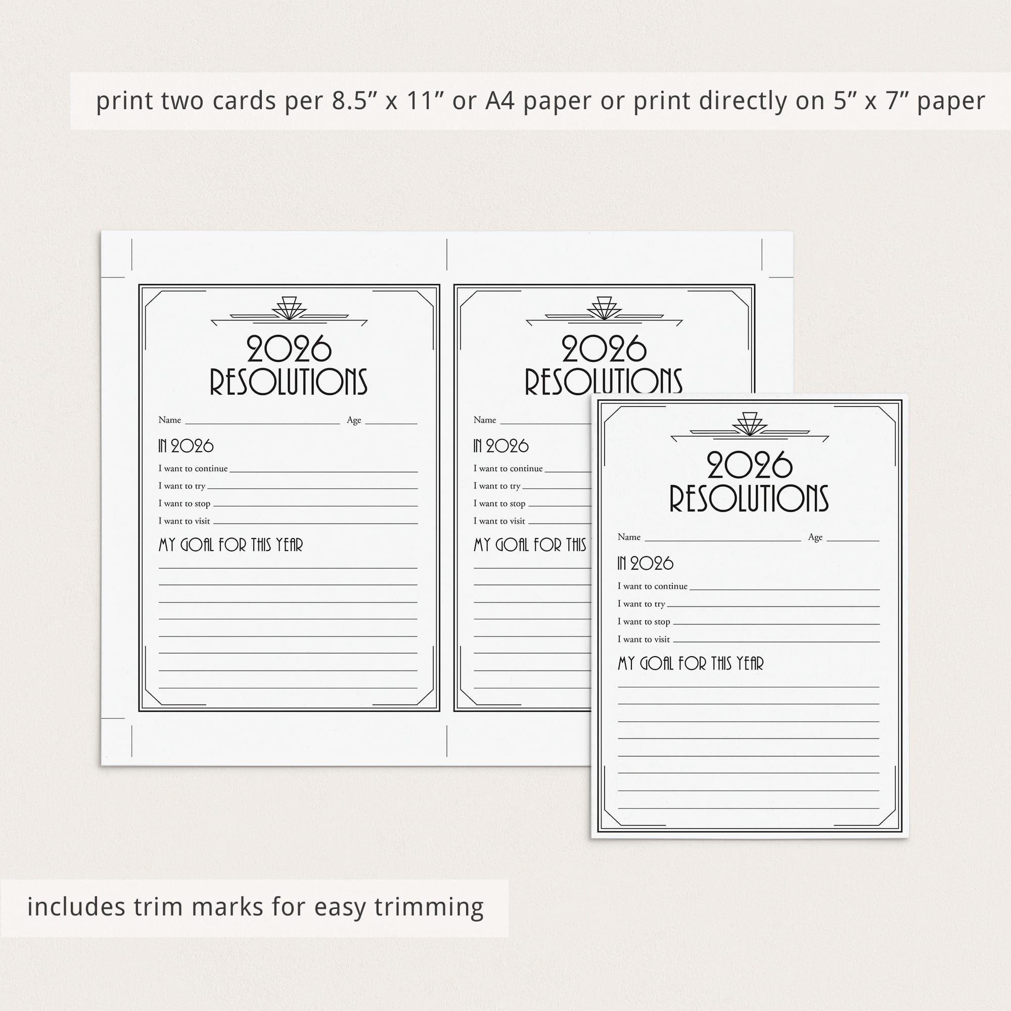 The Year in Review card will help you reflect on the past year. Write down your highlights of 2025, your best memories and your favorites of the year. Look ahead to the new year and write down your goals and resolutions for 2026 on the Resolutions card. The 2026 Bucket List card is a creative spin on New Year's resolutions. These art deco printables will be the perfect addition to your Gatsby New Year's Party.