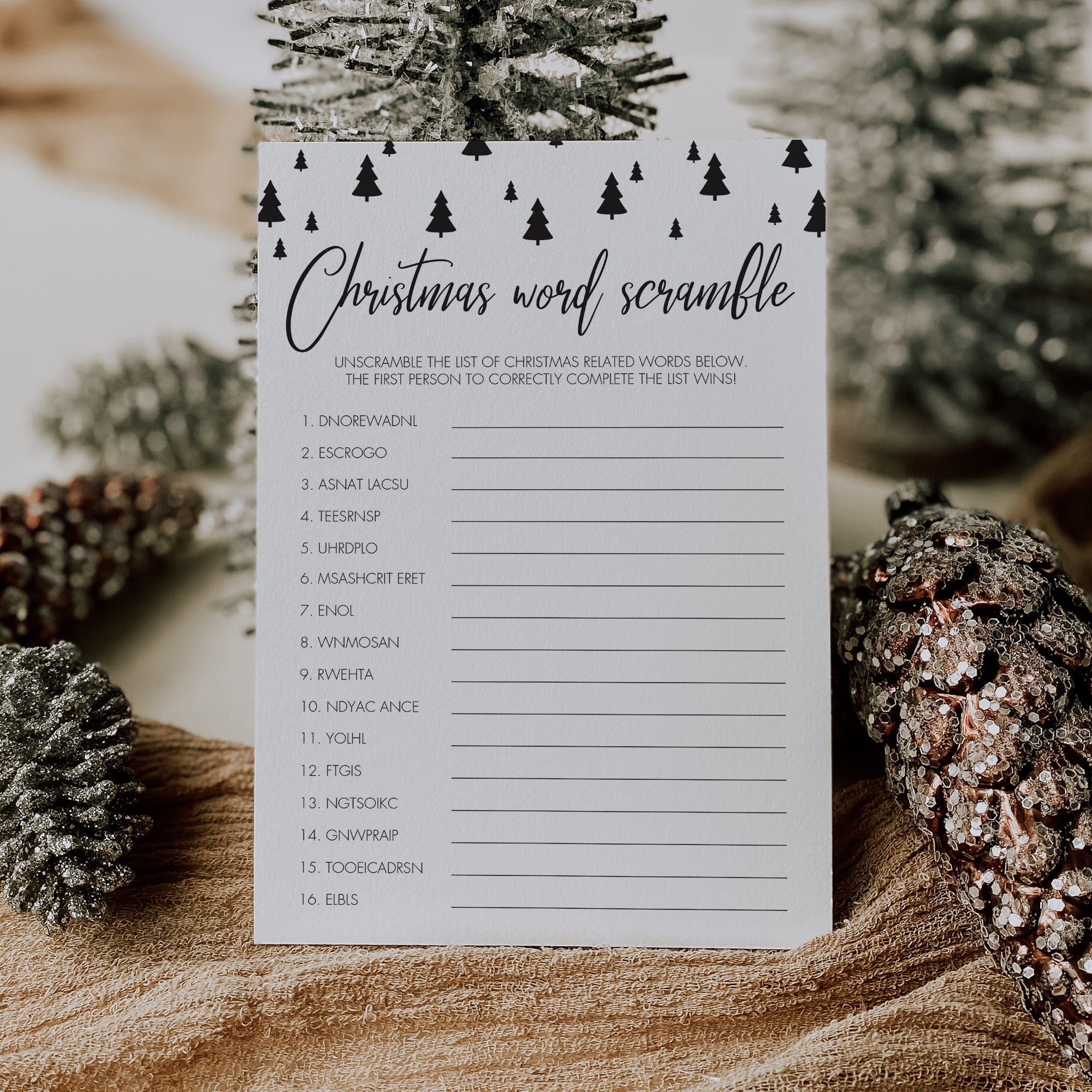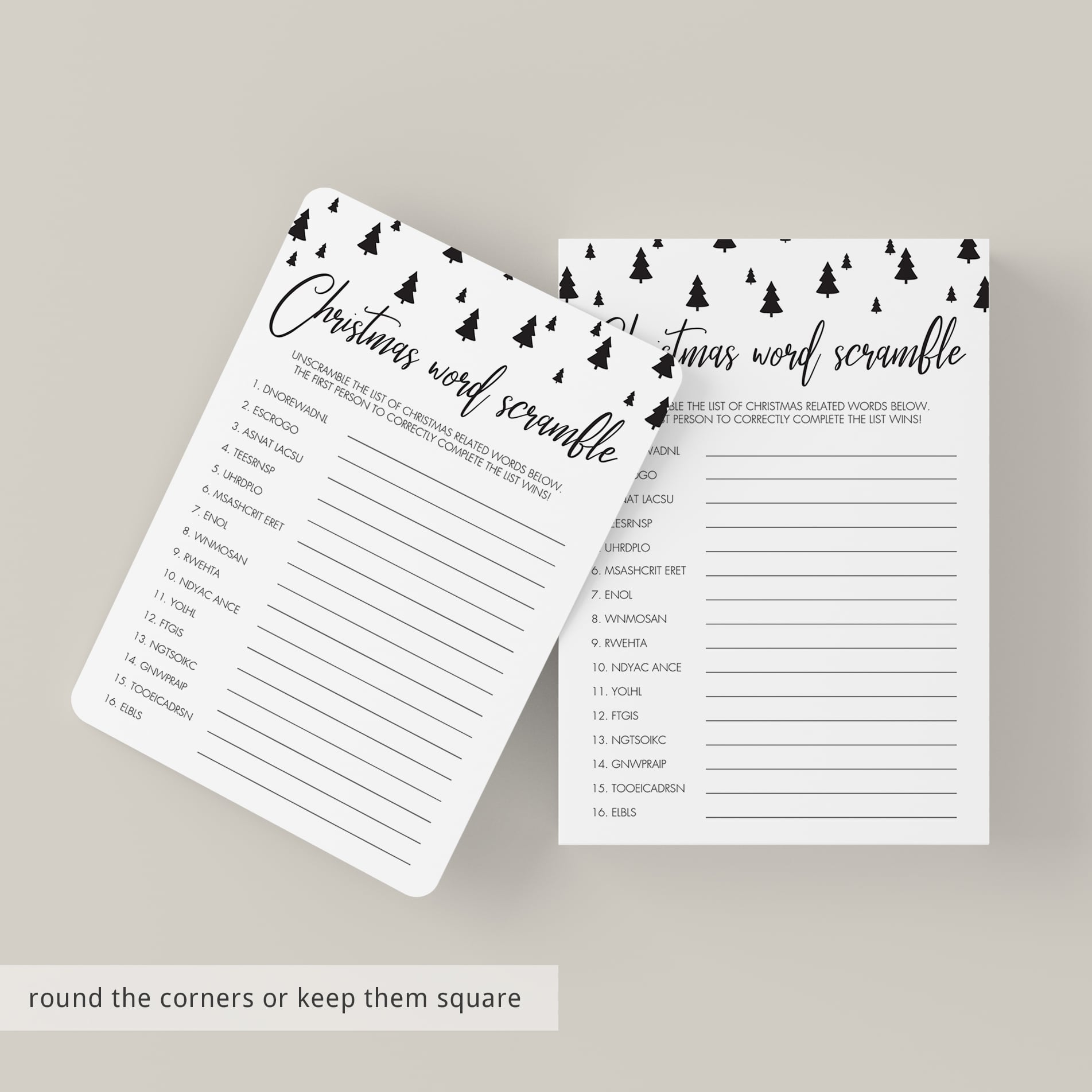 This Christmas game for kids is an instant download, so simply download and print the sheets as many times as you need. The game has been designed in black and white. Print on kraft paper to create a rustic look. You can print at the comfort of your home or order the games from a local or online print shop.