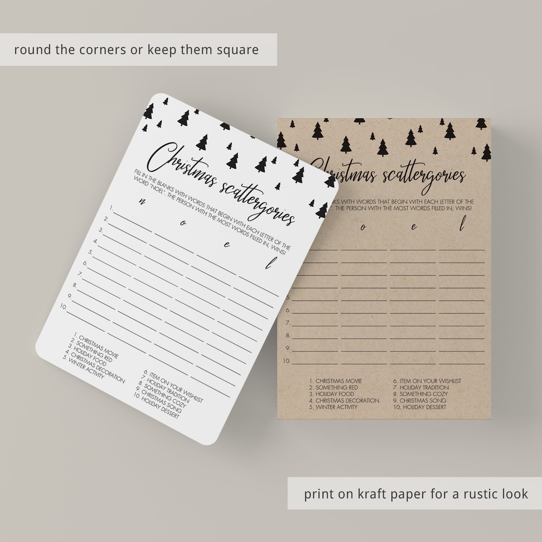How many words can you fill in with the letters "N", "O", "E" and "L"? Play Scattergories at your Christmas party with this minimal Xmas Scattergories game. The Scandinavian design with black pine trees will ensure that you have those special winter vibes at your xmas party.