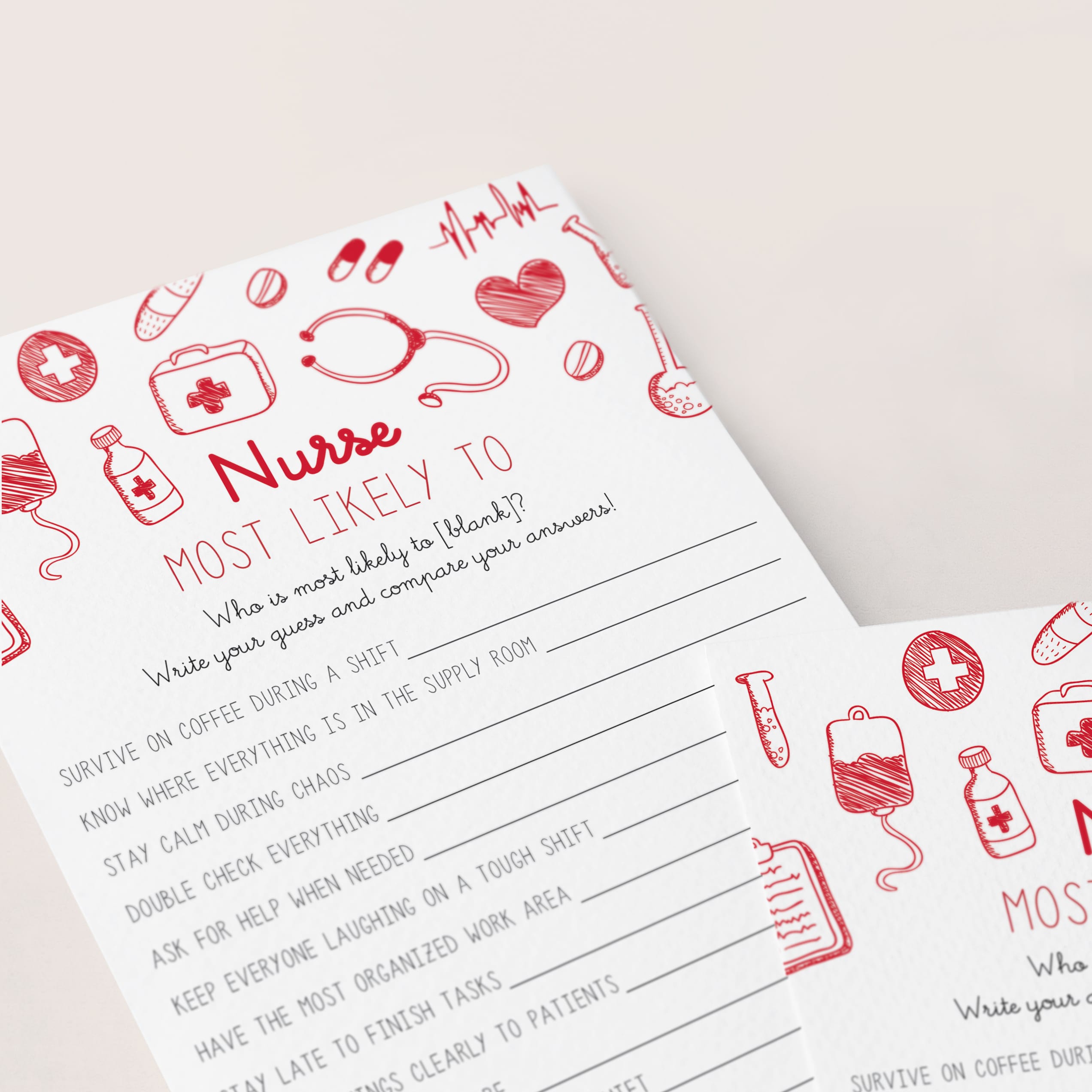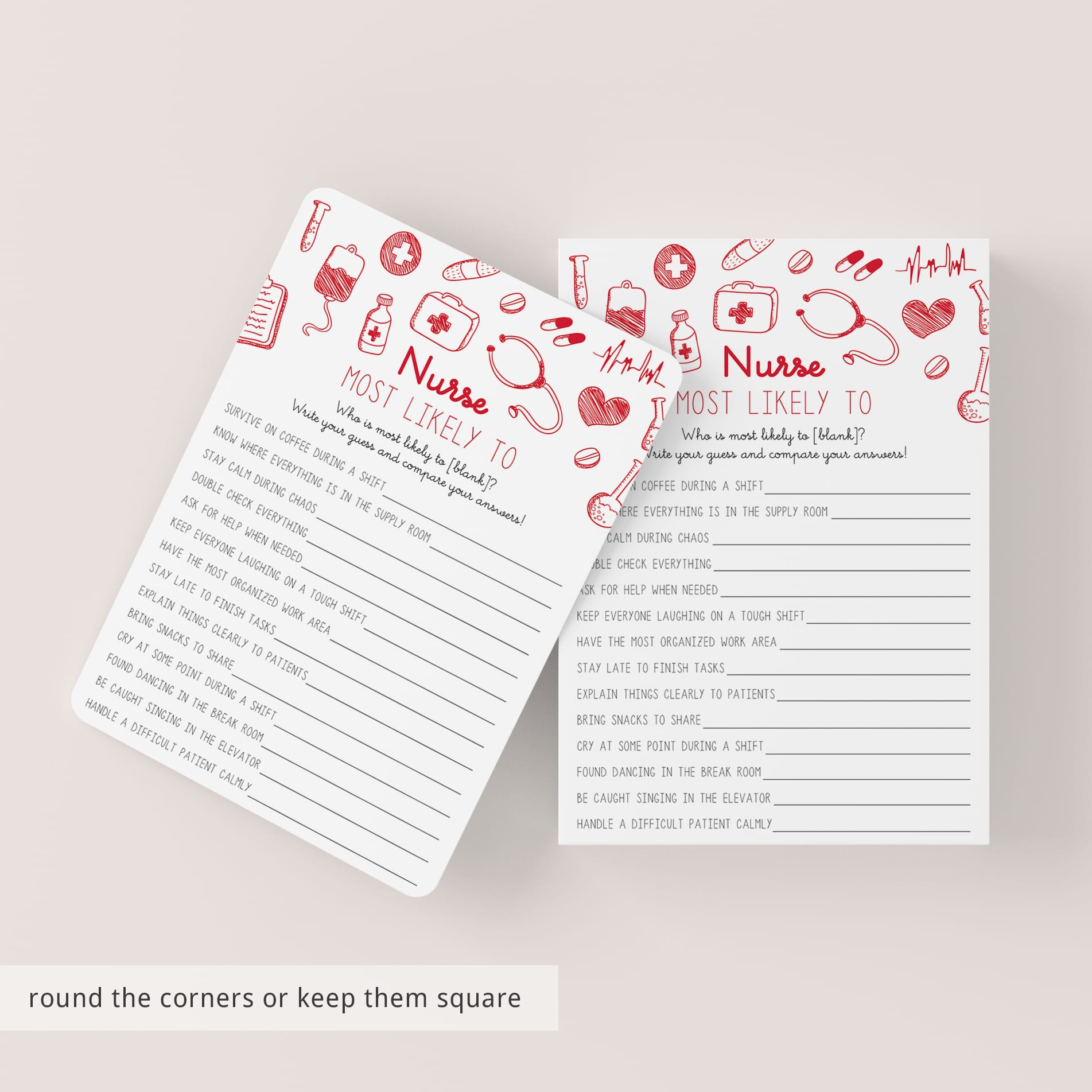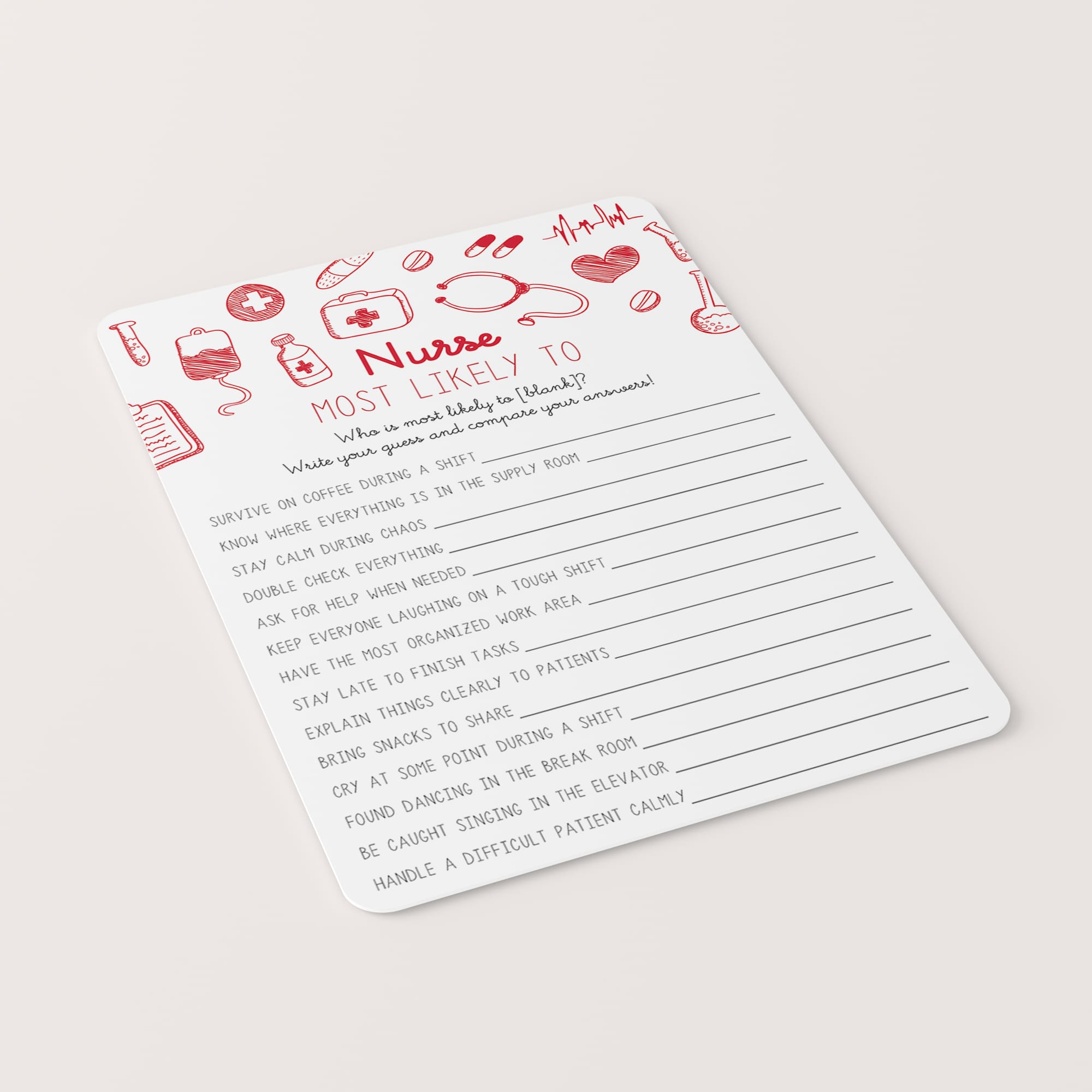 Looking for a fun game that sparks laughter and conversation at your nurse party or medical themed event? Play this funny Nurse Most Likely To Game. This entertaining game includes 14 “Most Likely To” questions designed to get everyone talking and laughing. Who is most likely to handle a difficult patient calmly? And who is most likely to bring snacks? It’s a playful way to learn new things about your colleagues and enjoy some lighthearted fun together.