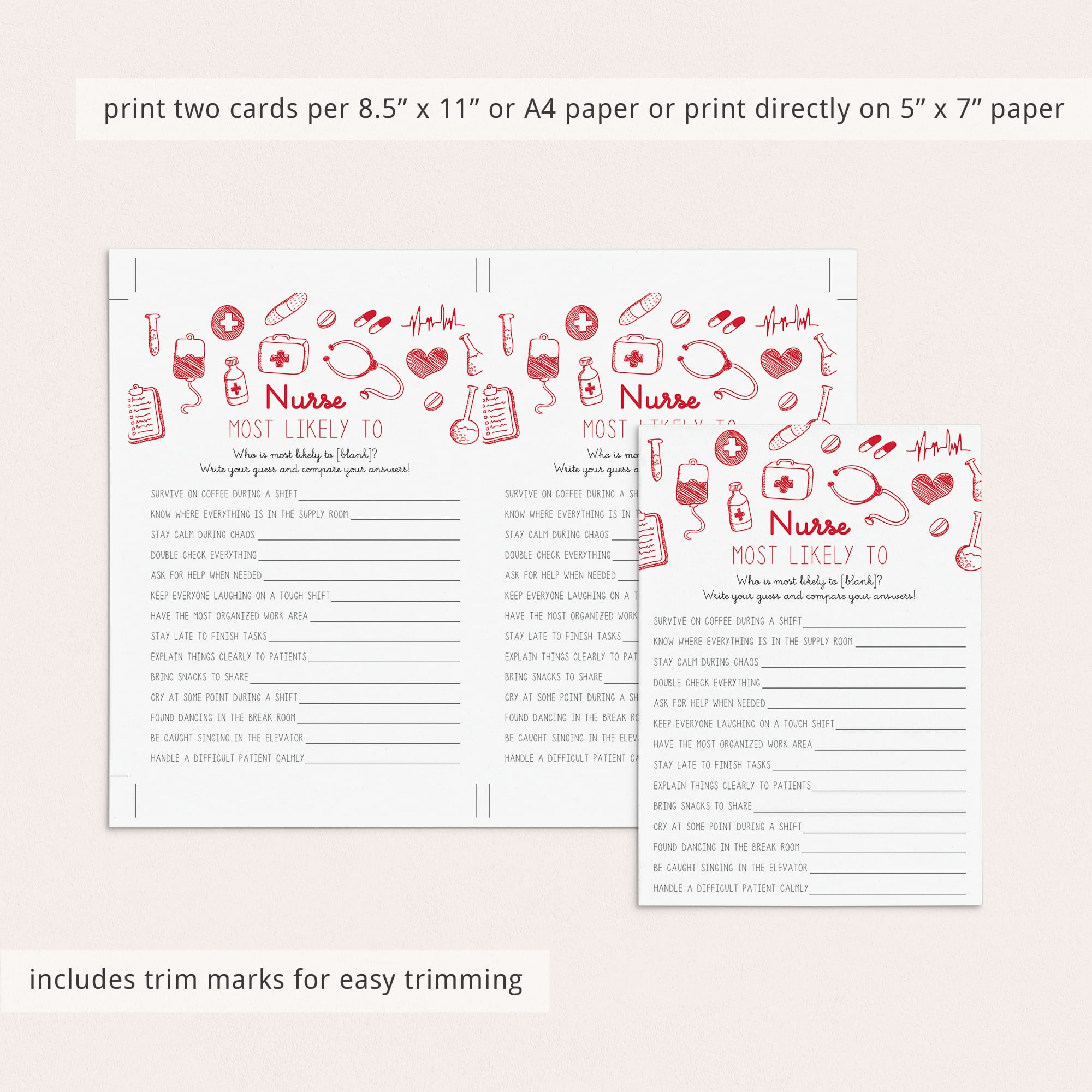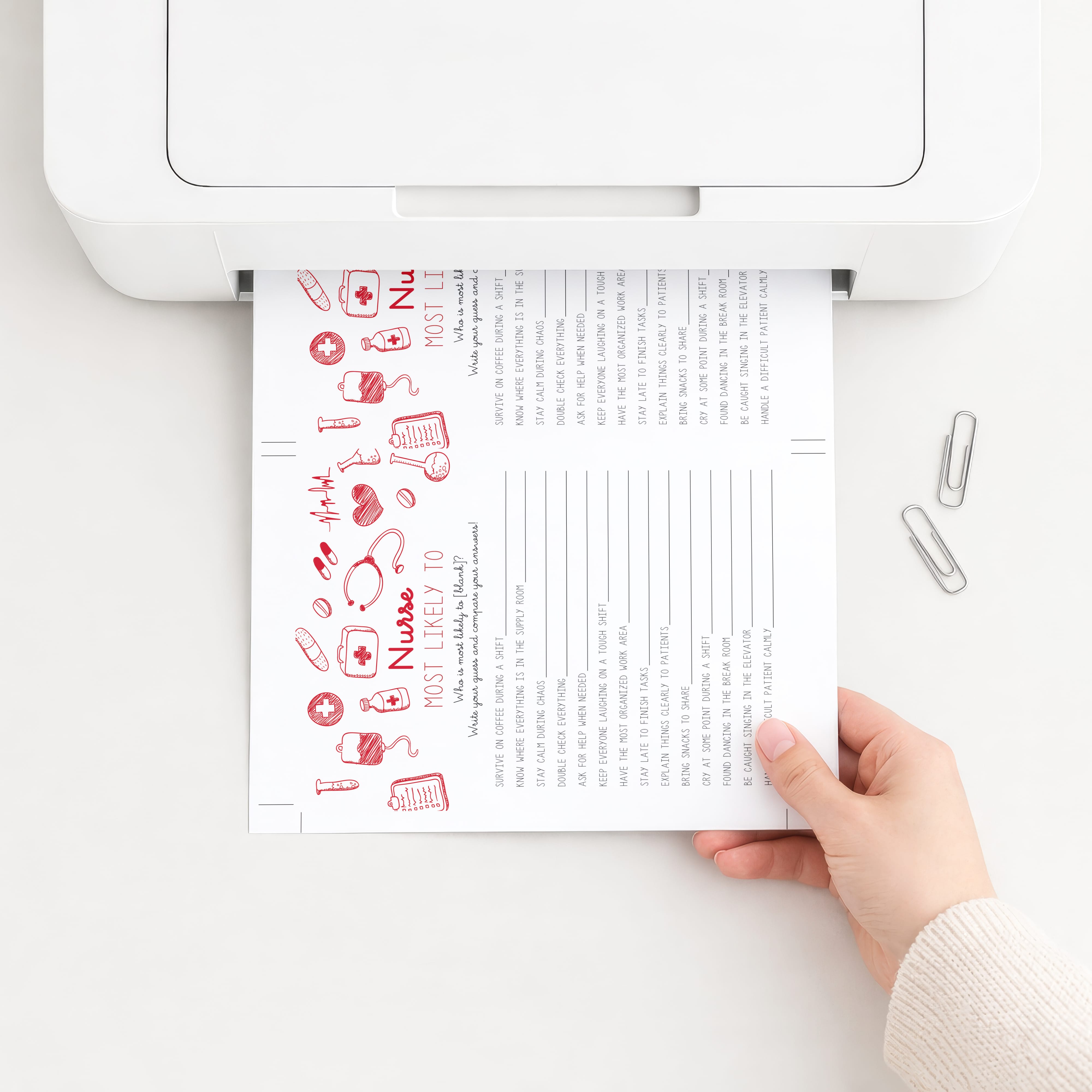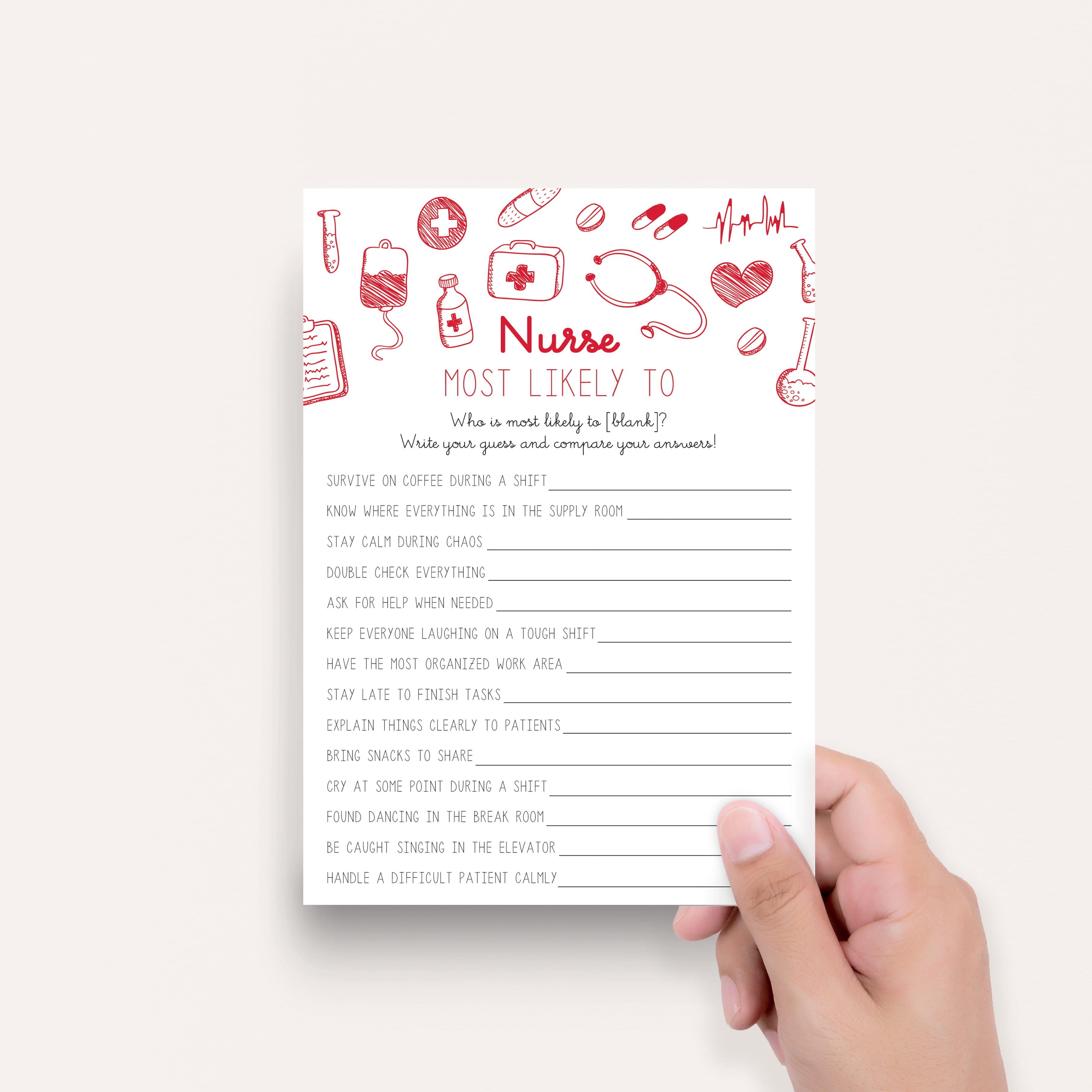 Looking for a fun game that sparks laughter and conversation at your nurse party or medical themed event? Play this funny Nurse Most Likely To Game. This entertaining game includes 14 “Most Likely To” questions designed to get everyone talking and laughing. Who is most likely to handle a difficult patient calmly? And who is most likely to bring snacks? It’s a playful way to learn new things about your colleagues and enjoy some lighthearted fun together.
