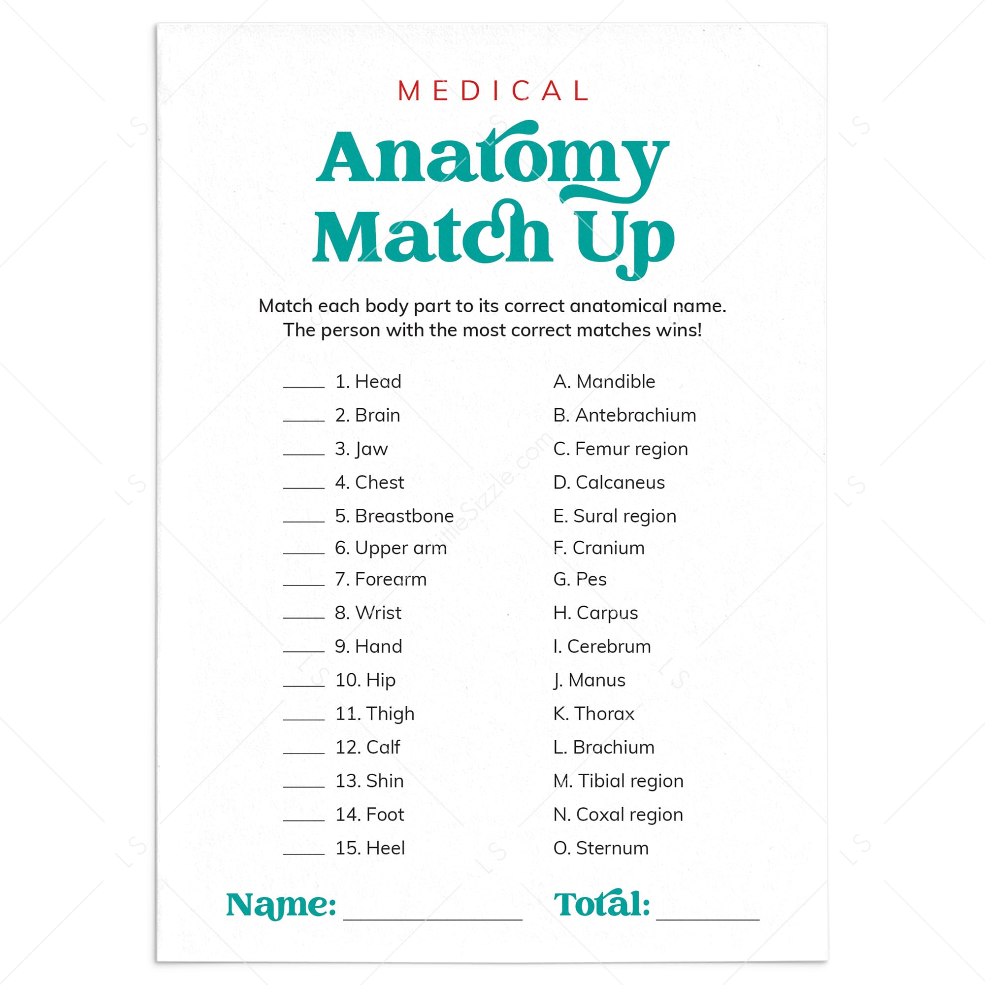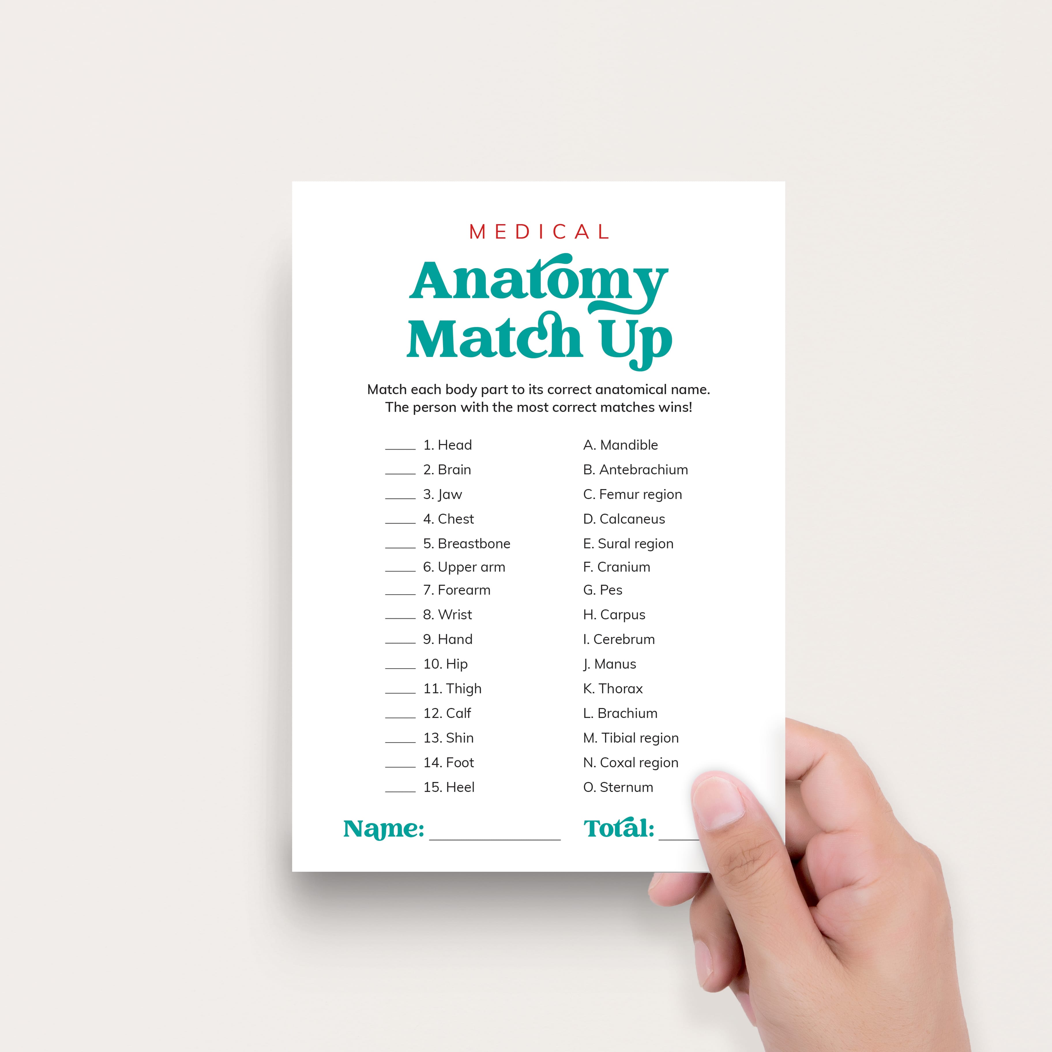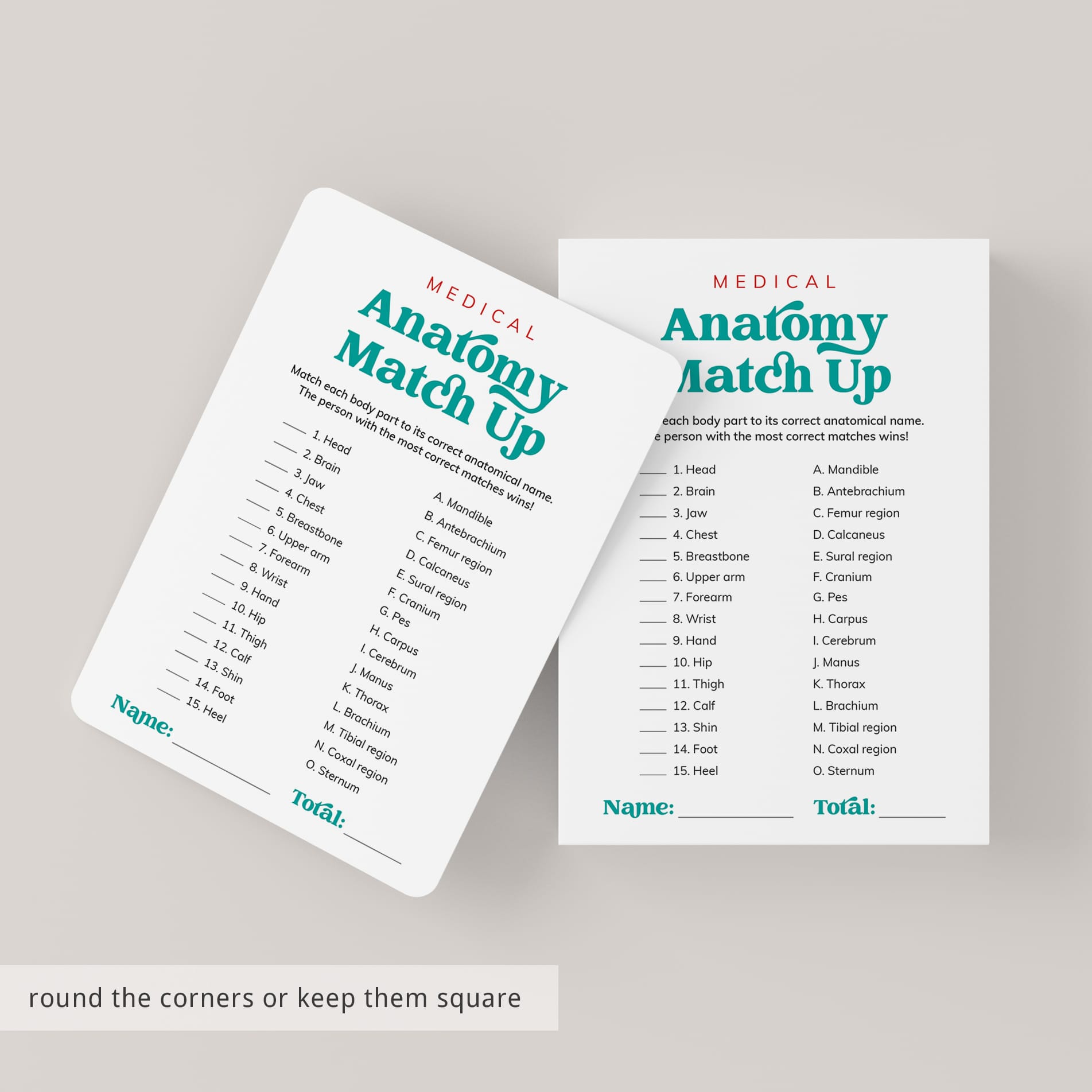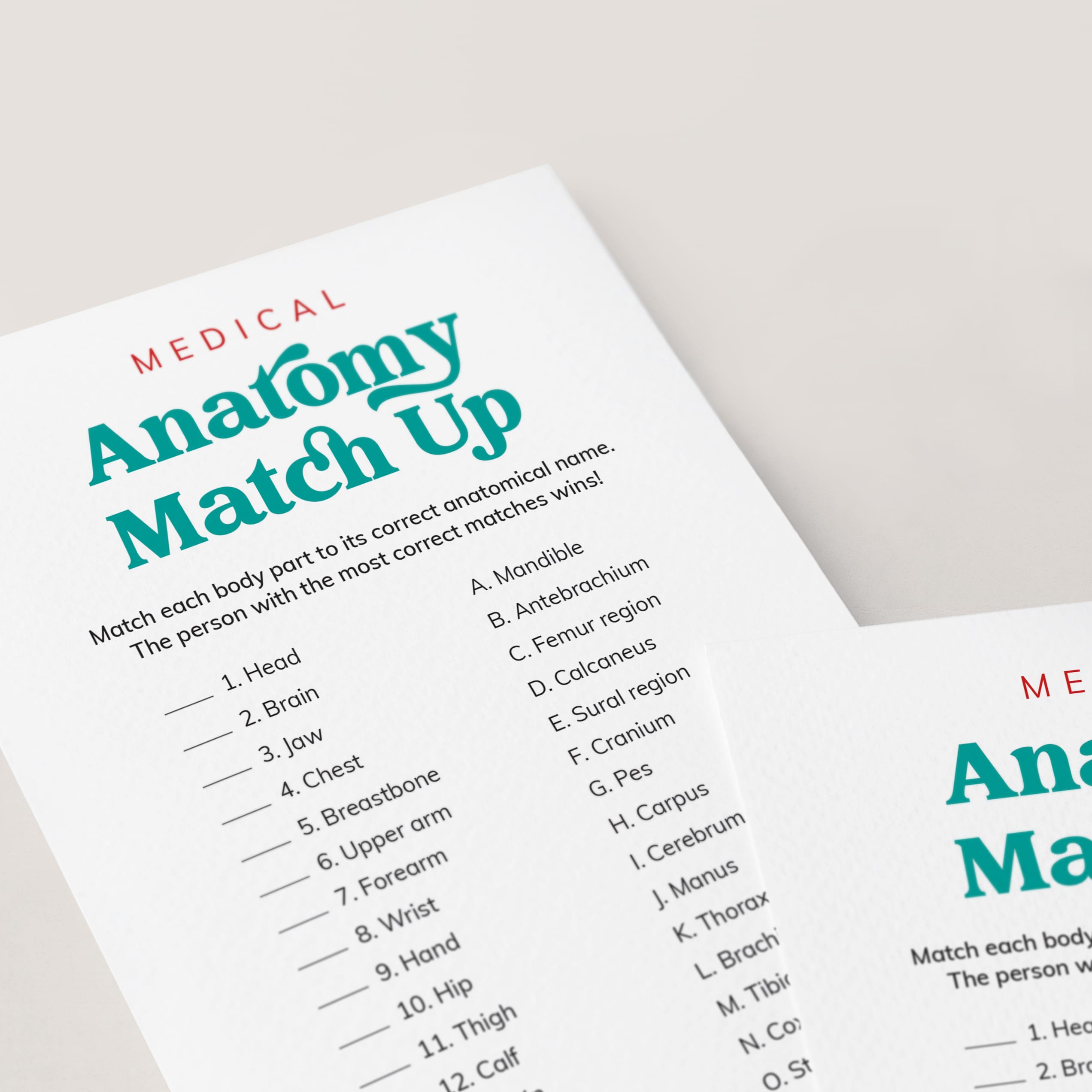 Challenge your knowledge of the human body with this Anatomy Match Up game. Match each body part to its correct anatomical name in this fun and educational game that’s perfect for students, nurse grads, a nurse retirement party, medical professionals, or anyone who loves anatomy. It’s a quick, engaging way to learn, test your skills, and spark friendly competition.