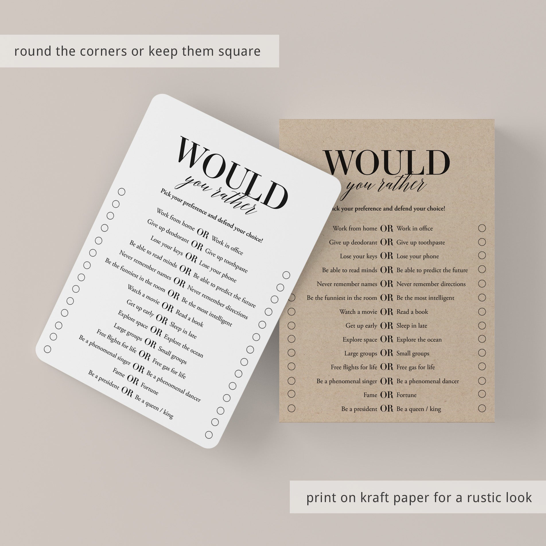 Print the games right from your computer in a matter of minutes or have the cards printed at your favorite print shop. The games have been designed in black and white. You can print on kraft paper to create a rustic look or print on colored card stock to match your party color palette. We recommend printing on a nice heavy card stock for highest quality feel.