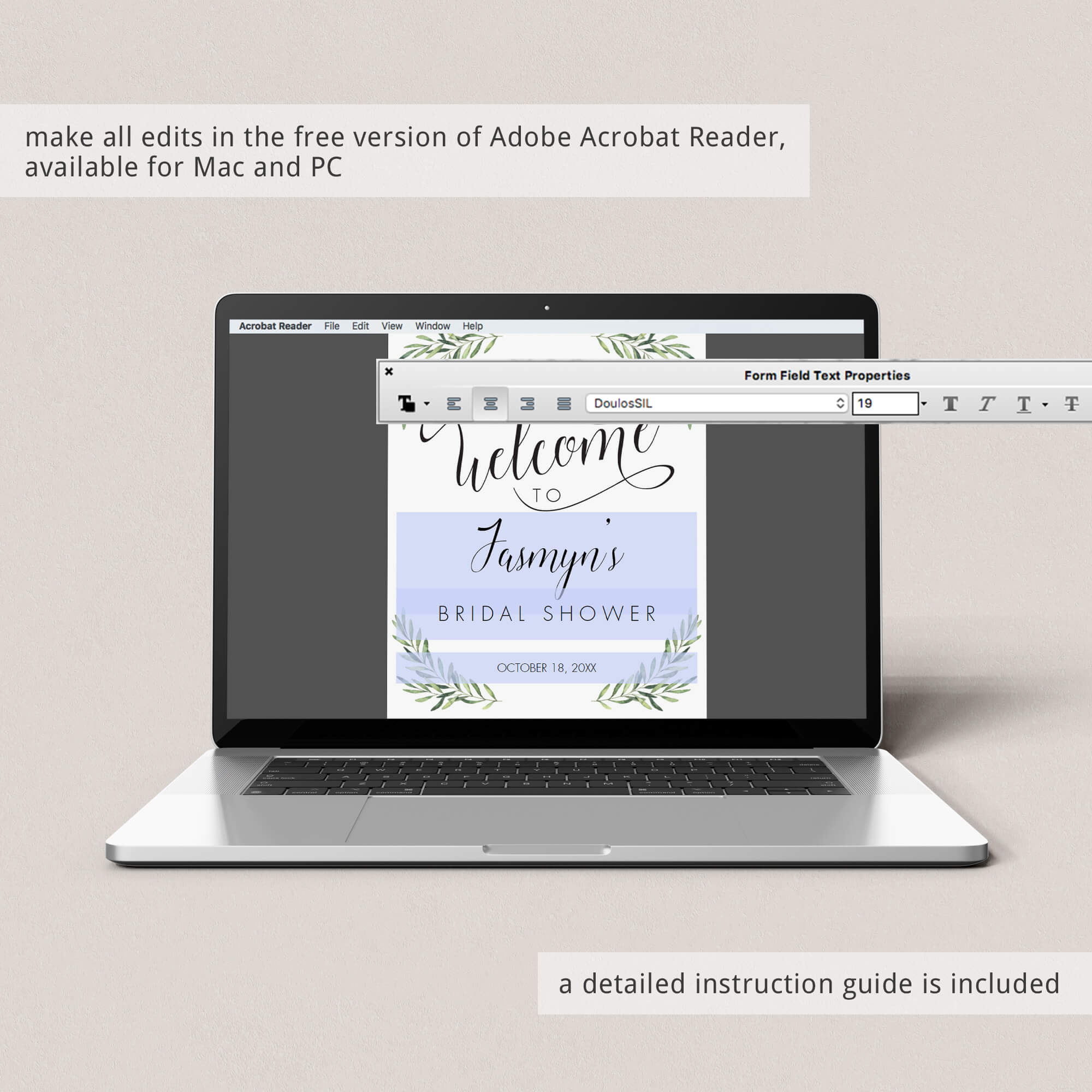 The Welcome sign is editable in the free version of Adobe Acrobat Reader, so that you can easily personalize it with the name of the bride-to-be and the date of the bridal shower. To make the process as smooth as possible, we've included a detailed instruction guide.