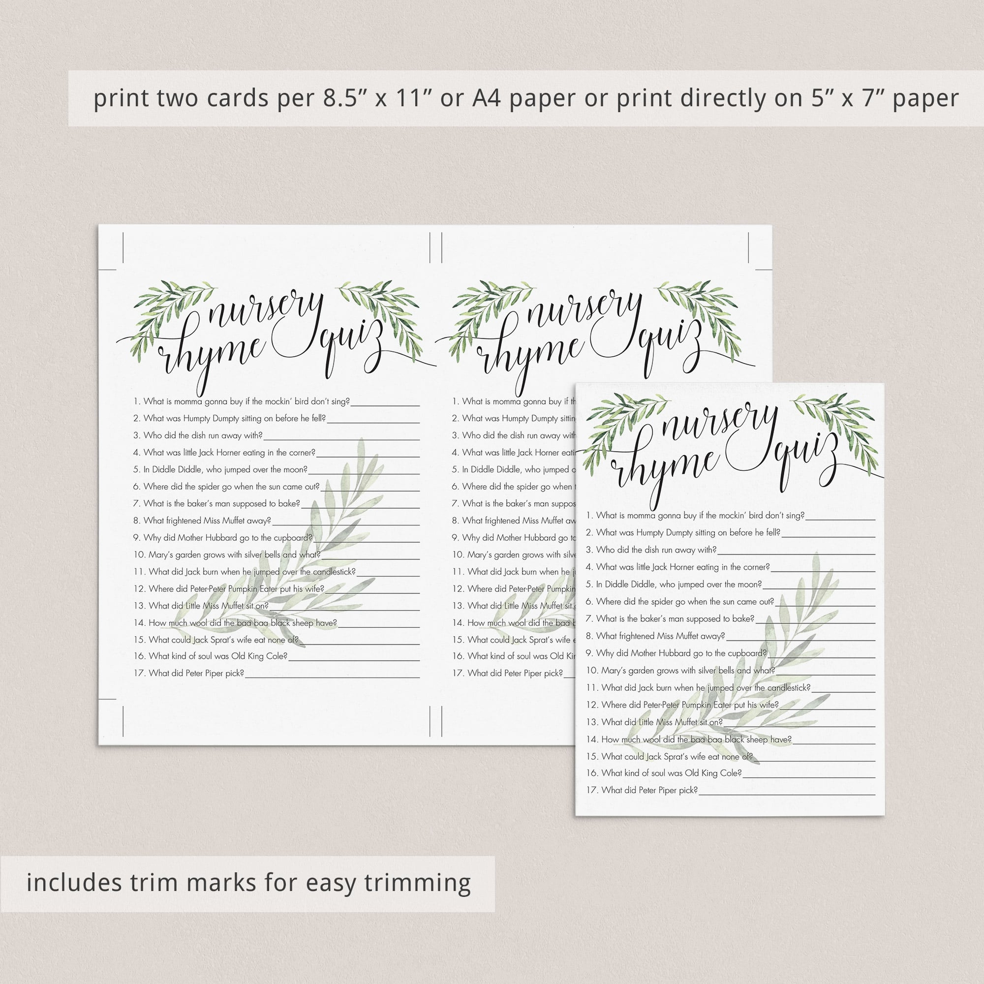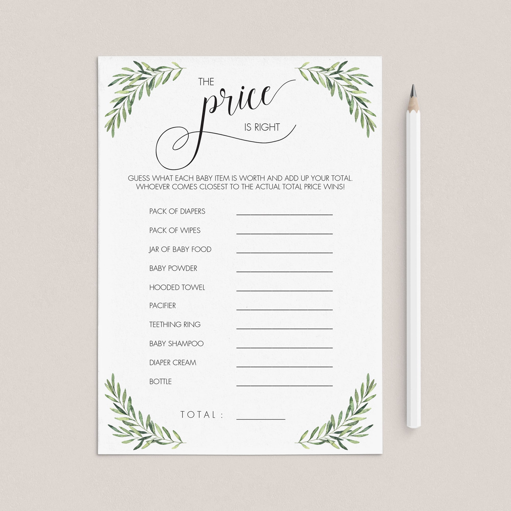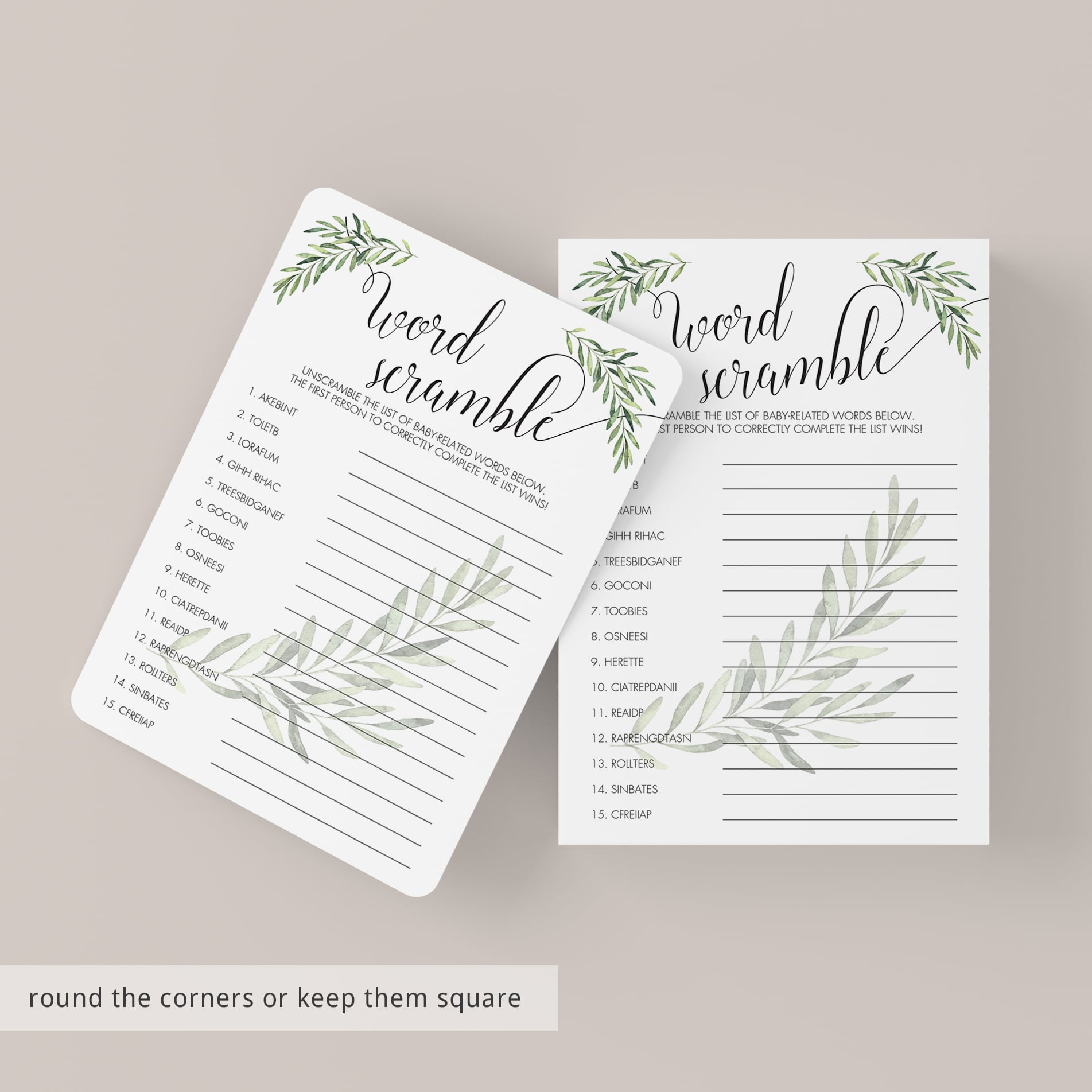 Entertain your baby shower guests with this gender neutral baby shower games package with watercolor olive branches. It is perfect for a neutral baby shower or botanical themed party. The package includes everything you need to entertain large groups with a variety of activities.