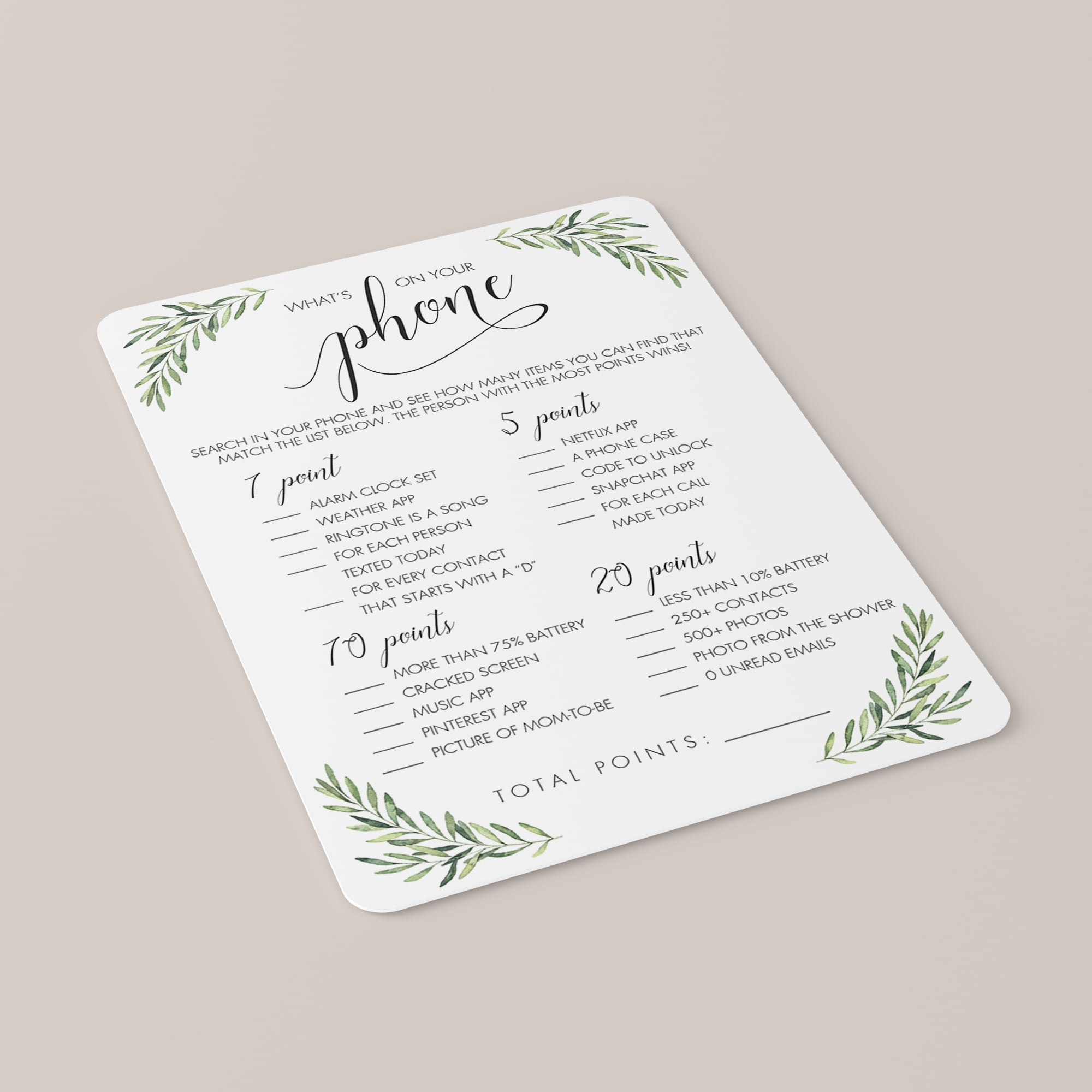 What’s On Your Phone is similar to the What’s In Your Purse game, but instead of searching for the items physically, your guests will just search for the listed items using their phone. They earn points for each item that they have in their phone.