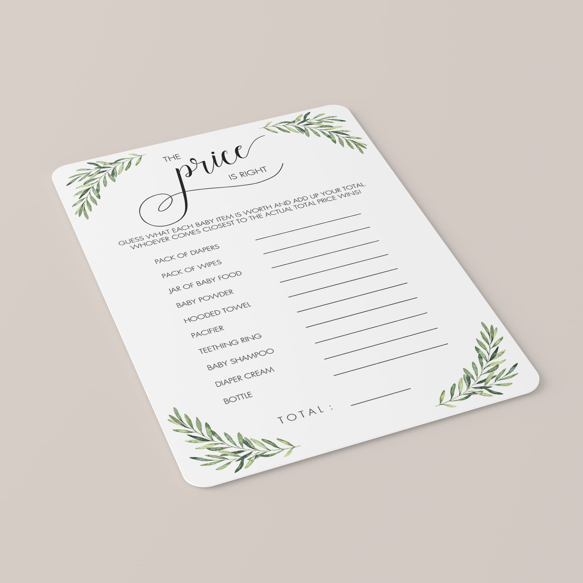 Play The Price is Right at your baby shower with these botanical game cards with olive branches. The neutral cards would be perfect for a garden baby shower and will create an enjoyable moment for all of your guests.