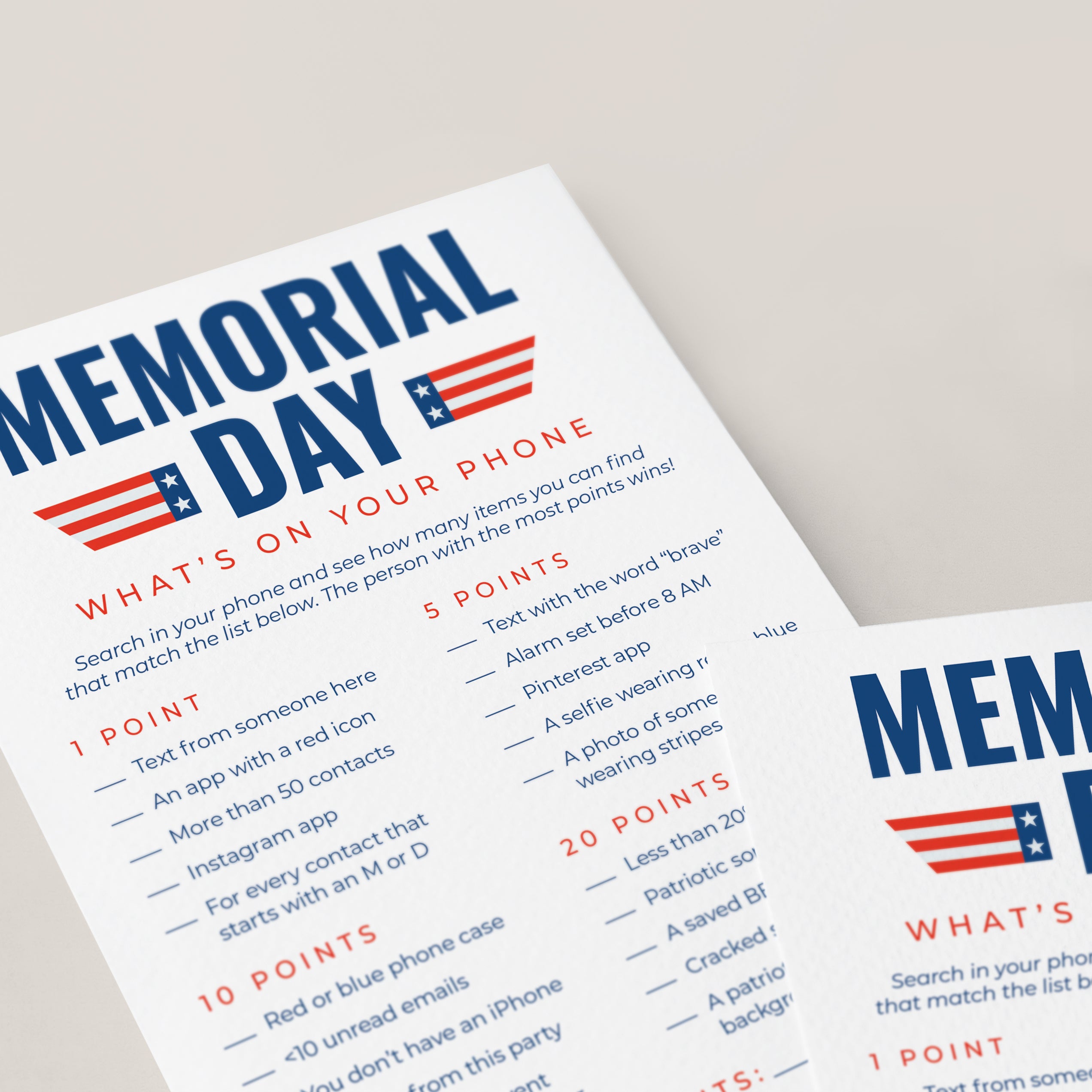 What’s On Your Phone is similar to the What’s In Your Purse game, but instead of searching for the items physically, your friends will just search for the listed items using their phone. They earn points for each item that they have in their phone. Things like having a red or blue phone case, a text with the word "brave" a Memorial Day event saved in their calender and much, much more. The person with the most points, wins!