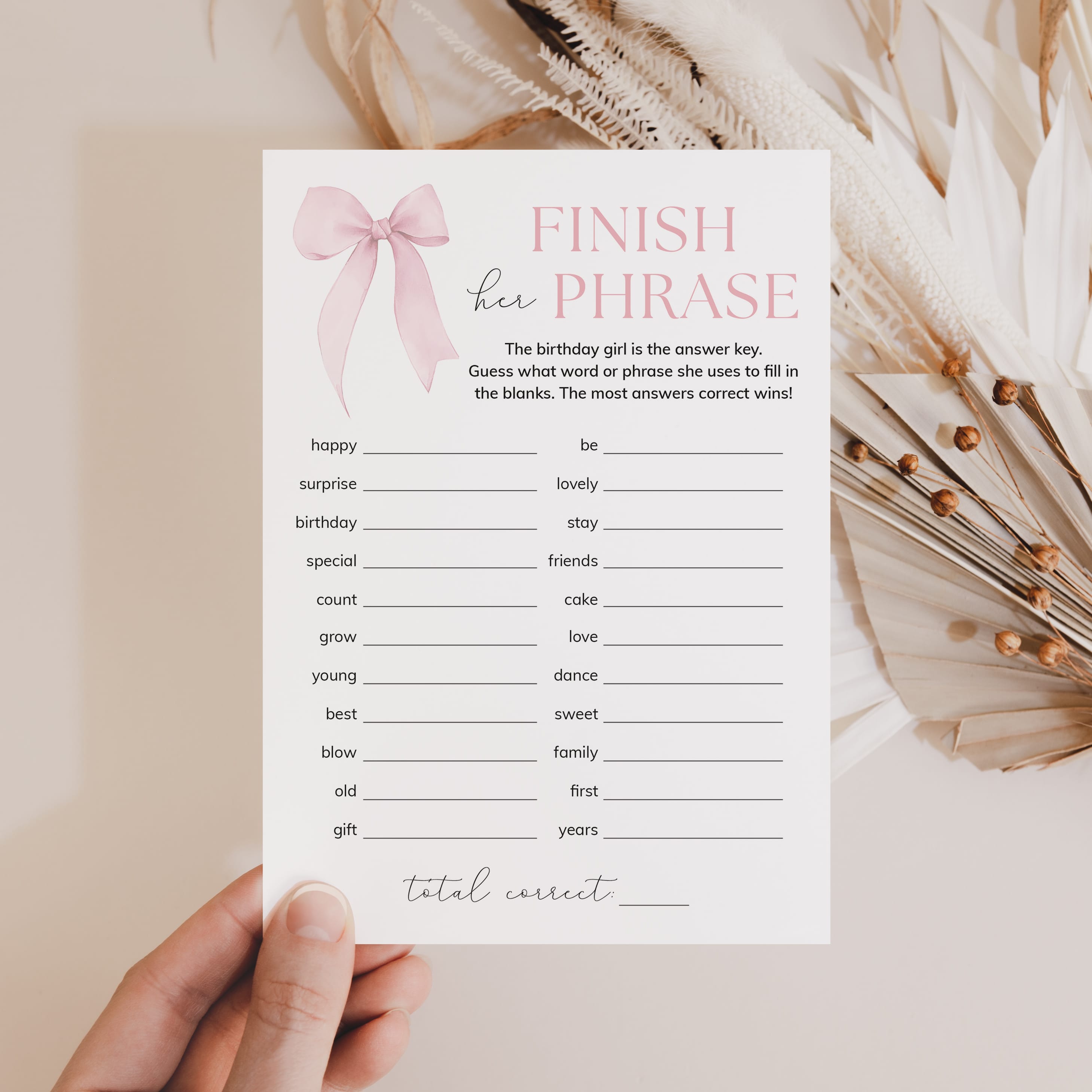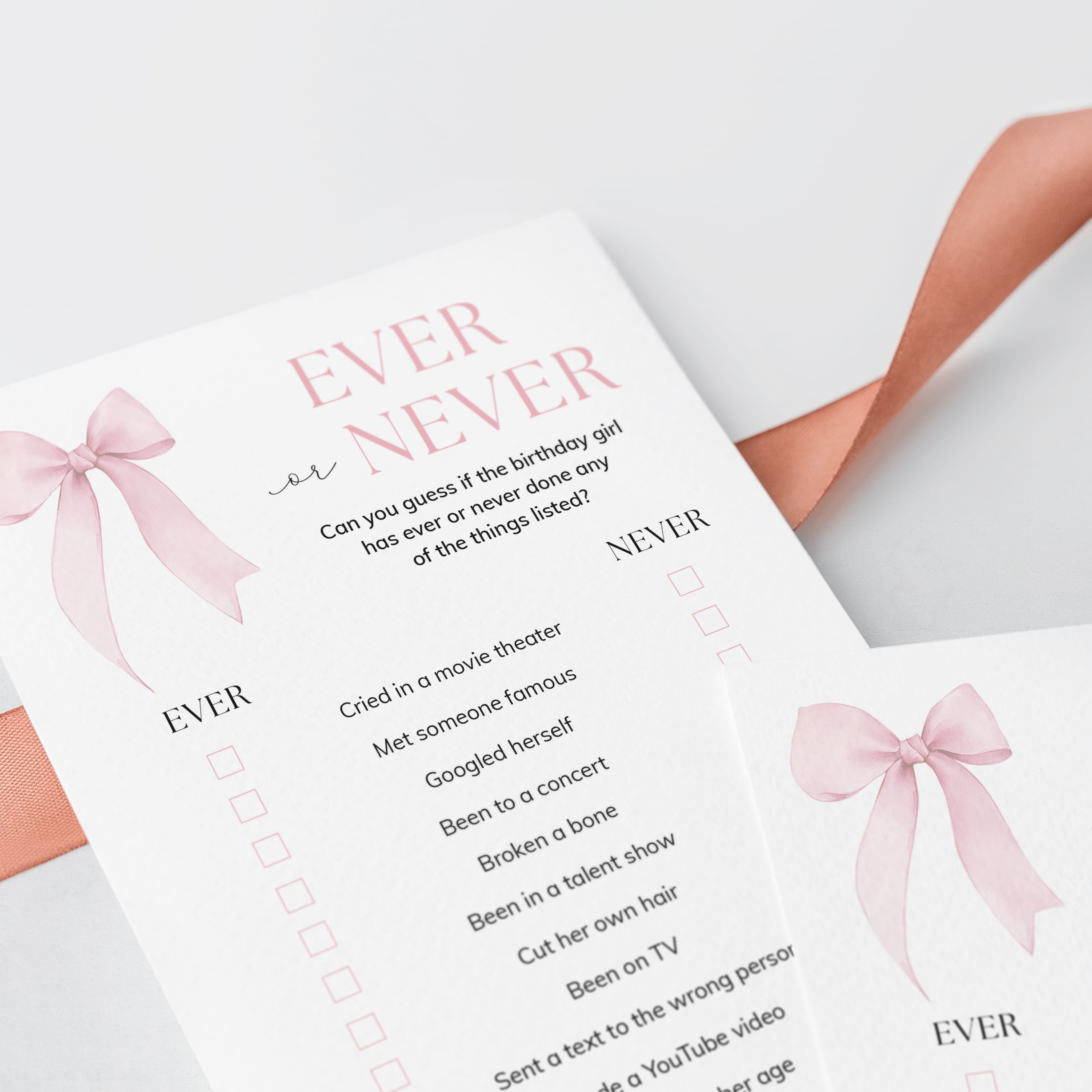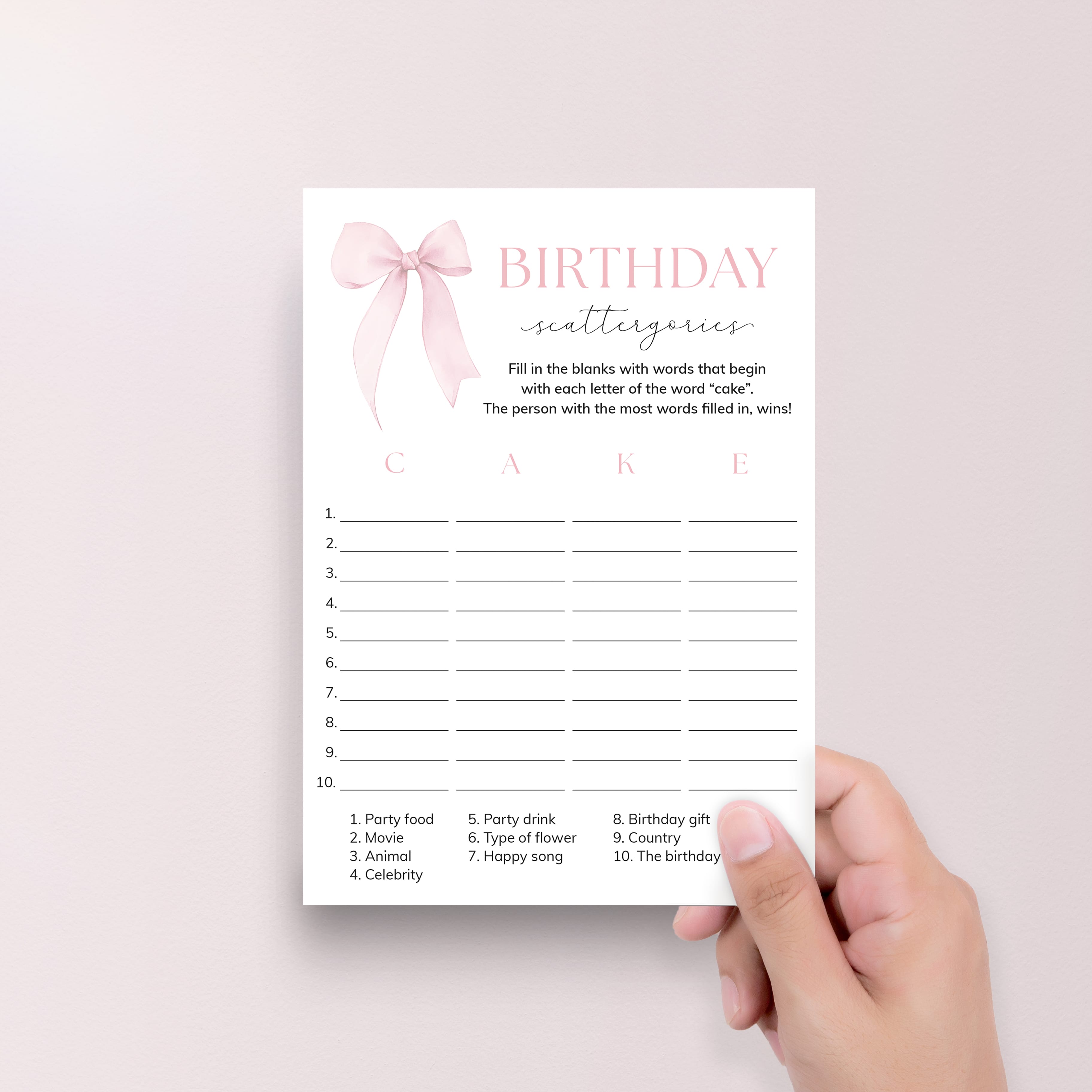 Celebrate her Sweet Sixteen in style with this elegant Birthday Games Pack, featuring a charming watercolor pink bow. Designed to add a girly yet sophisticated touch to her special day, this set includes a variety of fun and engaging games that will entertain guests and create unforgettable memories. Perfect for making her milestone birthday even more special!