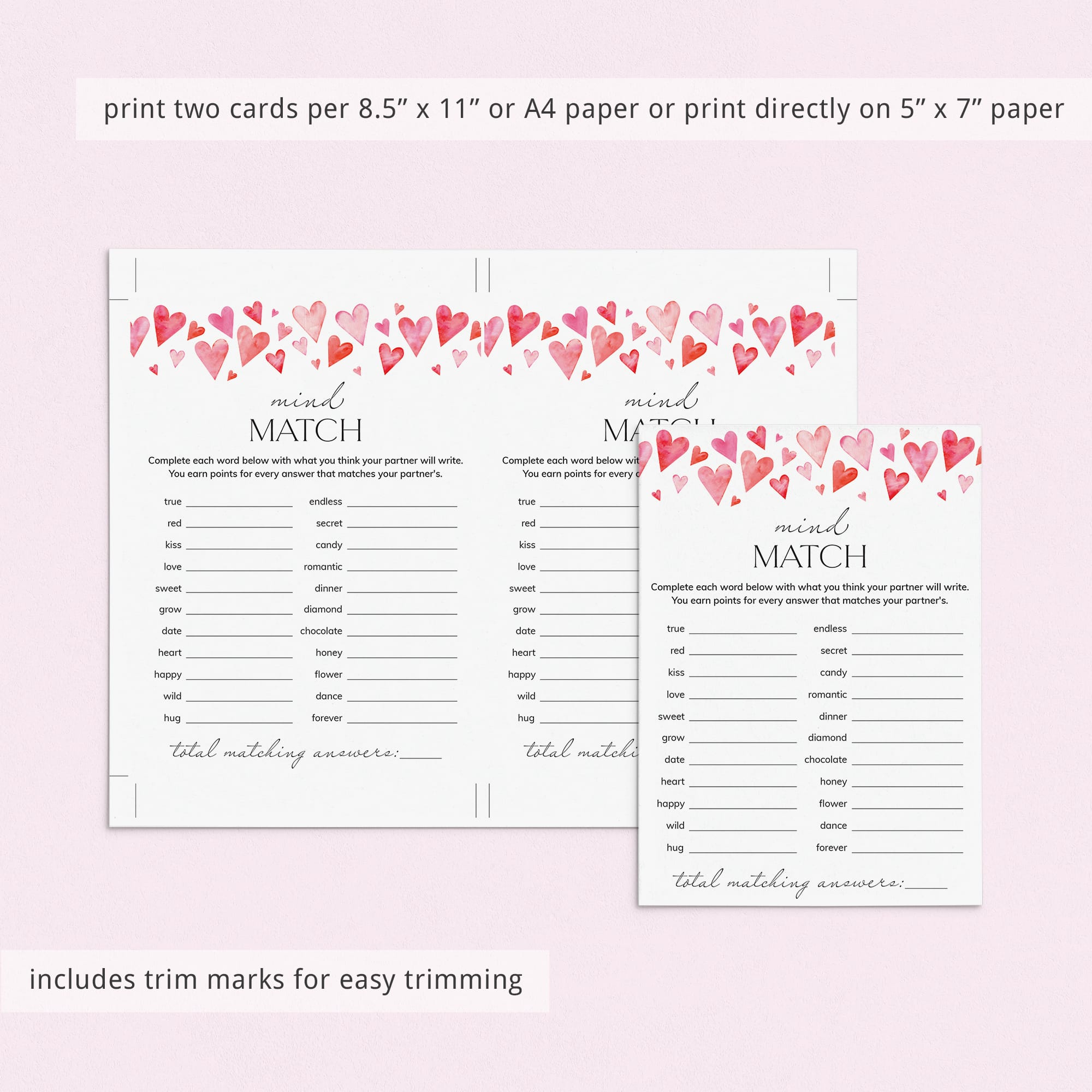 See how well you and your significant other really know each other and play Mind Match. It's a fun game for your next date night, anniversary or Valentine's Party and very easy to play.