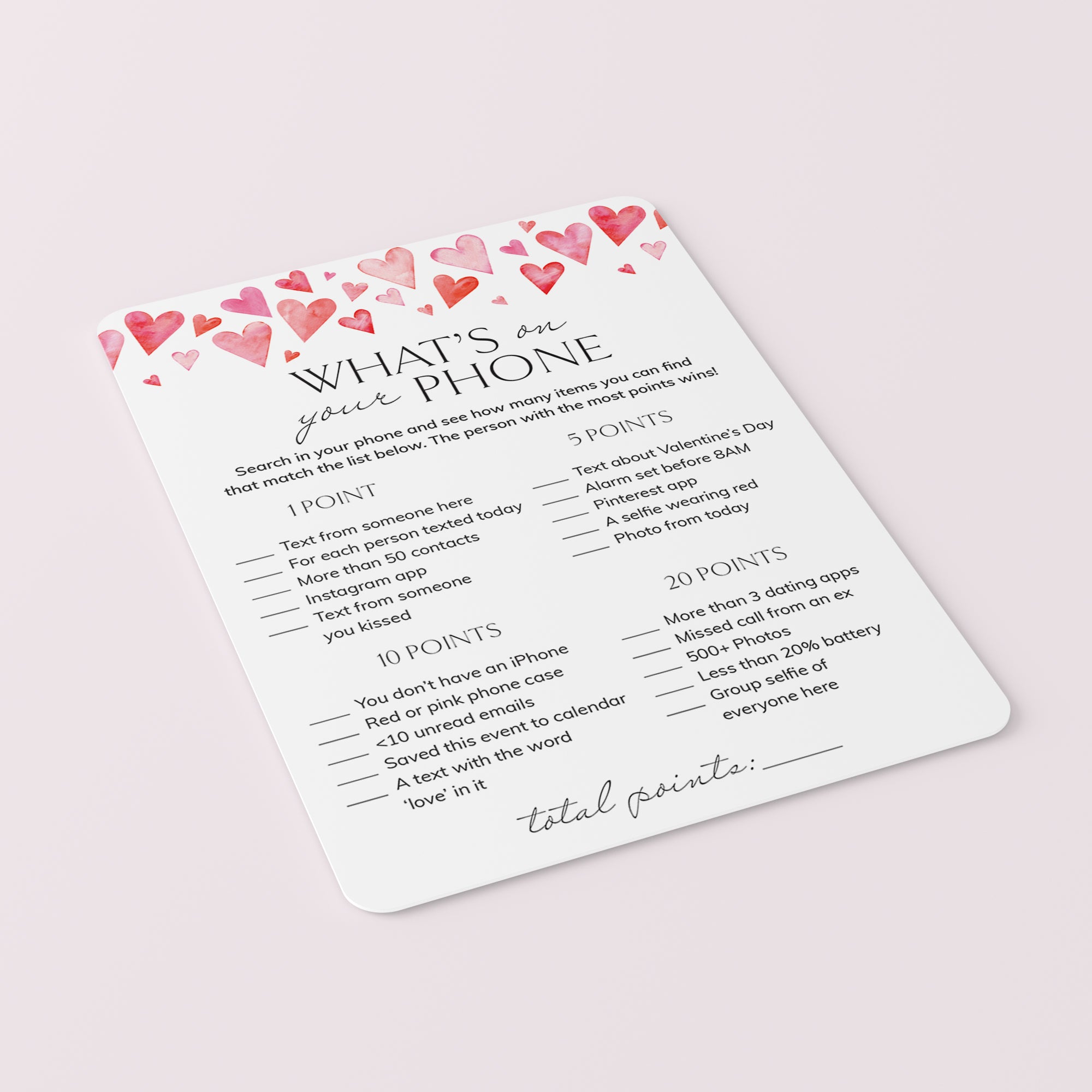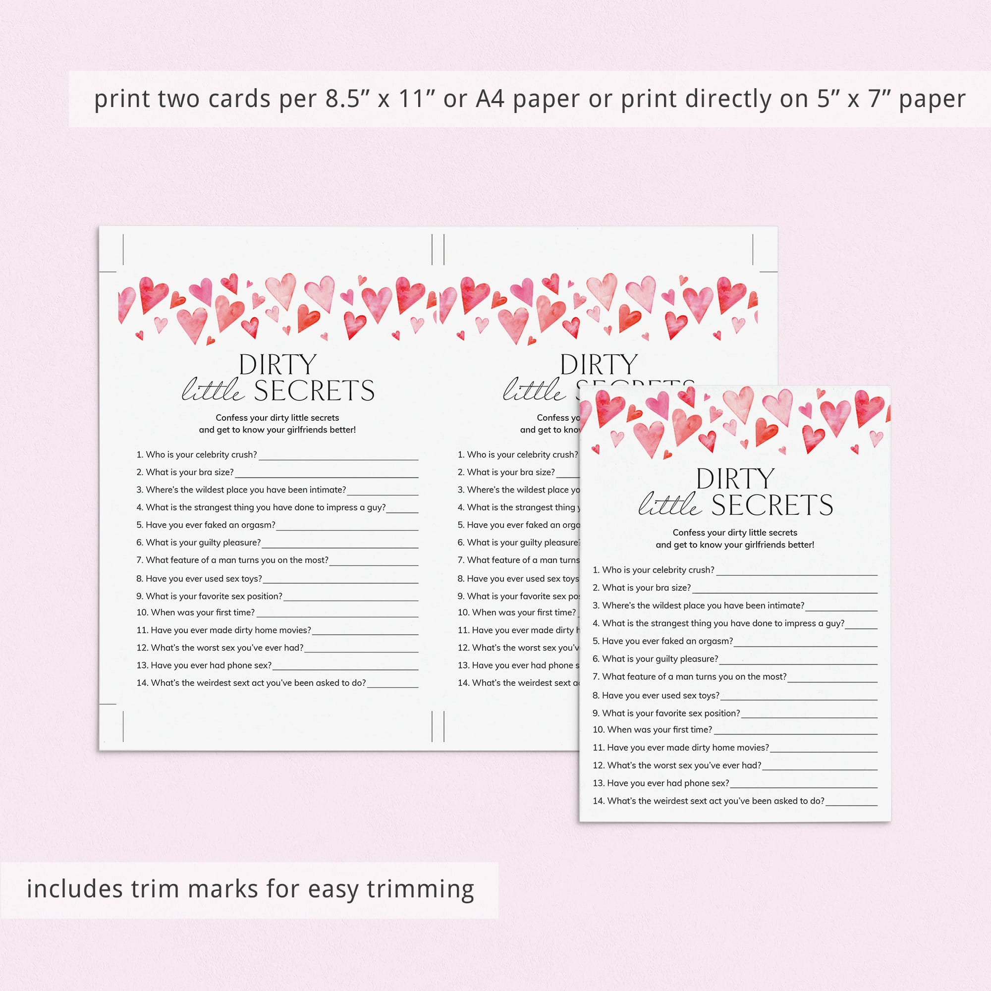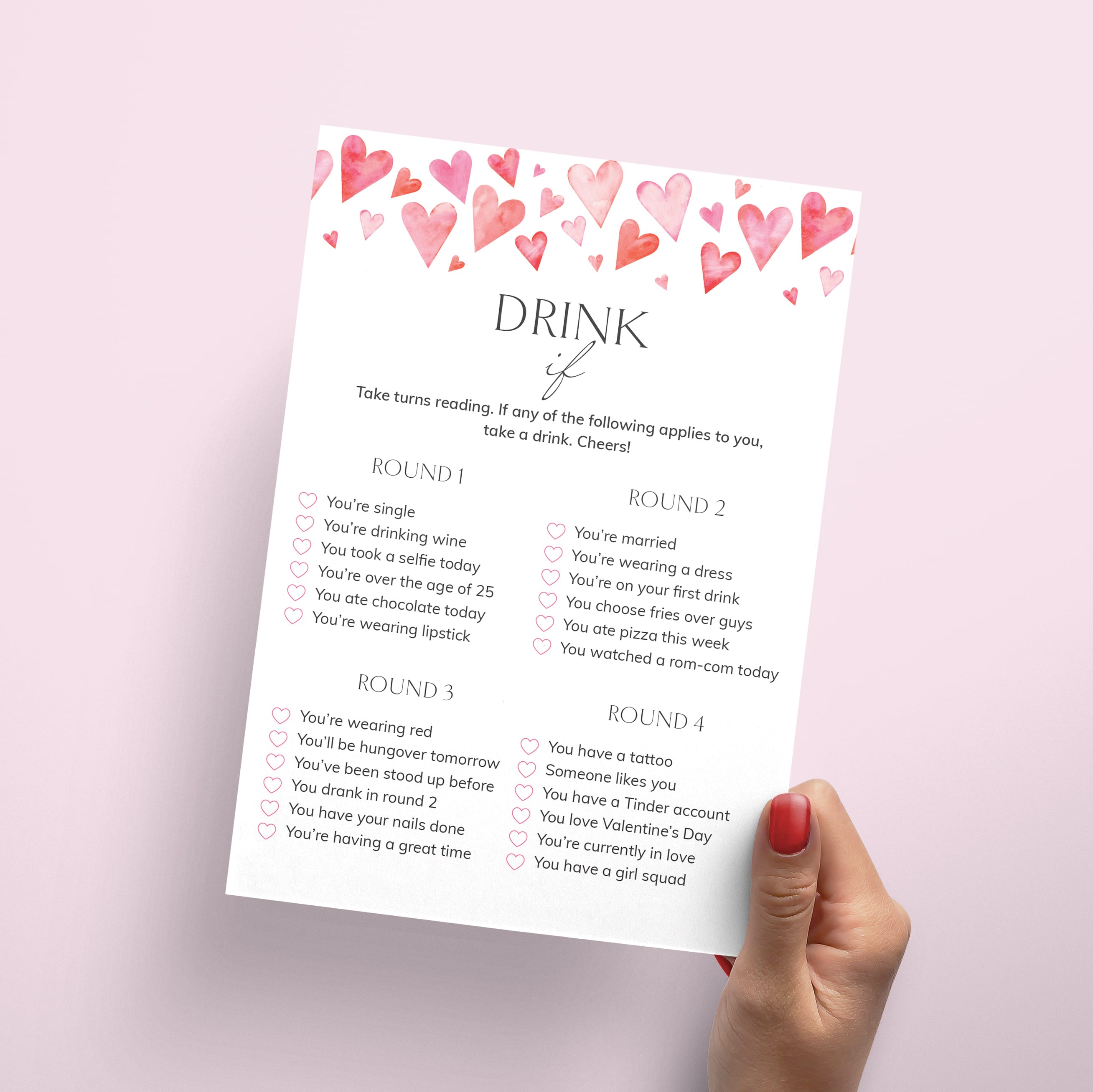 The games with watercolor pink hearts are a great addition to a Galentine's party with your lady friends. The bundle includes everything you need to entertain everyone with a variety of activities.