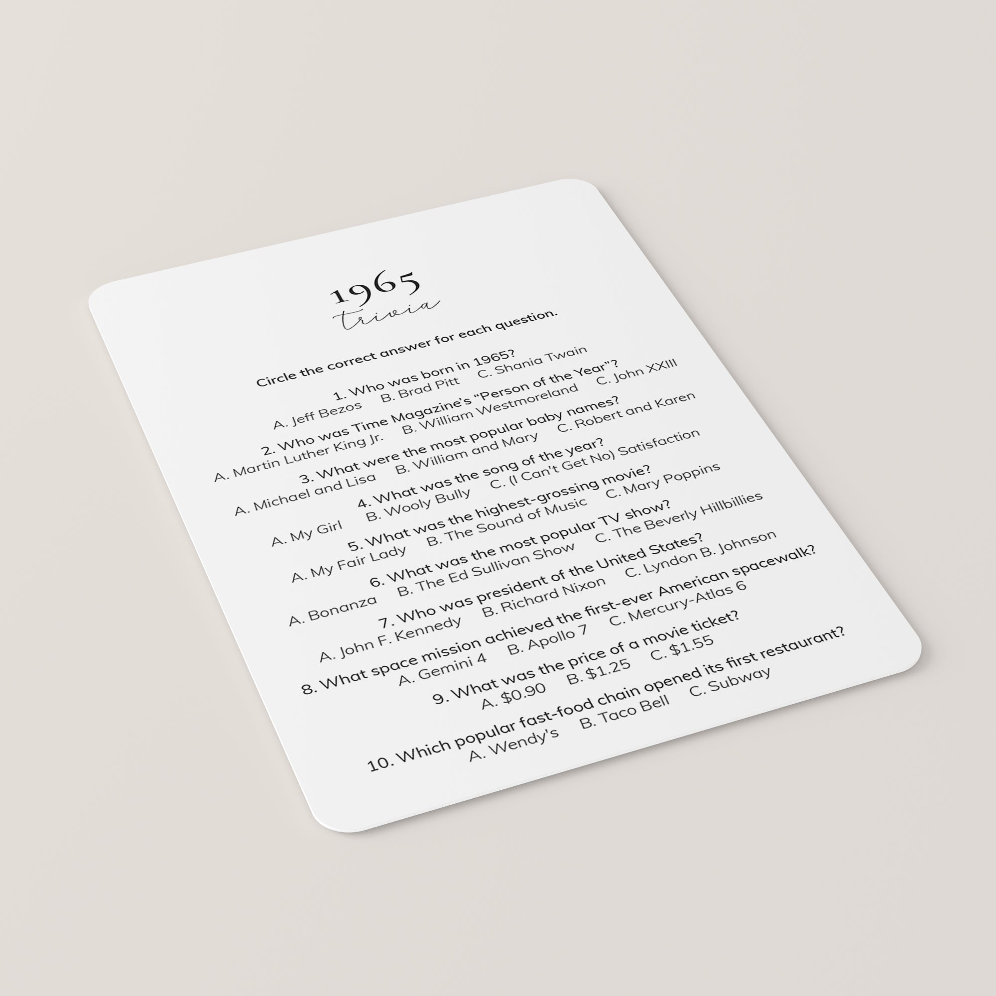 Are you looking for a fun quiz for a 60th birthday party or 60th anniversary? Look no further! This 1965 Quiz with 10 multiple choice questions is such a fun game to play with your friends and family. Test your guests how well they know 1965's pop culture. It's the perfect addition to a birthday bash for someone born in 1965 or to an anniversary party for a couple married in 1965.