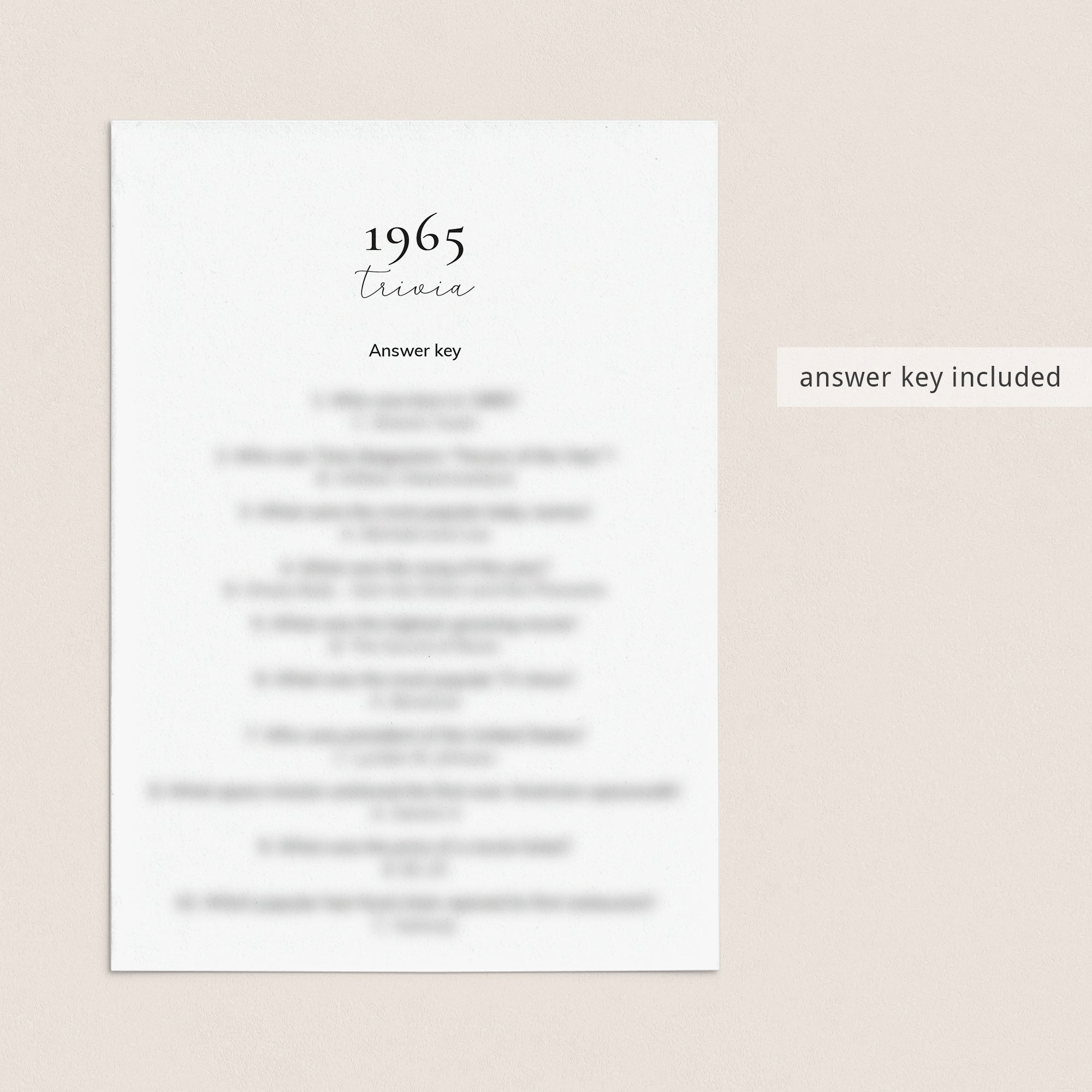 Just in case you are having trouble figuring out the answers, an answer key with the year 1965 quiz answers is included.