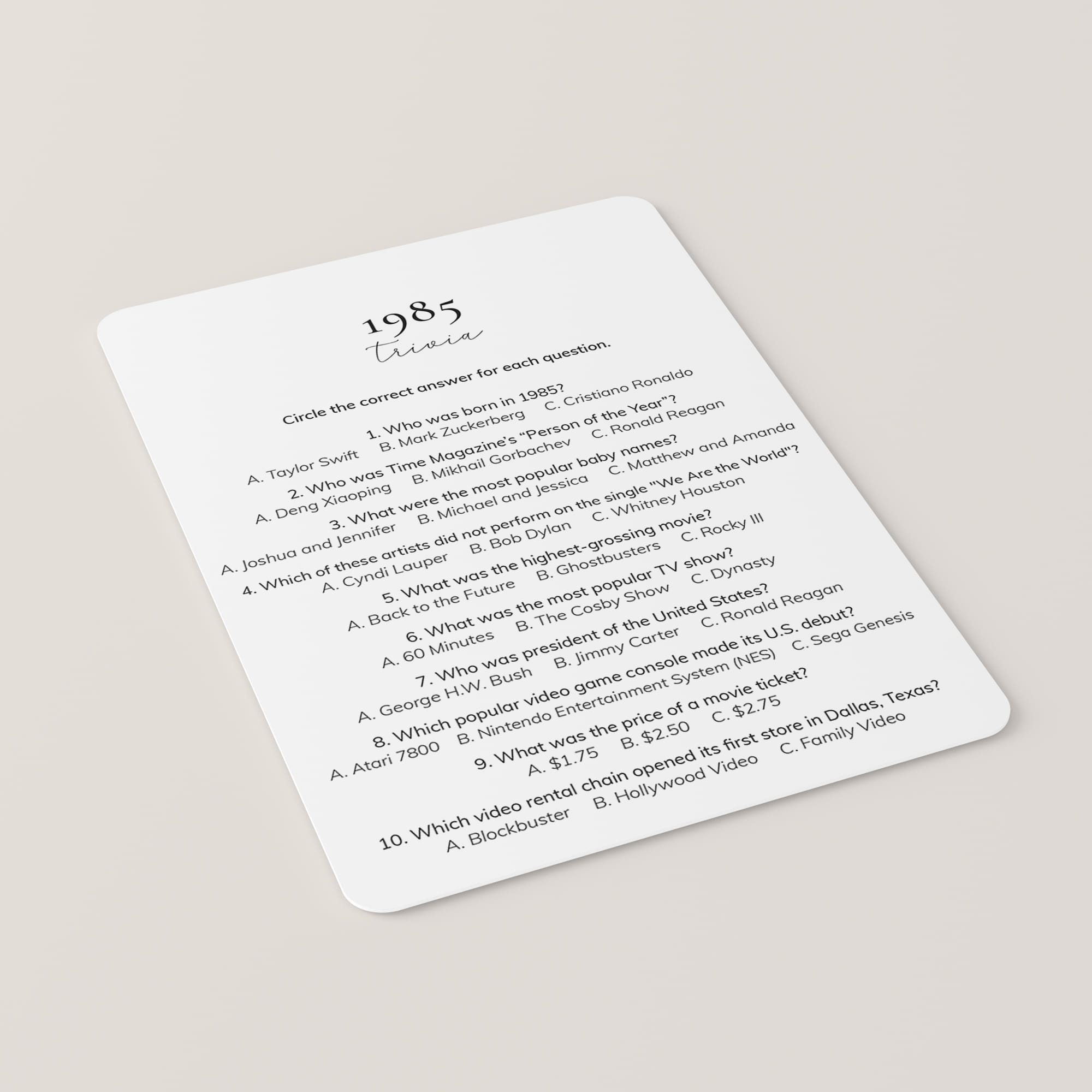 Are you looking for a fun quiz for a 40th birthday party or 40th anniversary? Look no further! This 1985 Quiz with 10 multiple choice questions is such a fun game to play with your friends and family. Test your guests how well they know 1985's pop culture. It's the perfect addition to a birthday bash for someone born in 1985 or to an anniversary party for a couple married in 1985.