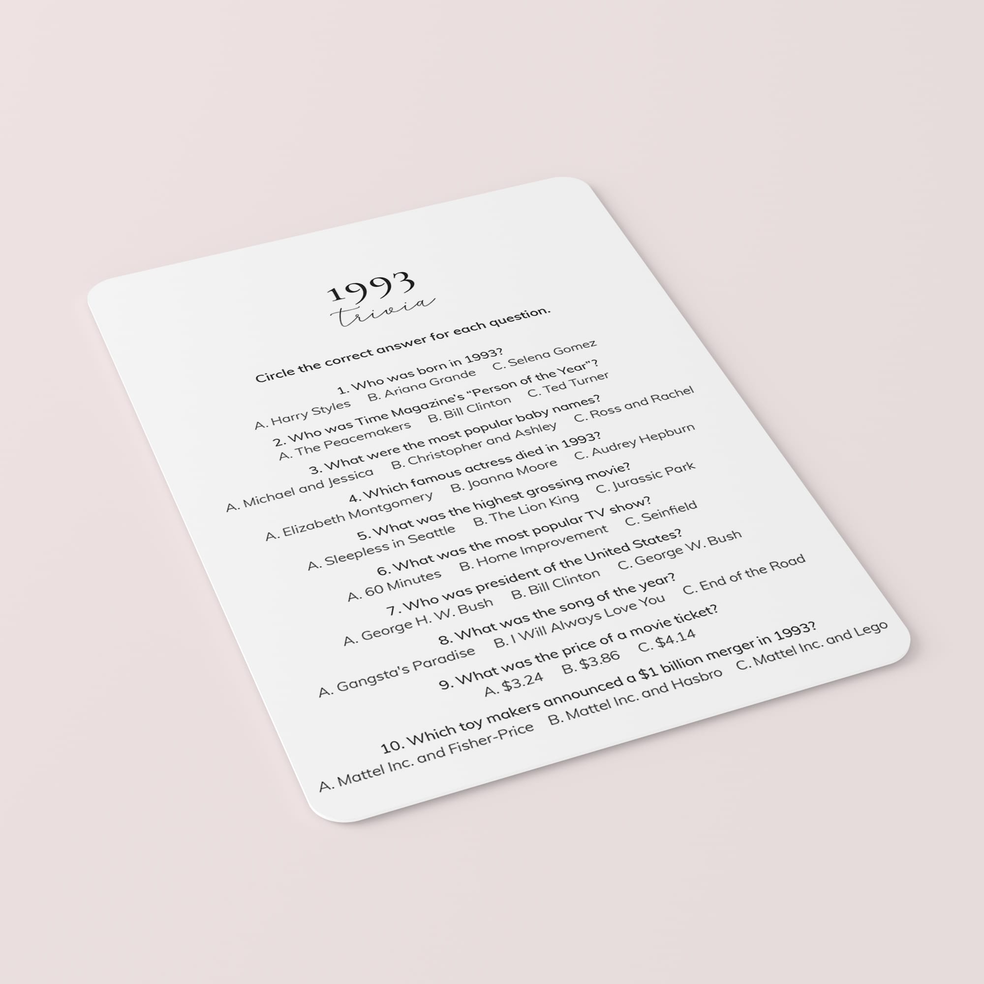 Are you looking for a fun quiz for a 32nd birthday party or 32nd anniversary? Look no further! This 1993 Quiz is such a fun game to play with your friends and family. Test your guests how well they know 1993's pop culture. It's the perfect addition to a birthday bash for someone born in 1993 or to an anniversary party for a couple married in 1993.