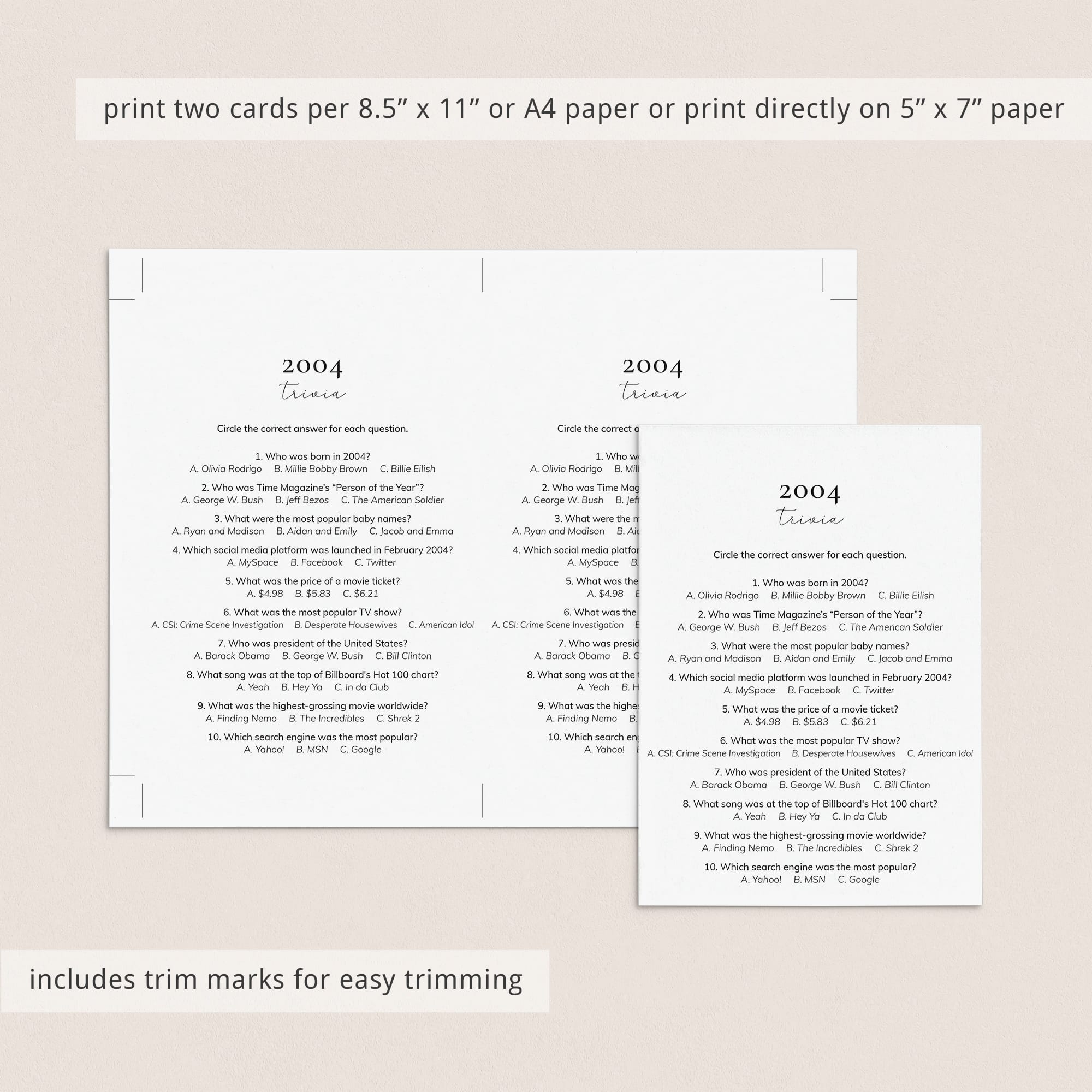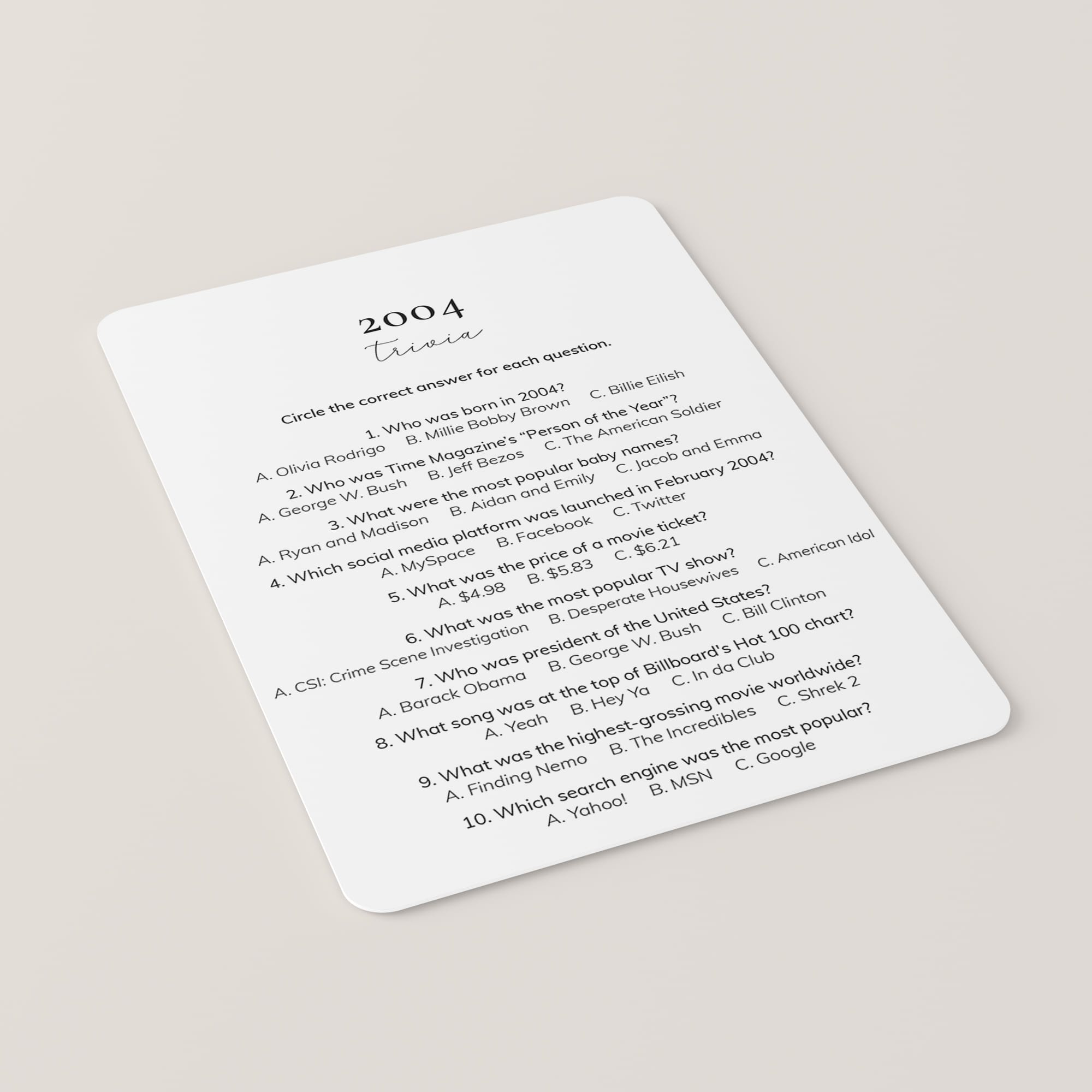 Are you looking for a fun quiz for a 21st birthday party? Look no further! This 2004 Quiz with 10 multiple choice questions is such a fun game to play with your friends and family. Test your guests how well they know 2004's pop culture. It's the perfect addition to a birthday bash for someone born in 2004.