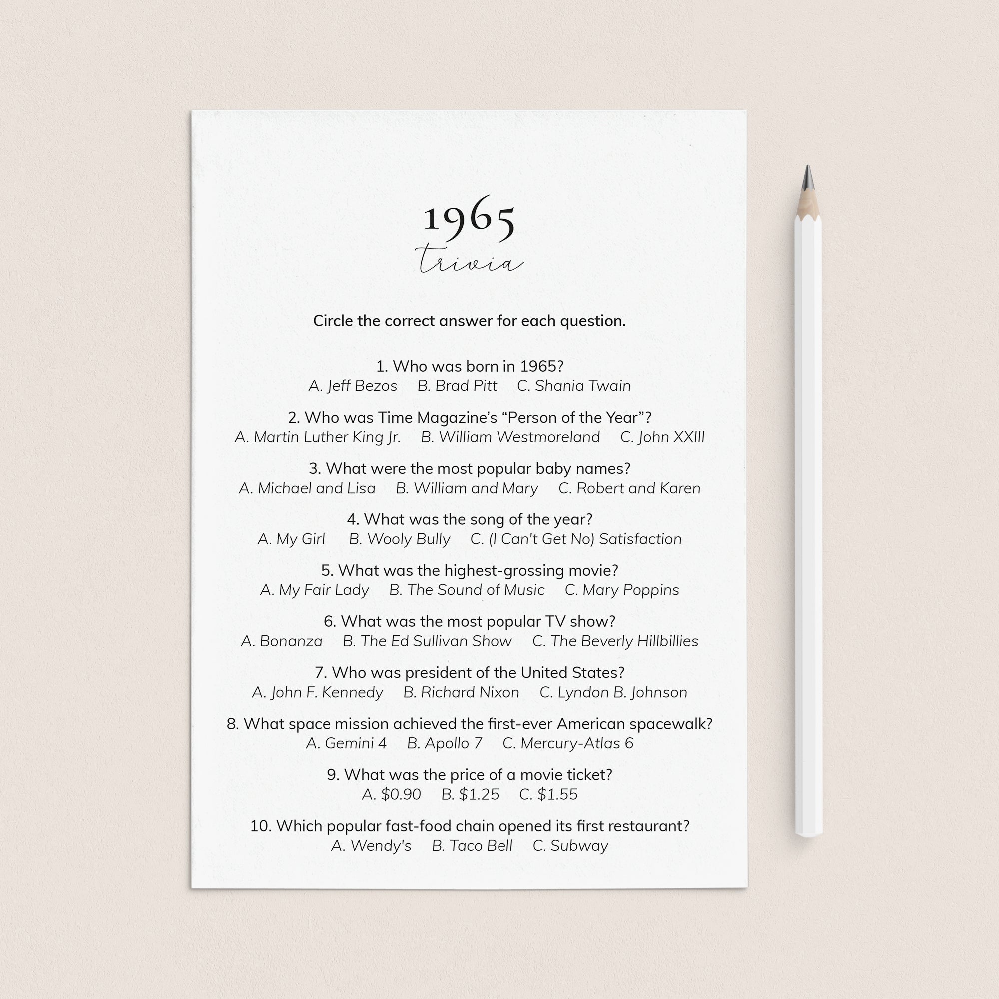Celebrate a couple married in 1965 with this 60th Wedding Anniversary Games Bundle. Designed with an elegant and minimalist style, this printable bundle includes 12 fun and meaningful games and activities, from nostalgic 1965s trivia quizzes to heartfelt wishes cards and keepsakes. Perfect for adding a special touch to this incredible milestone anniversary.