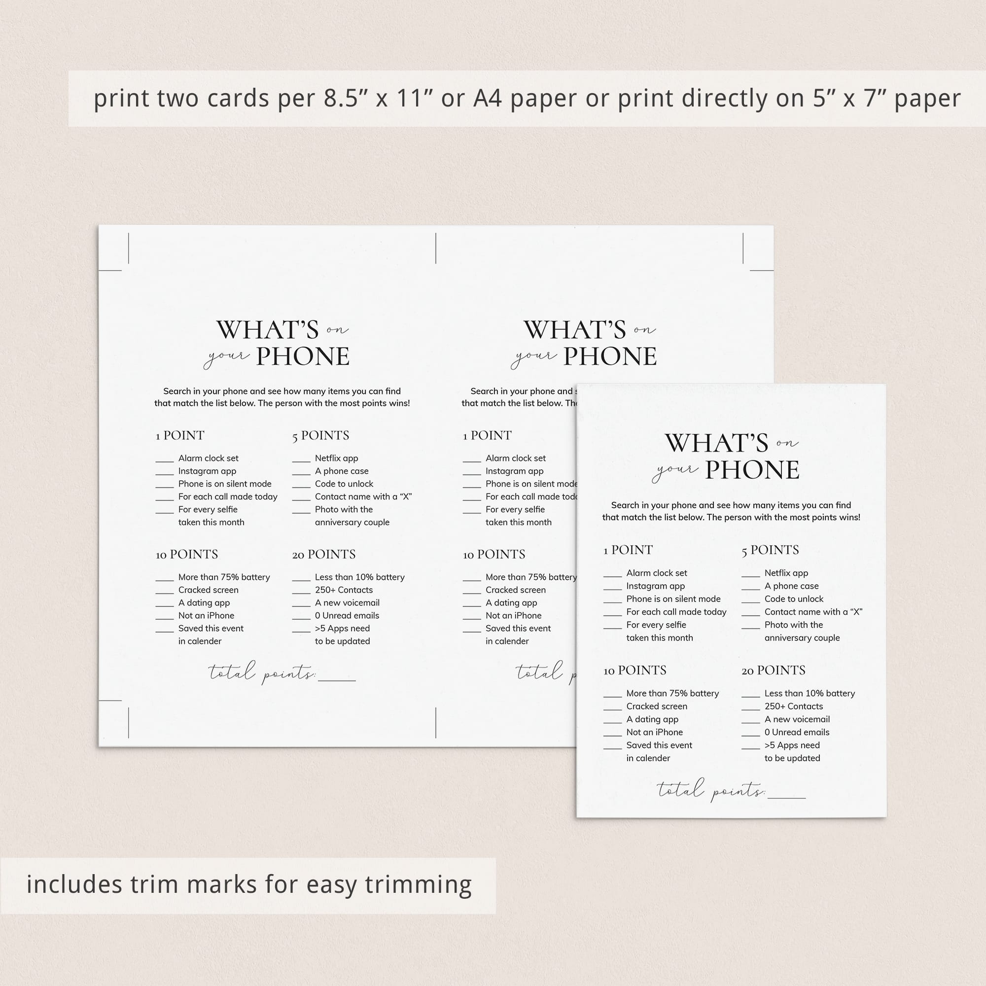 Most guests show up to an anniversary party with just their phone and a smile. Sound familiar? Then this anniversary edition of What’s On Your Phone is the perfect icebreaker! A modern twist on the classic What’s In Your Purse, this game is easy to play and guaranteed to get everyone laughing.