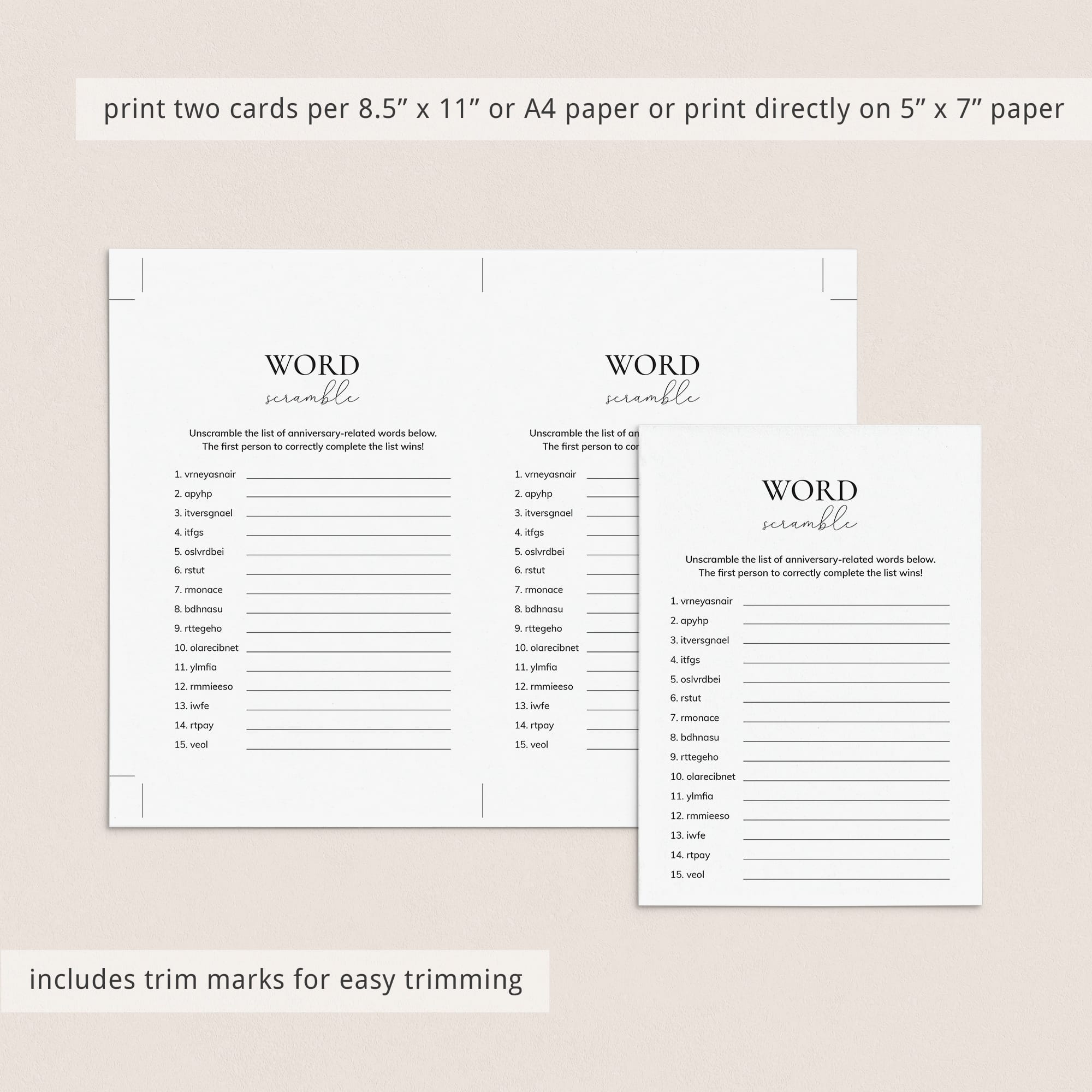 To play this game simply pass out a copy face down to your guests. When all sheets are handed out, have everyone turn their paper over and try to unscramble the anniversary-related words. The first person to unscramble all of the words wins. Be sure to have a prize on hand for the winner!