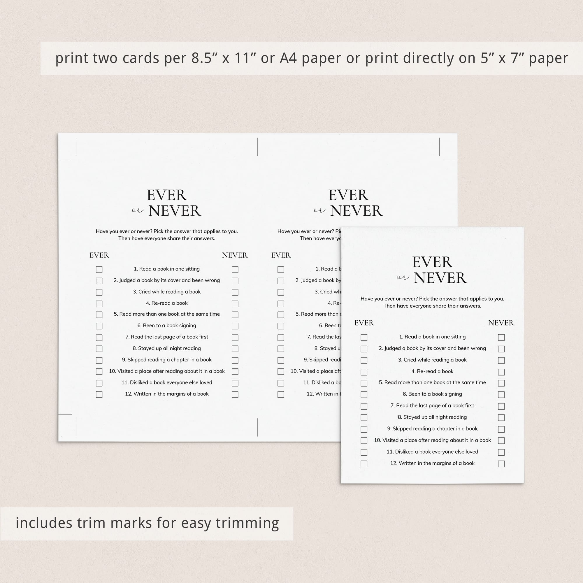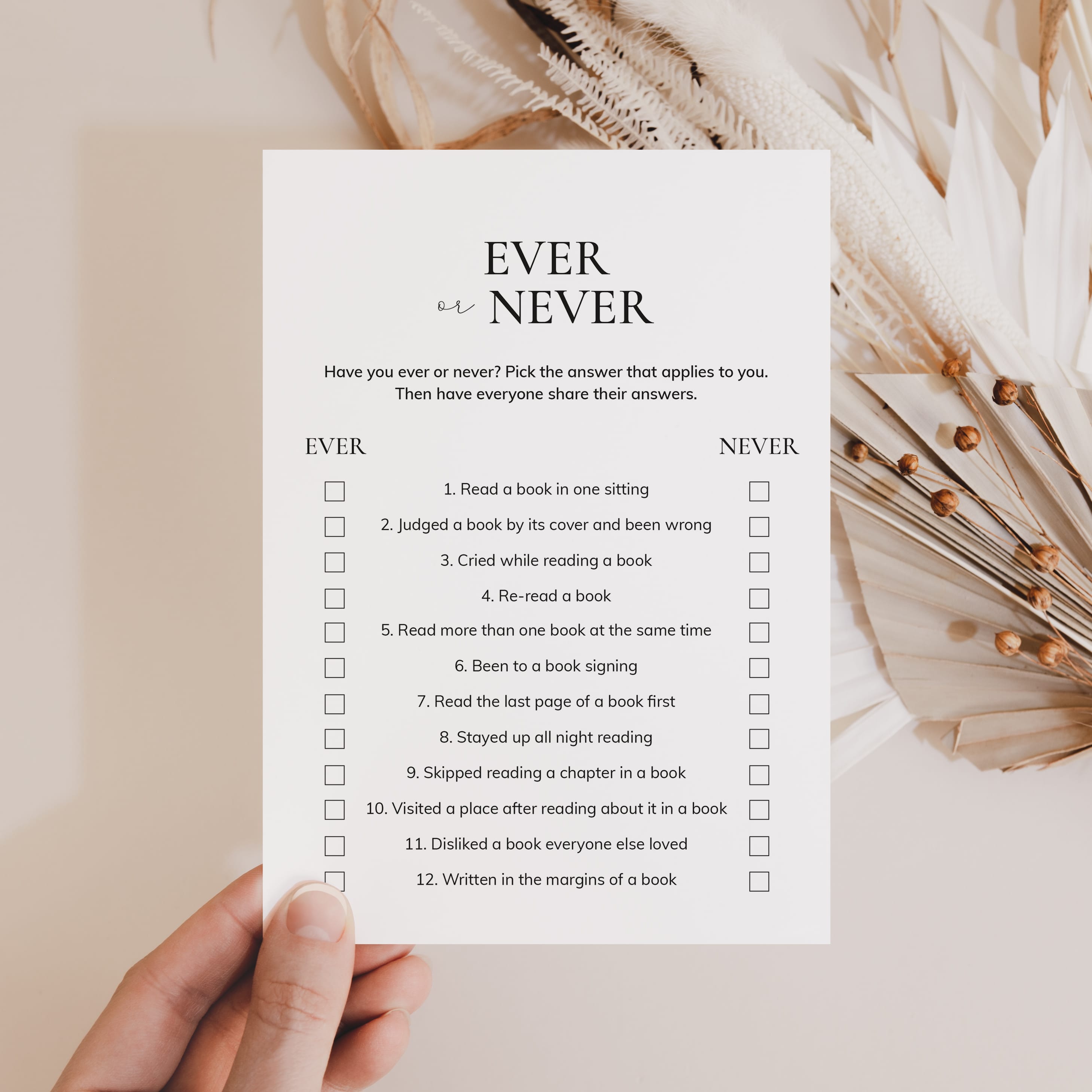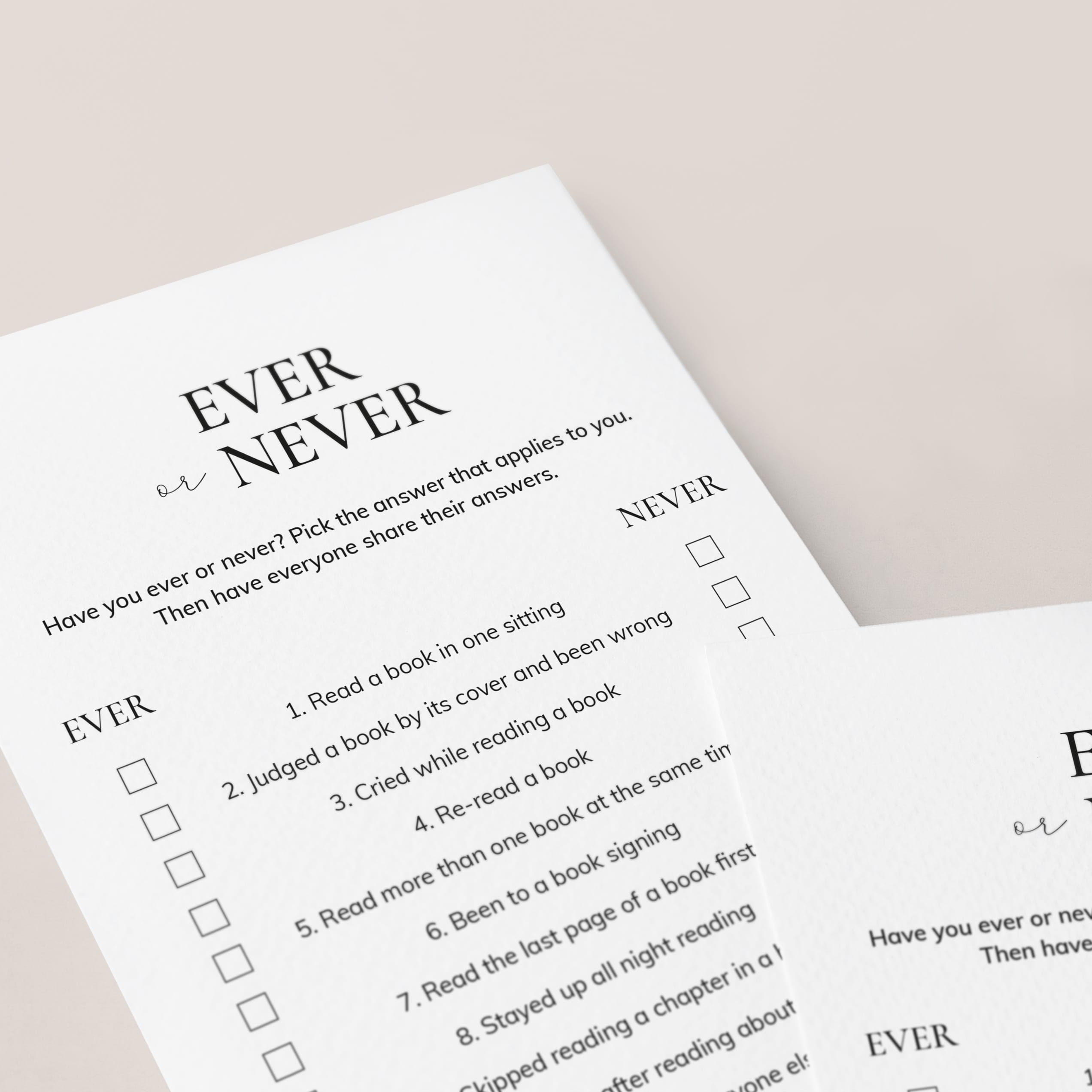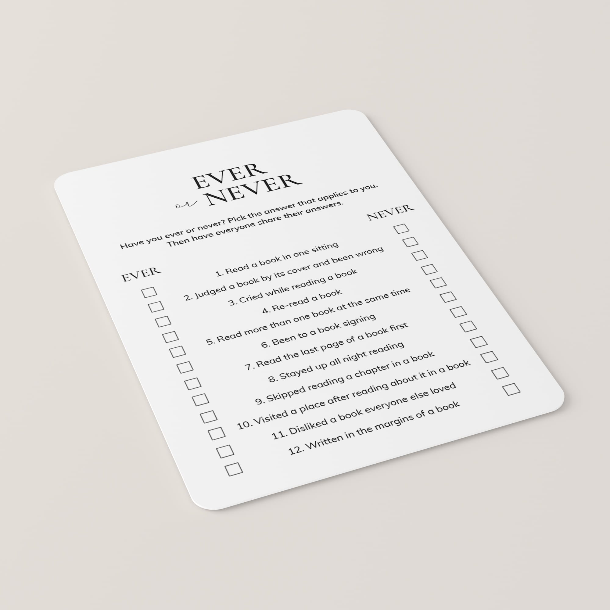 Here’s how it works: each guest fills out the Ever or Never game card by checking off the experiences they’ve had. Then, share your answers with the group and see what you discover! Have you ever read a book in one sitting, been to a book signing or read the last page of a book first? The results are always entertaining and often unexpected.