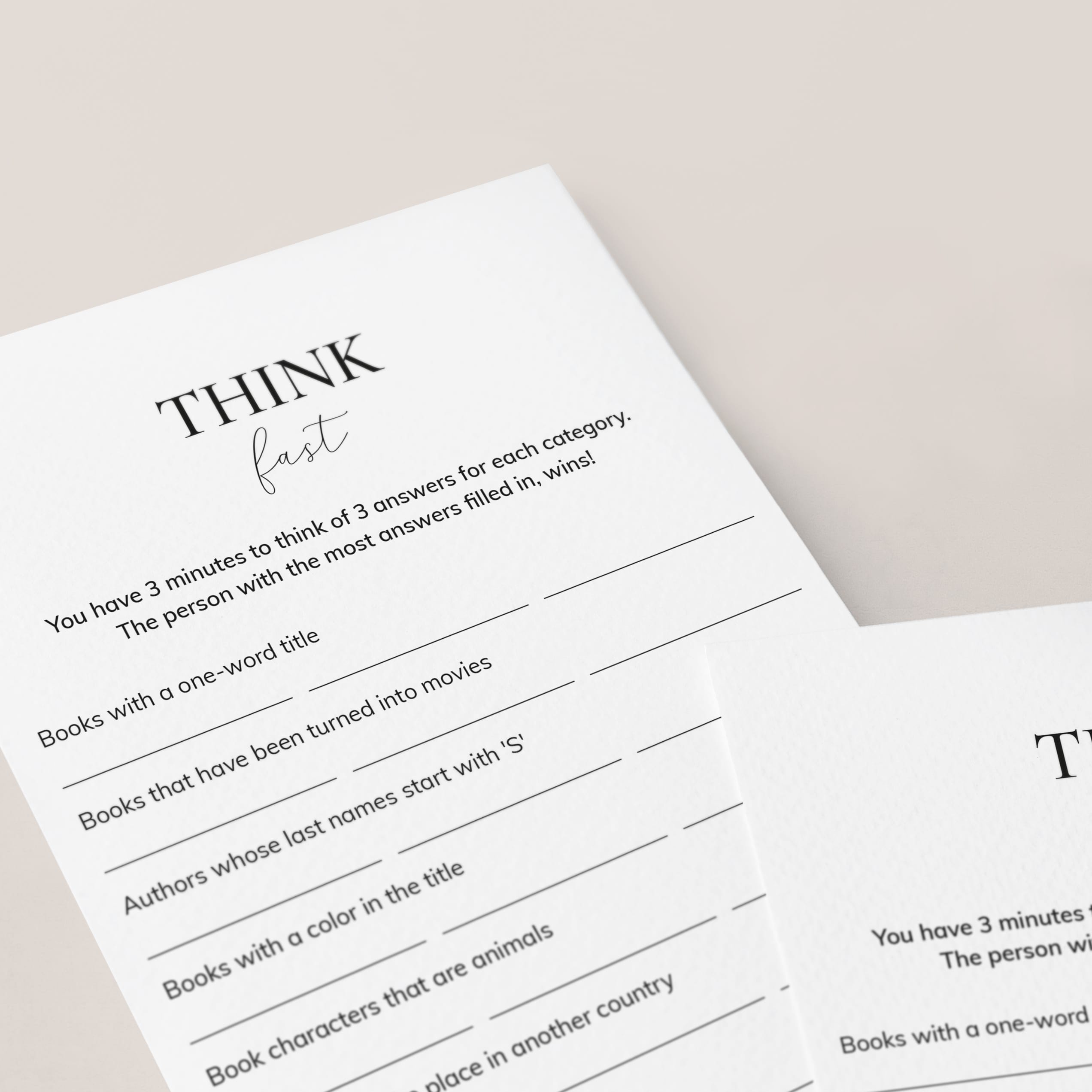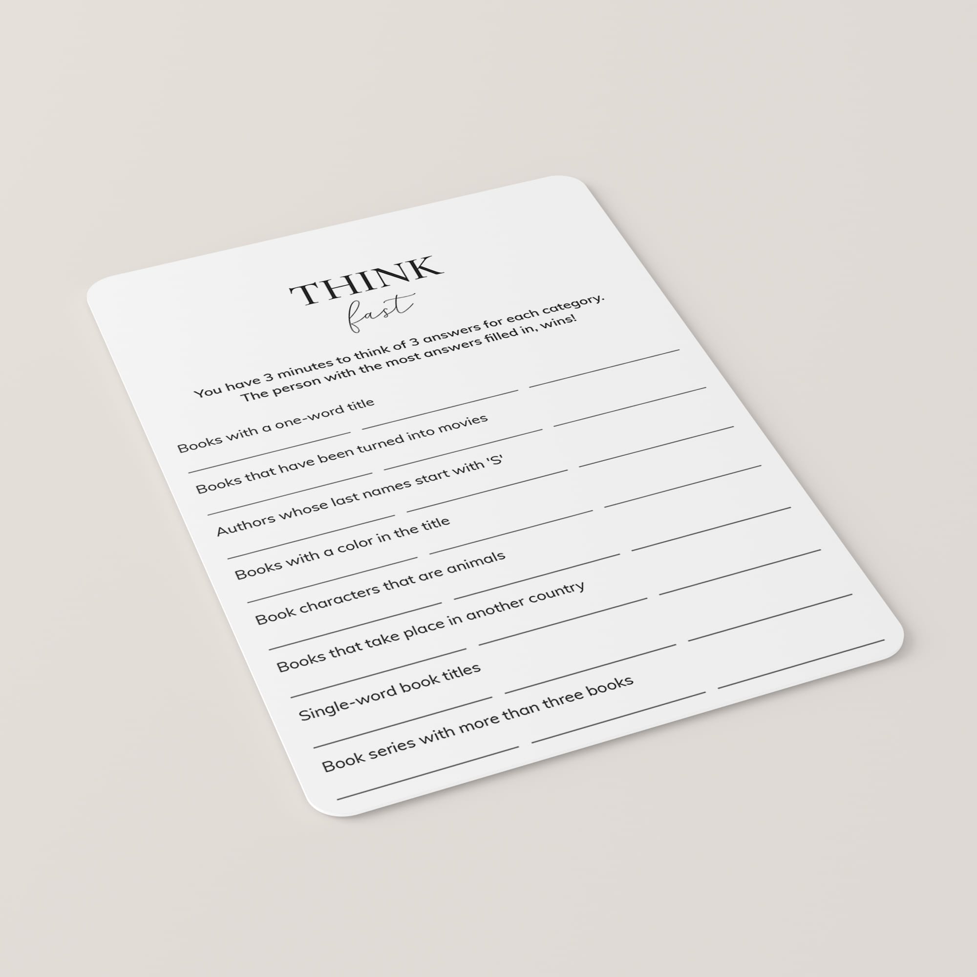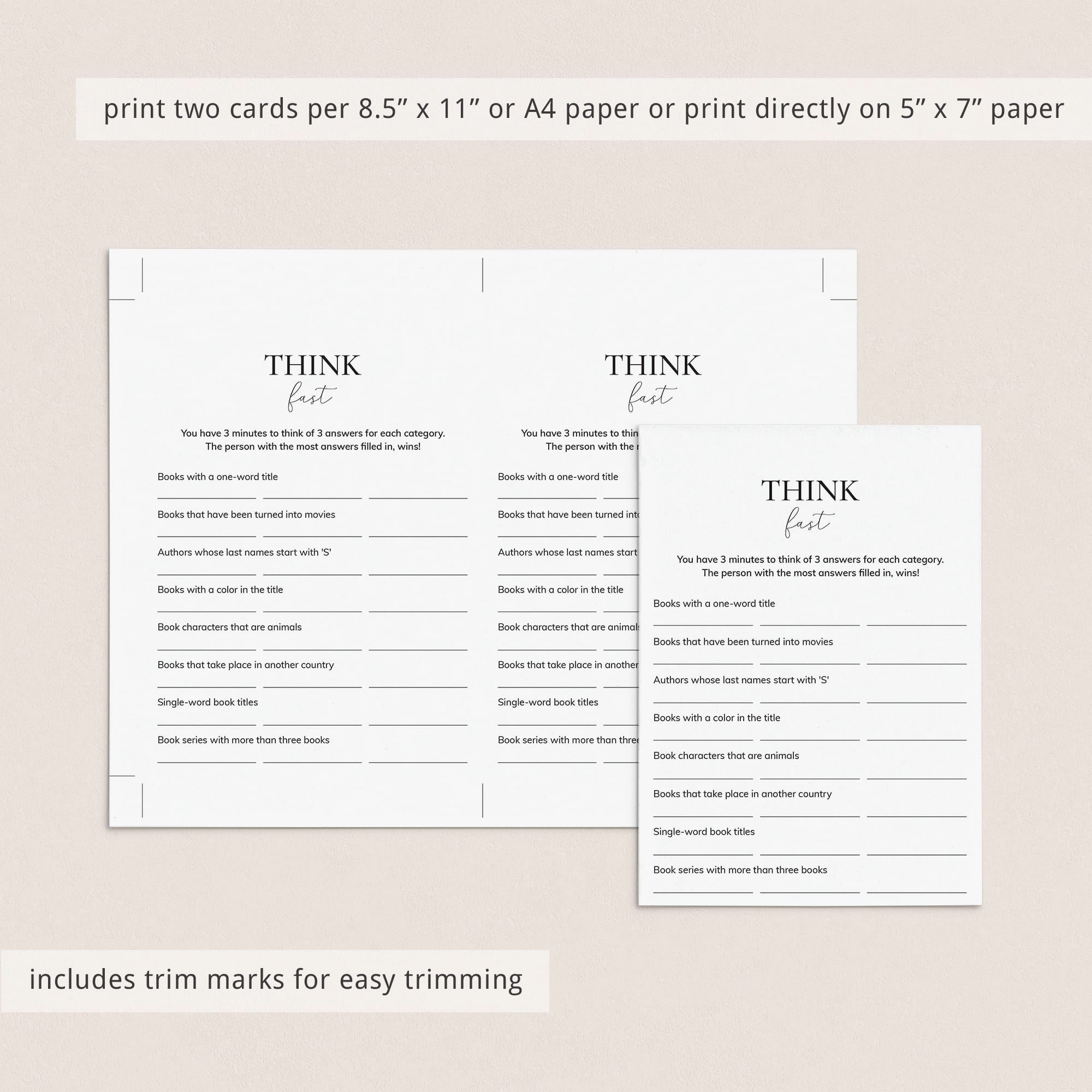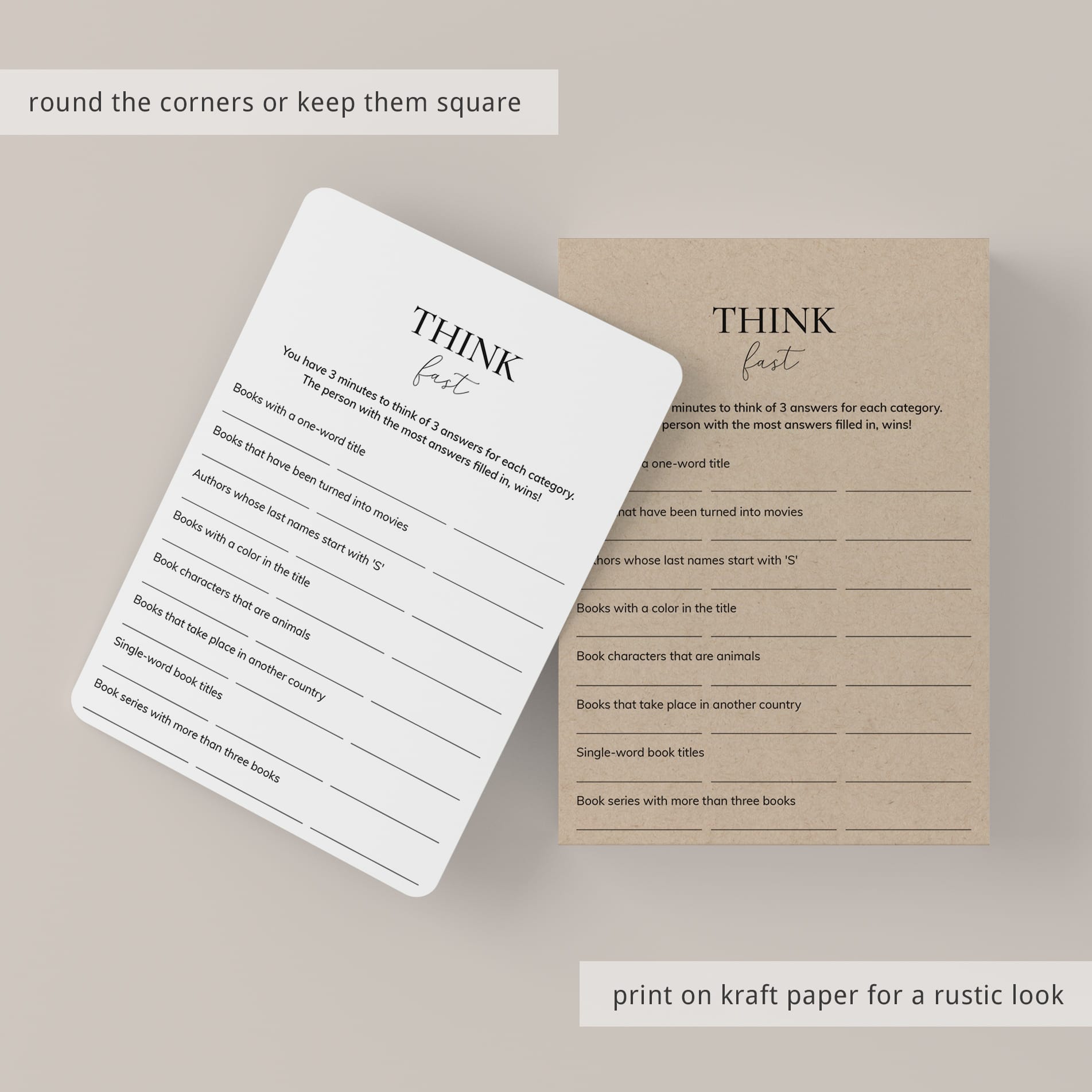 This printable Book Club Think Fast game is an instant download. After purchase you will receive a download link immediately on screen. Also within minutes of your order and payment, an e-mail will be sent to you with a link for your download.