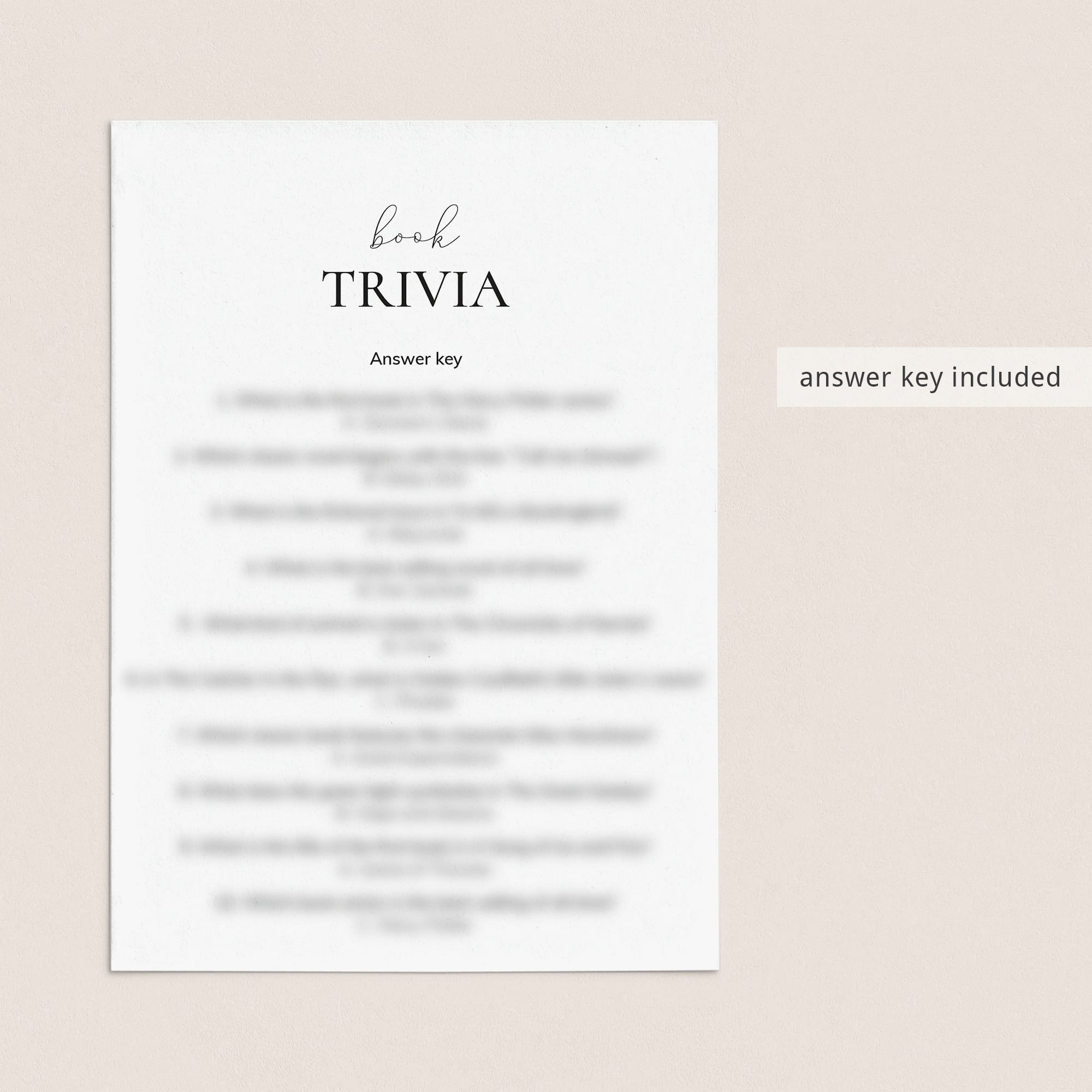 This Book Trivia is an instant download. After purchase you will receive a download link immediately on screen. Also within minutes of your order and payment, an e-mail will be sent to you with a link for your download.