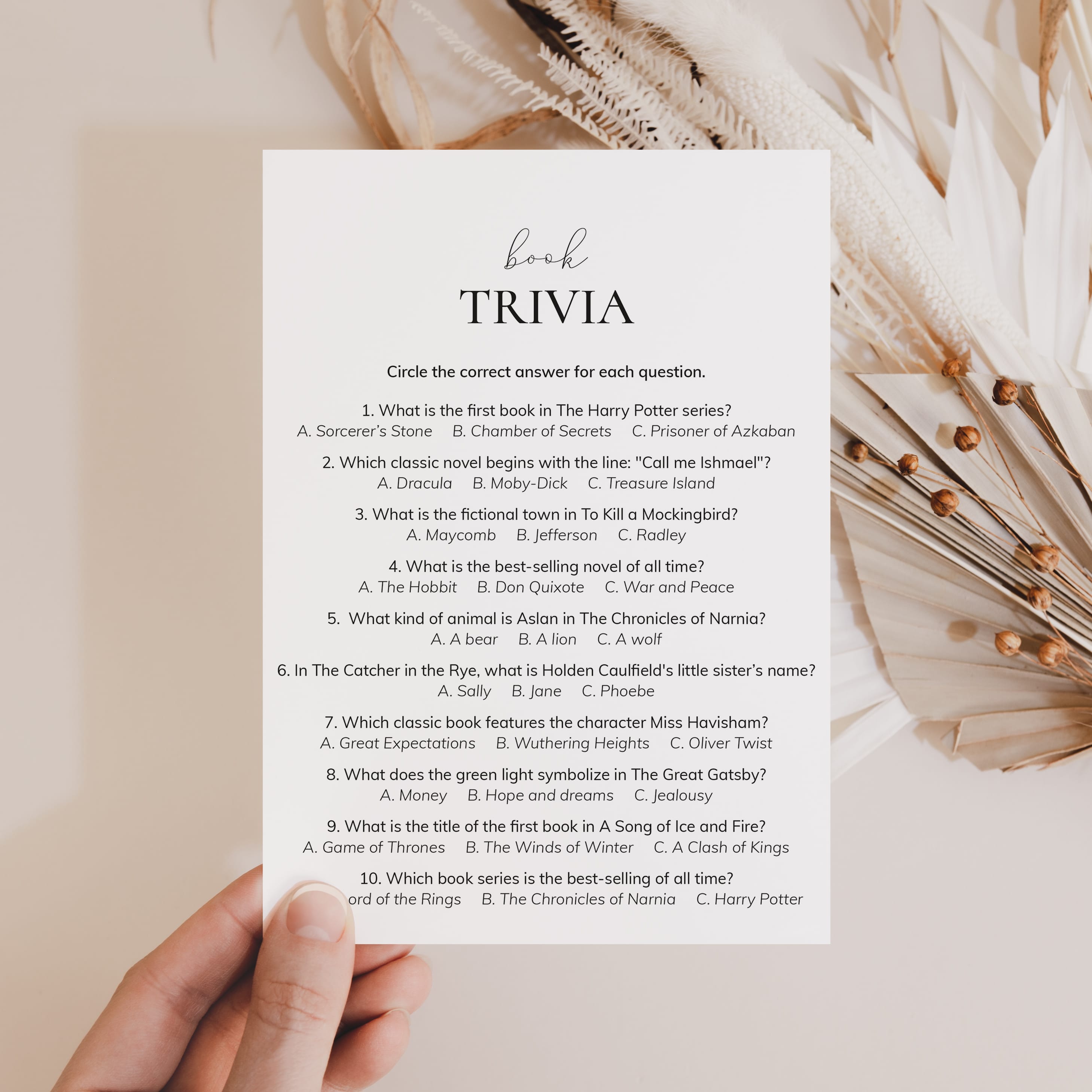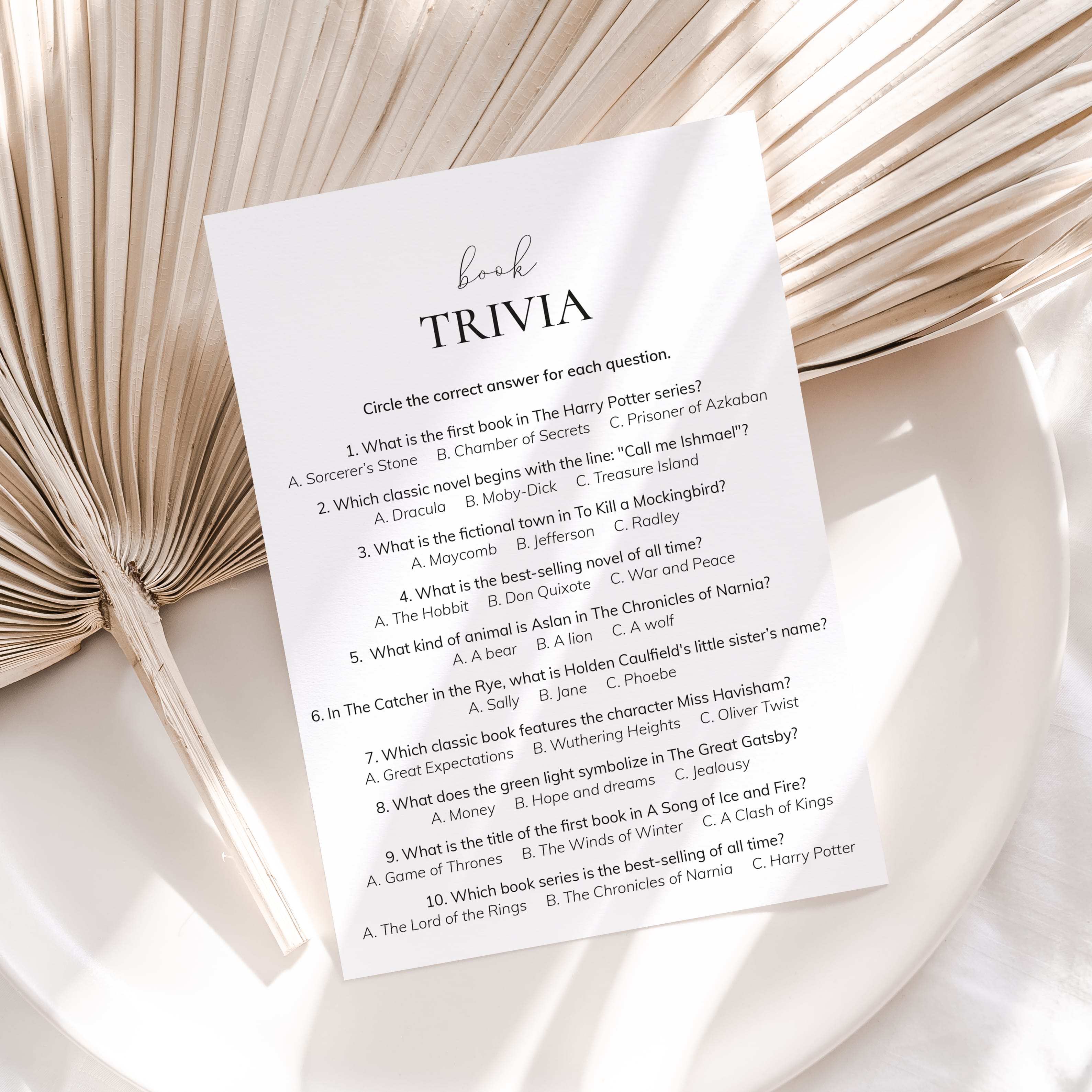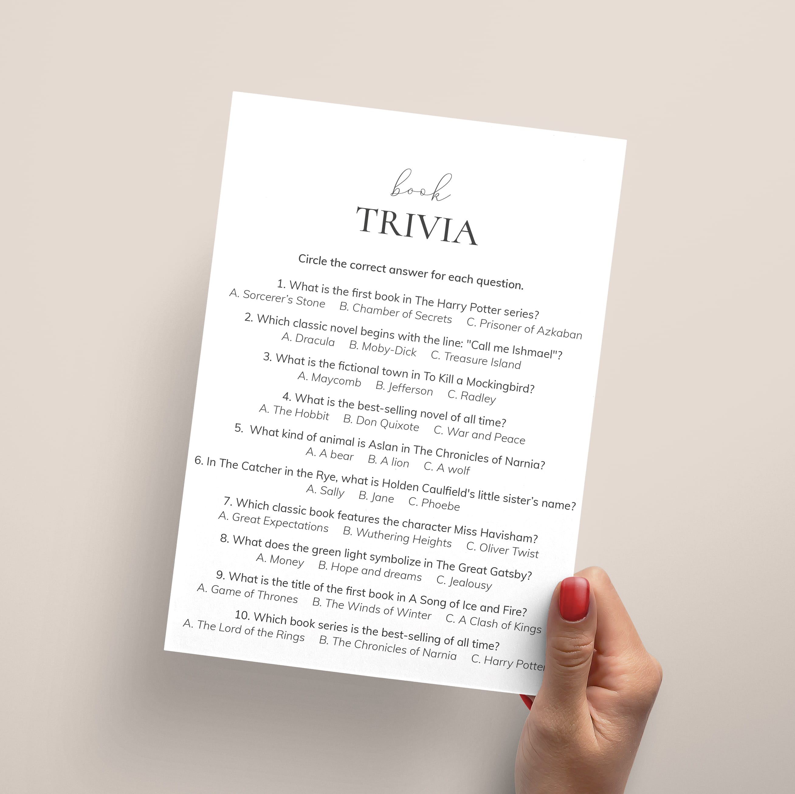 Challenge your literary knowledge with this fun Book Trivia quiz! Perfect for a Reading Group, Book Club meeting, or Book Party, this printable game includes 10 multiple-choice questions designed to test your knowledge of beloved books and authors.